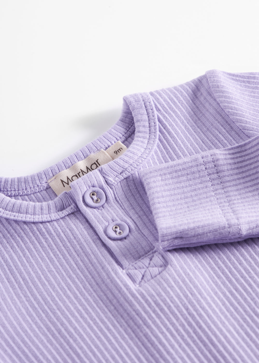 Lilla ribstrikket babybody med lange ærmer, stolpe knaplukning og trykknapper mellem benene