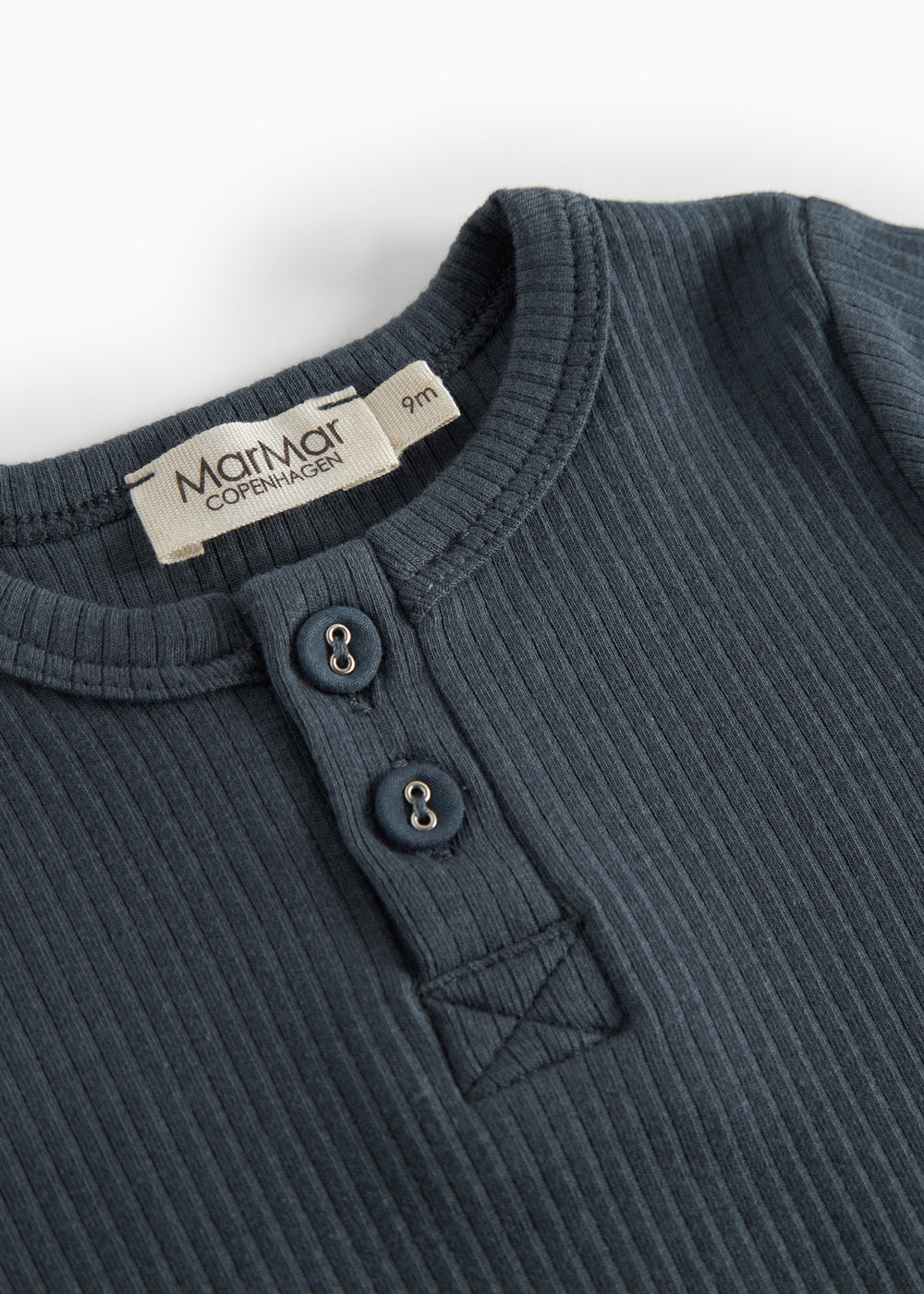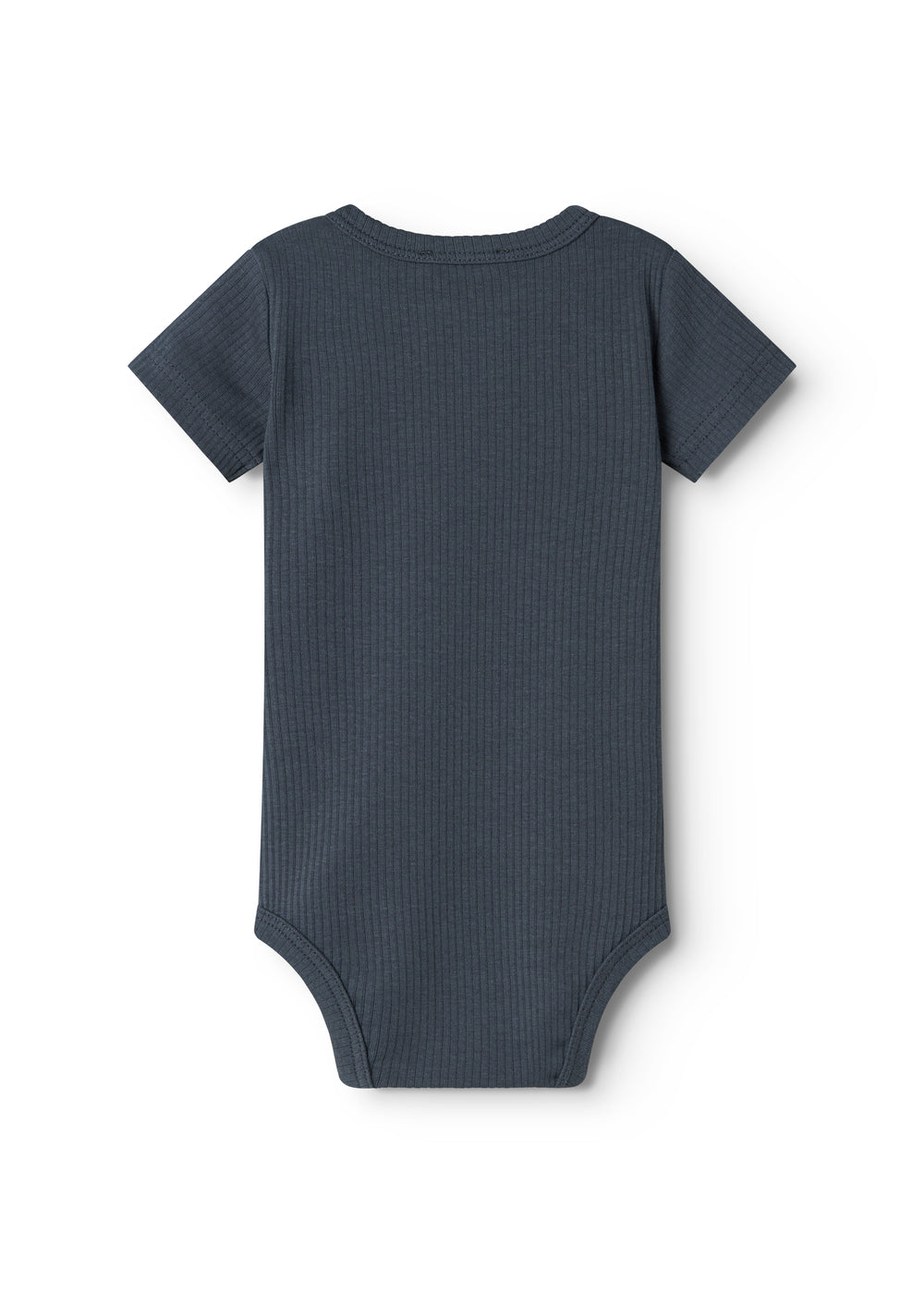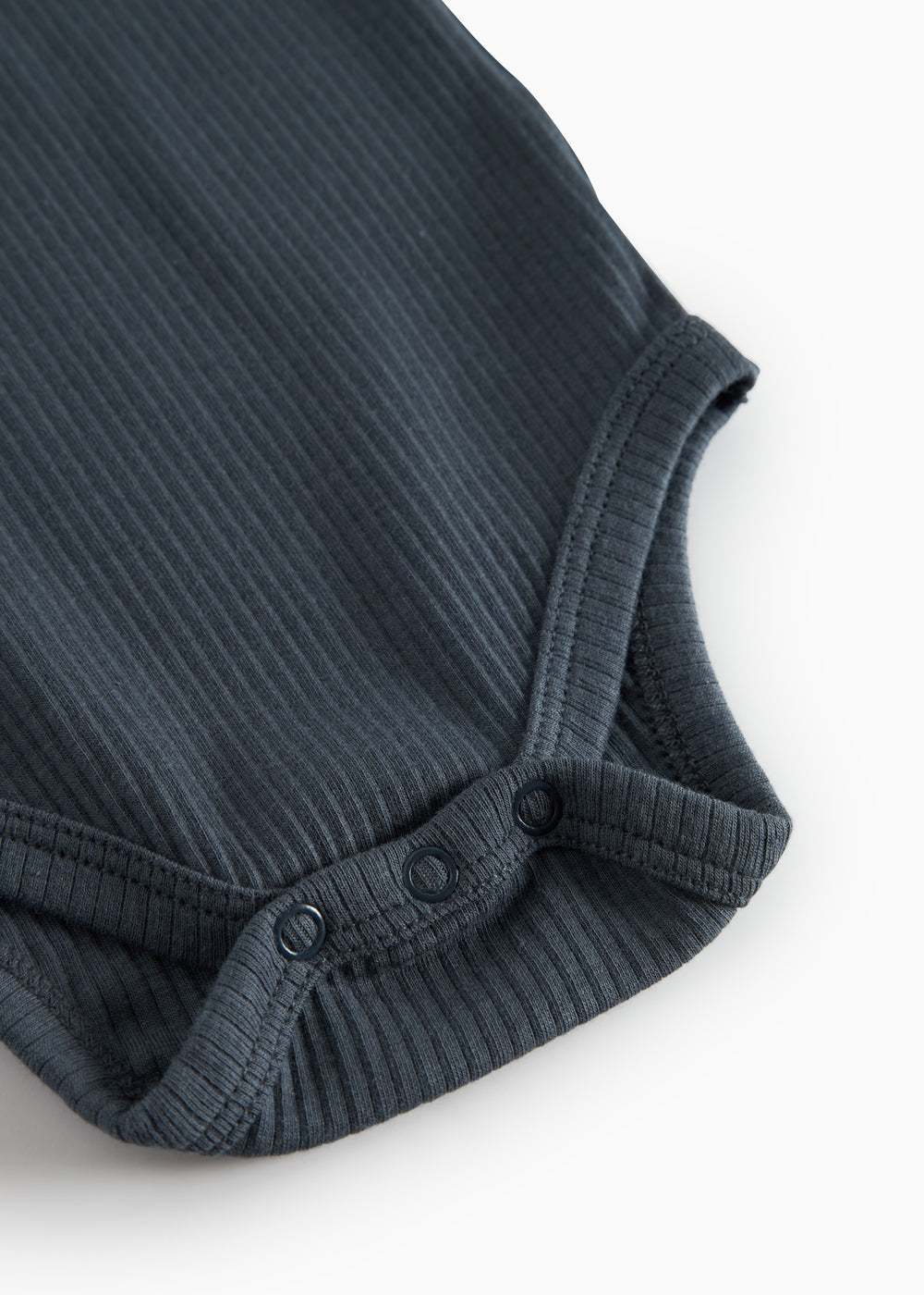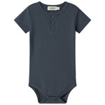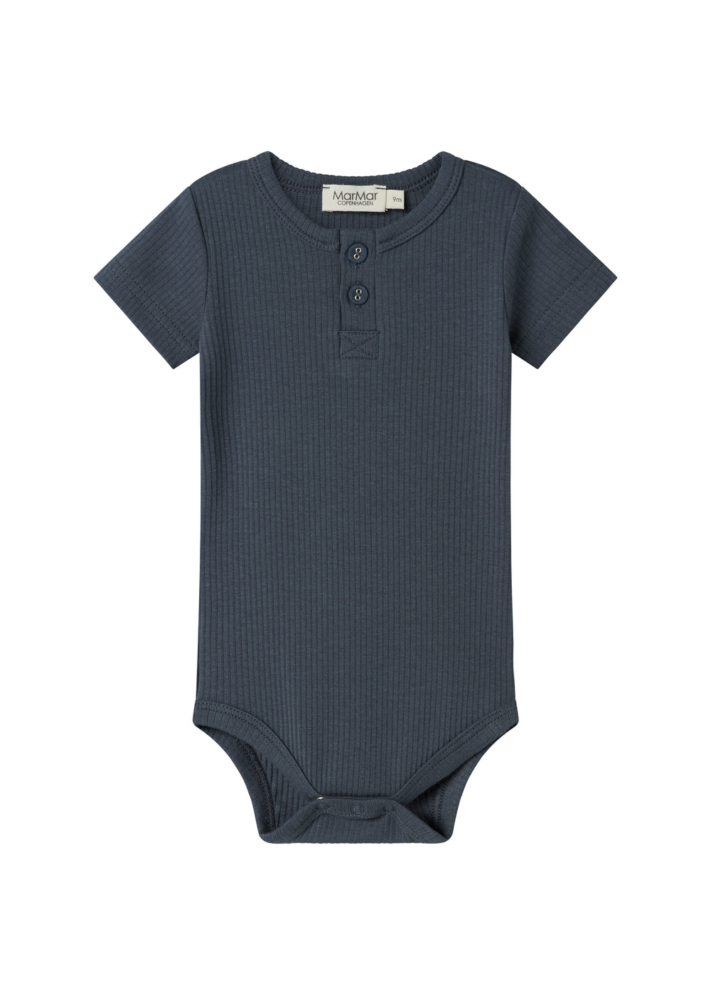 Short-sleeved baby modal bodystocking with placket button closure that is closed with snaps between the legs for easy diaper changes.