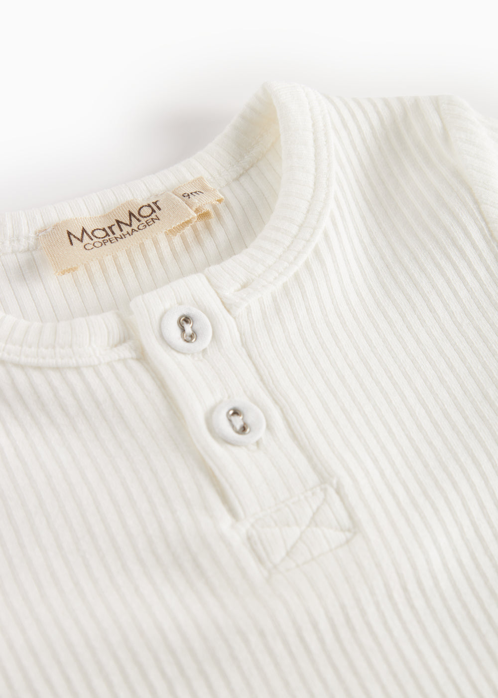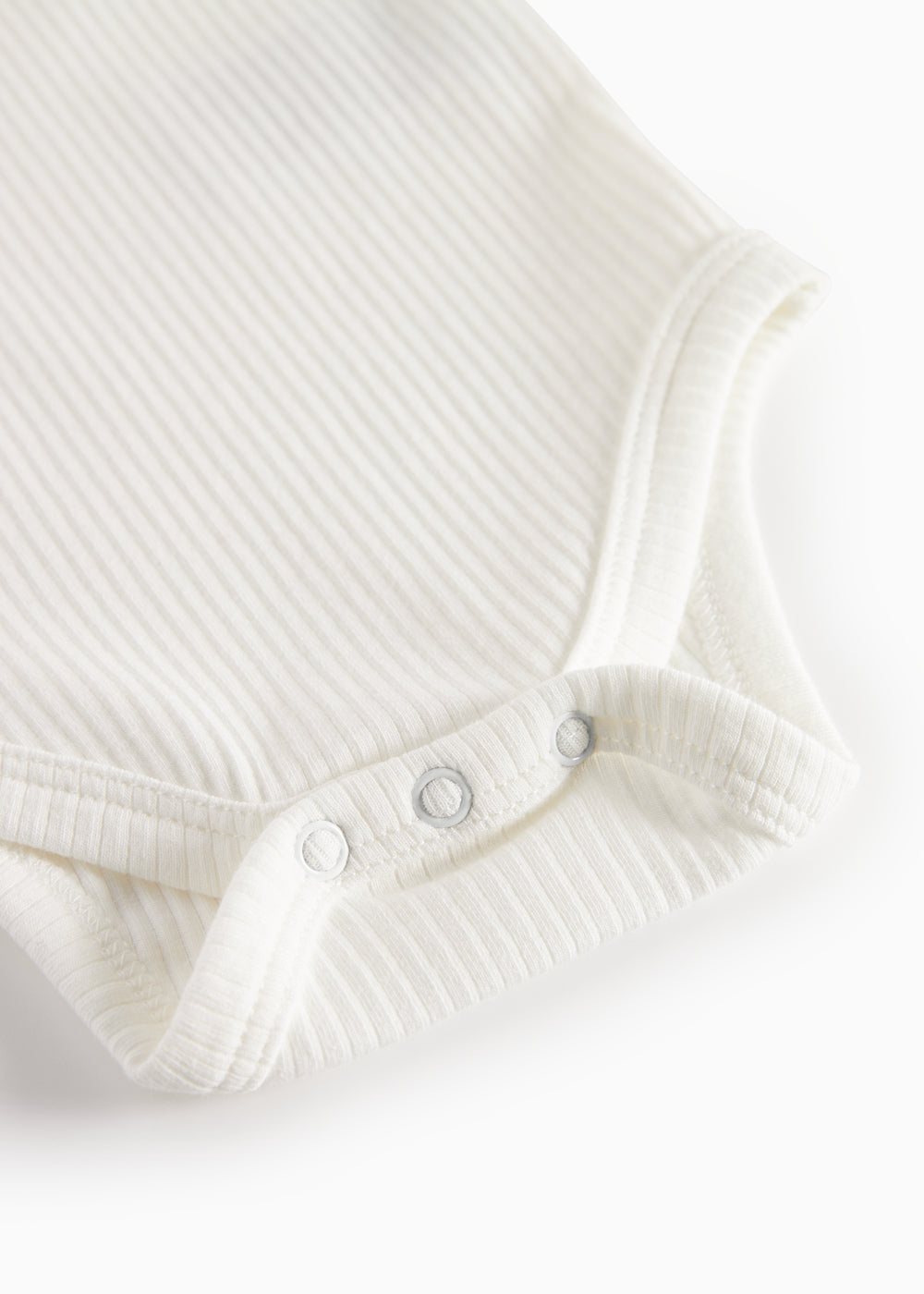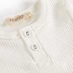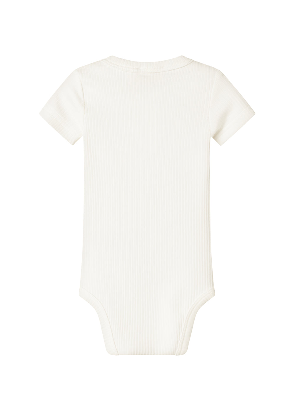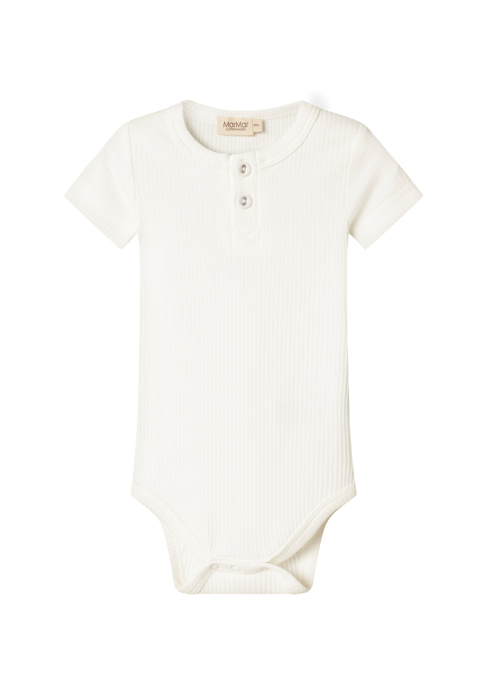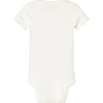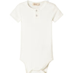 Short-sleeved baby modal bodystocking with placket button closure that is closed with snaps between the legs for easy diaper changes.