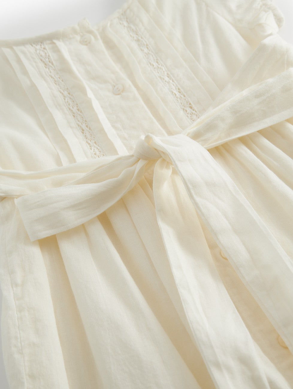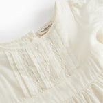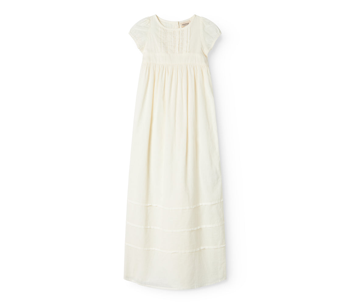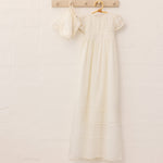 The dress is in the color Cloud, an antique white shade. This carefully chosen color gives the dress a vintage-inspired look, reminiscent of a christening gown passed down through generations.