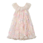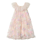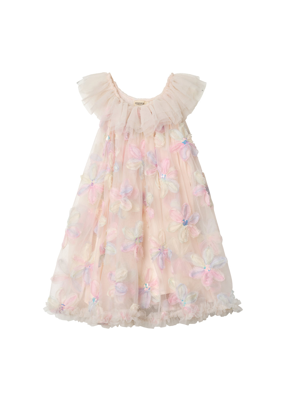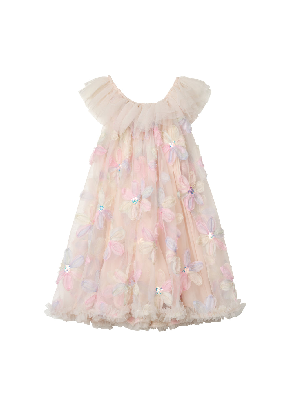 Delicate dress for children made of light and transparent tulle material, decorated with large, colorful flower applications in pastel shades. Each flower has a sparkling sequin detail in the middle, which adds a festive touch. The dress has a soft gathered edge at the neckline, which creates a slightly voluminous effect. The dress is finished with a fine tulle ruffle edge, which adds extra elegance. This dress is perfect for special occasions such as birthdays or festive events and gives a dreamy and fairytale atmosphere. The length of the dress goes just below the knee
