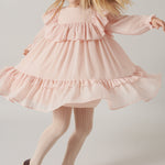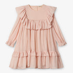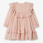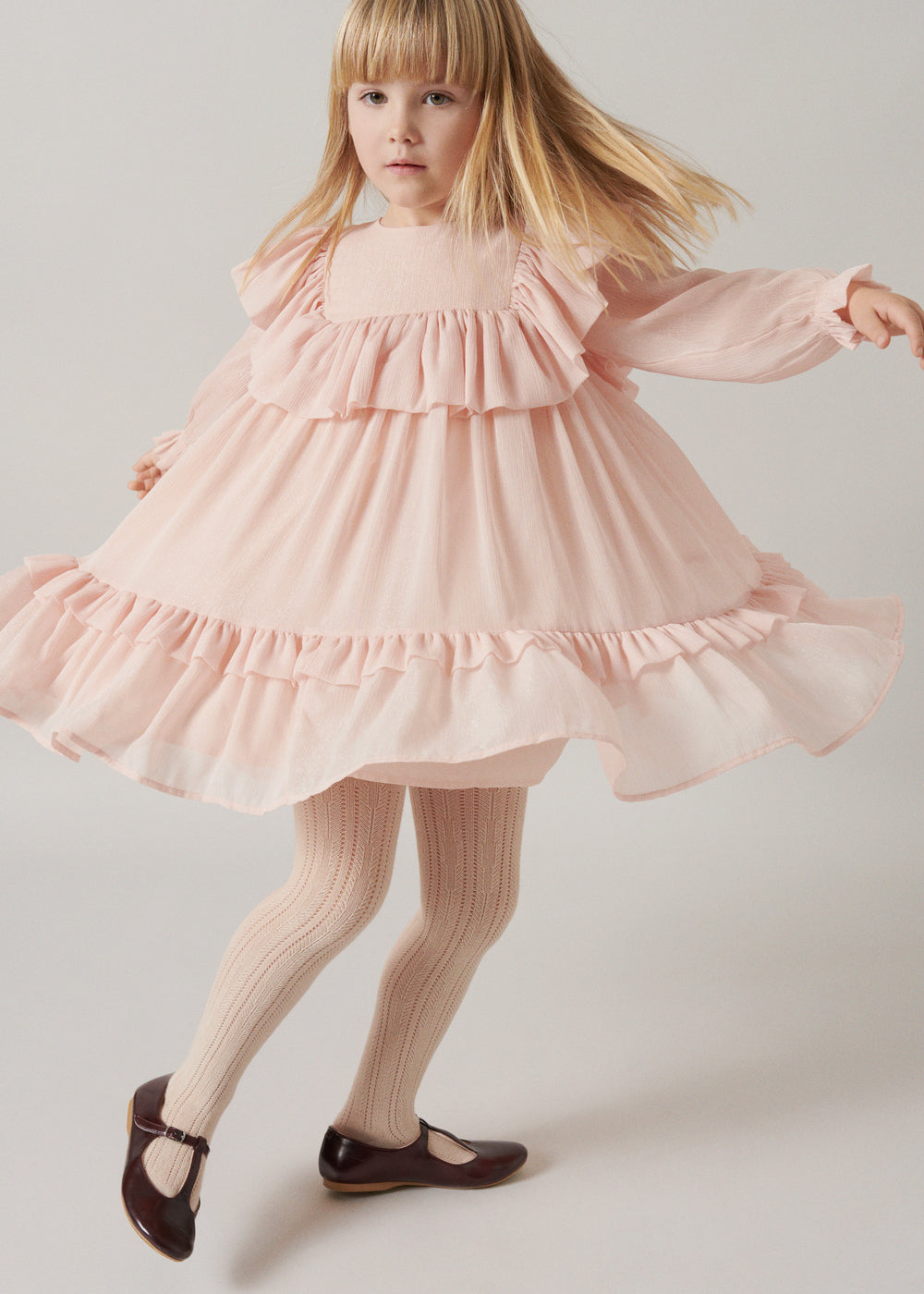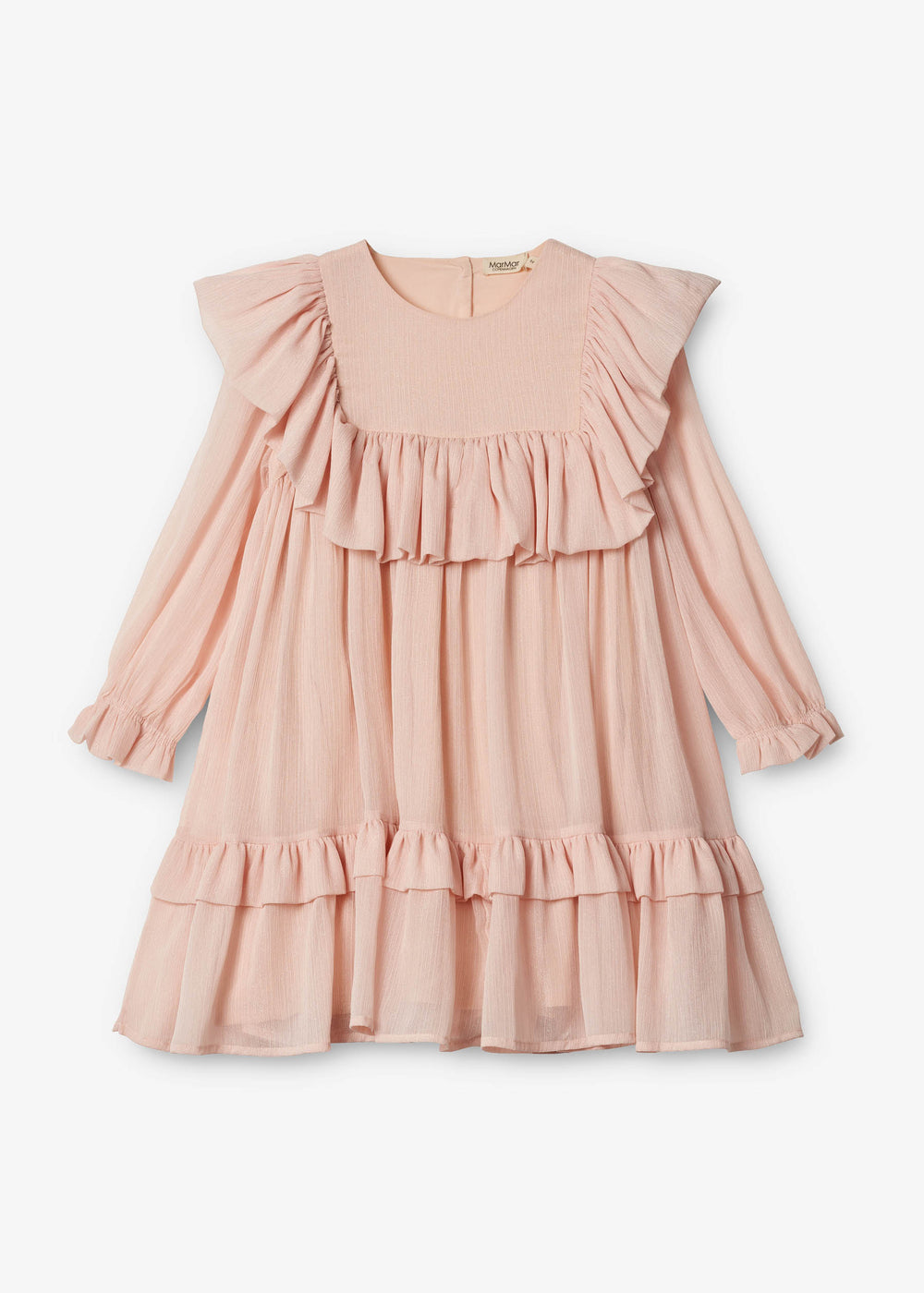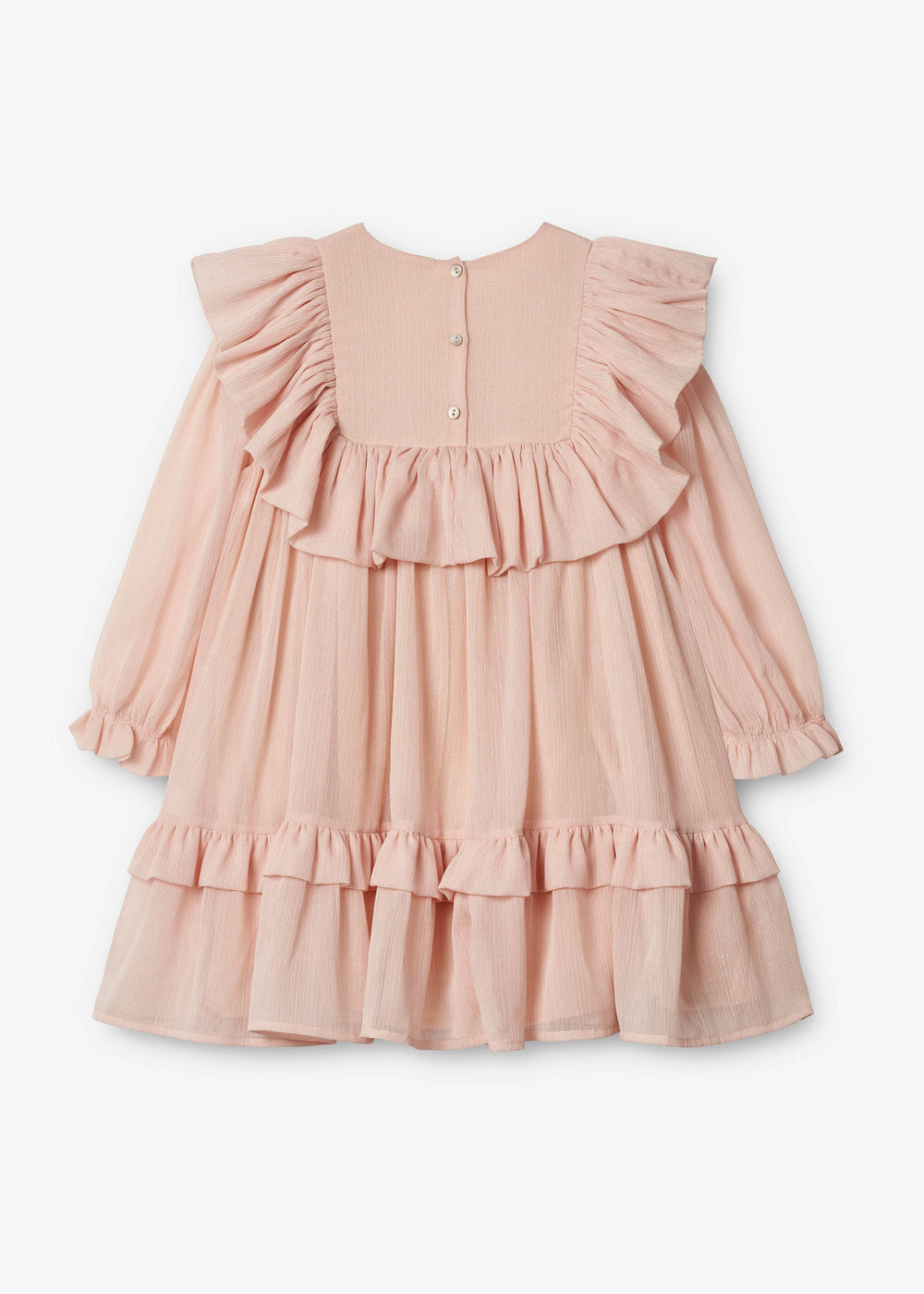 Dress with lots of volume, crepe chiffon and glitter stripes. The dress has an inner lining and closes with buttons at the back. The length of the dress goes above the knee.