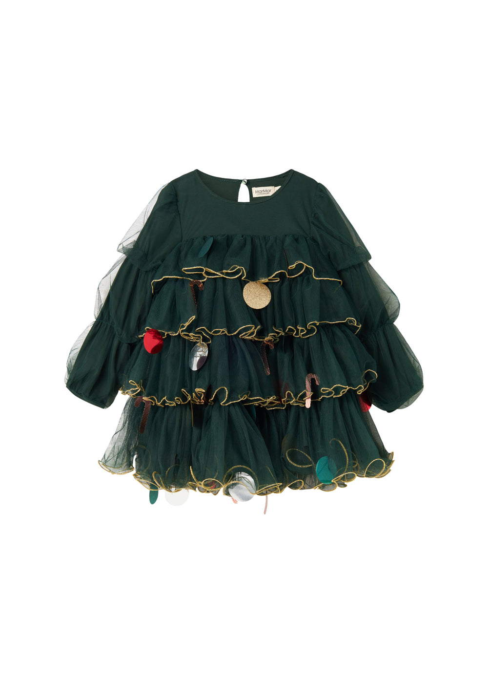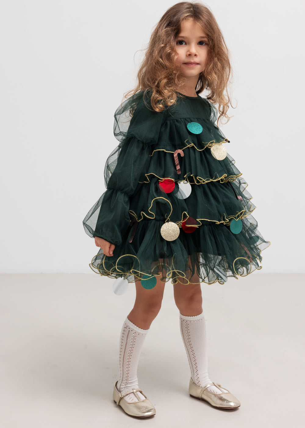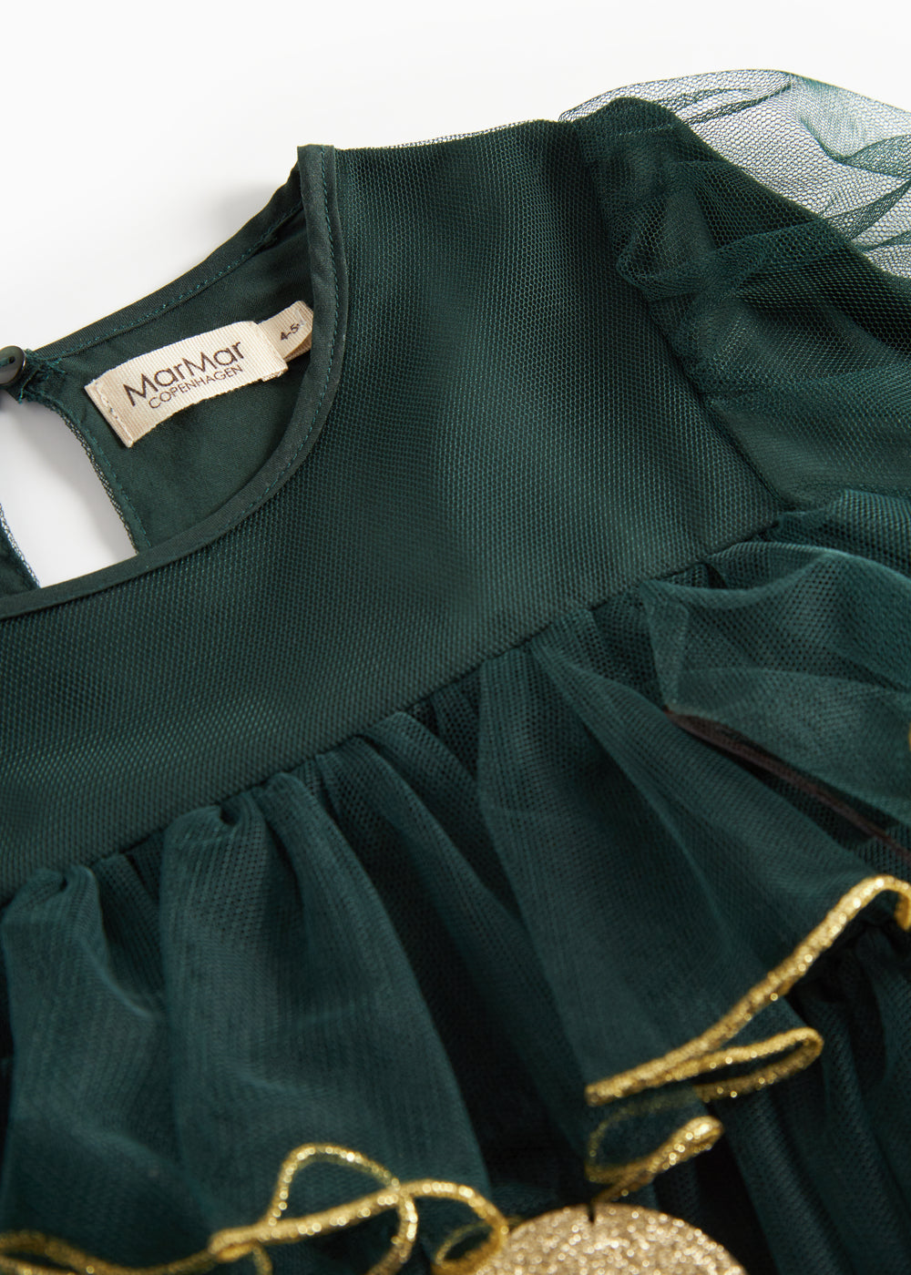 Long-sleeved tulle dress with lots of volume and soft viscose lining. The dress is decorated with festive Christmas ornaments sewn onto the fabric and finished with a delicate contrast edging. The dress has a button closure at the back and the length of the dress goes above the knee. A perfect dress for the festive holiday season.