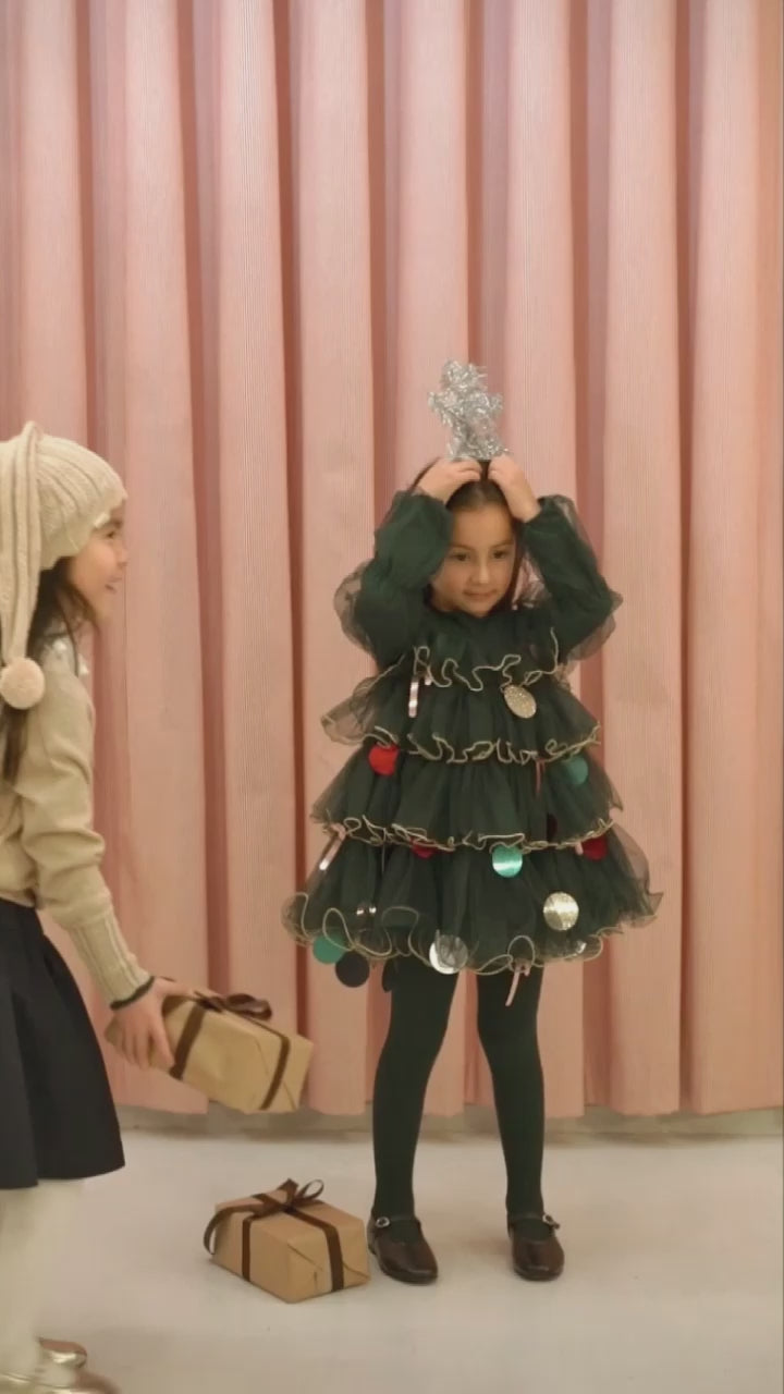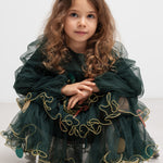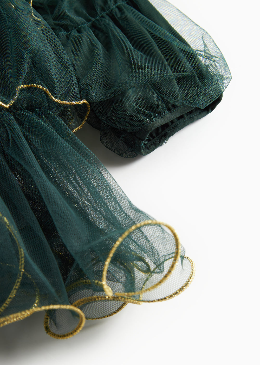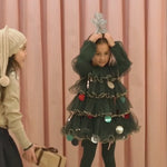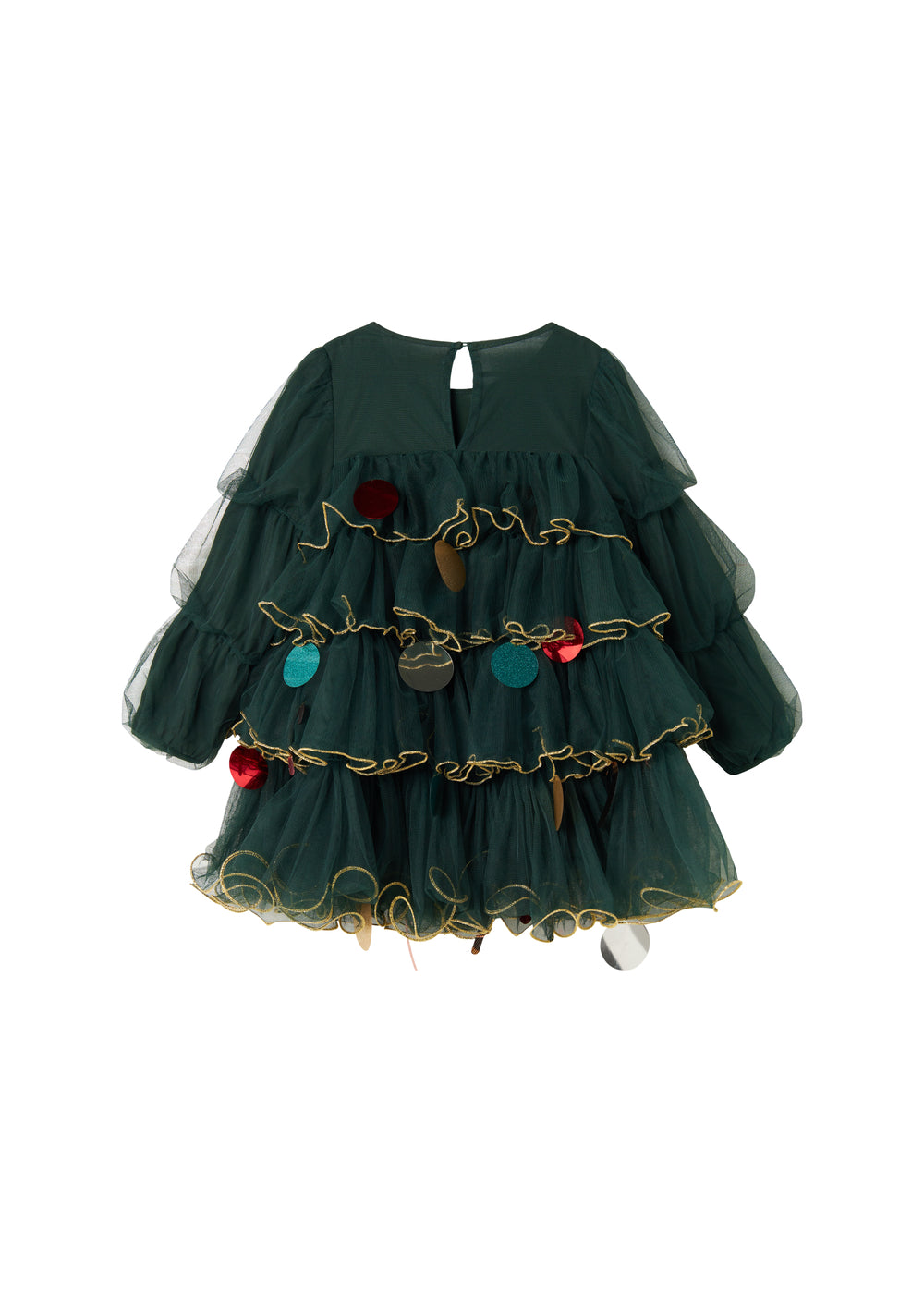 Long-sleeved tulle dress with lots of volume and soft viscose lining. The dress is decorated with festive Christmas ornaments sewn onto the fabric and finished with a delicate contrast edging. The dress has a button closure at the back and the length of the dress goes above the knee. A perfect dress for the festive holiday season.