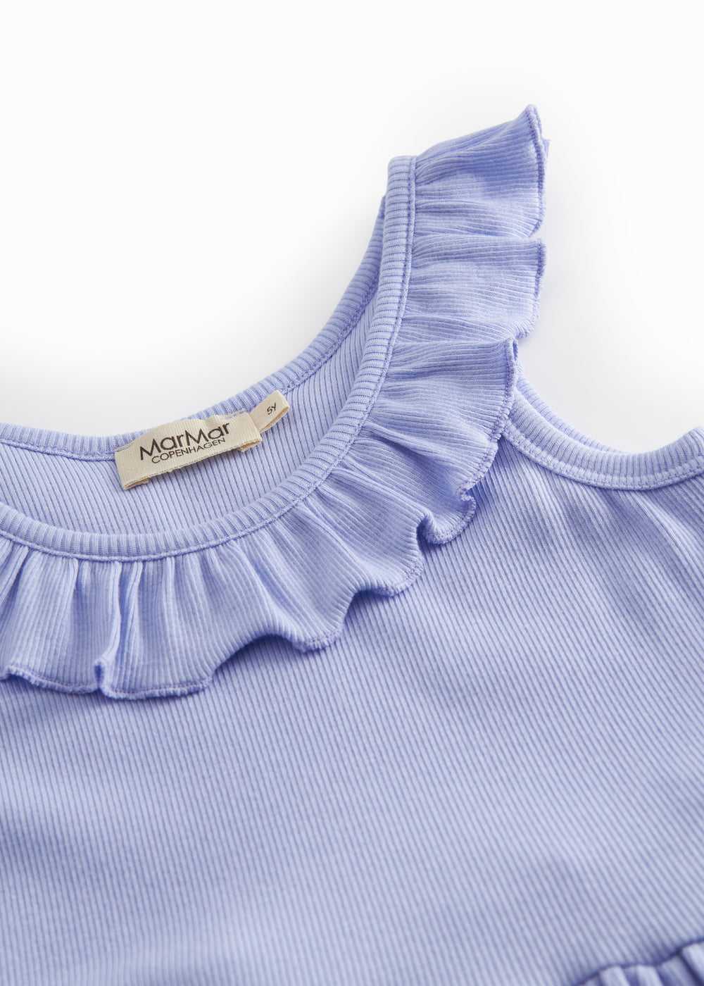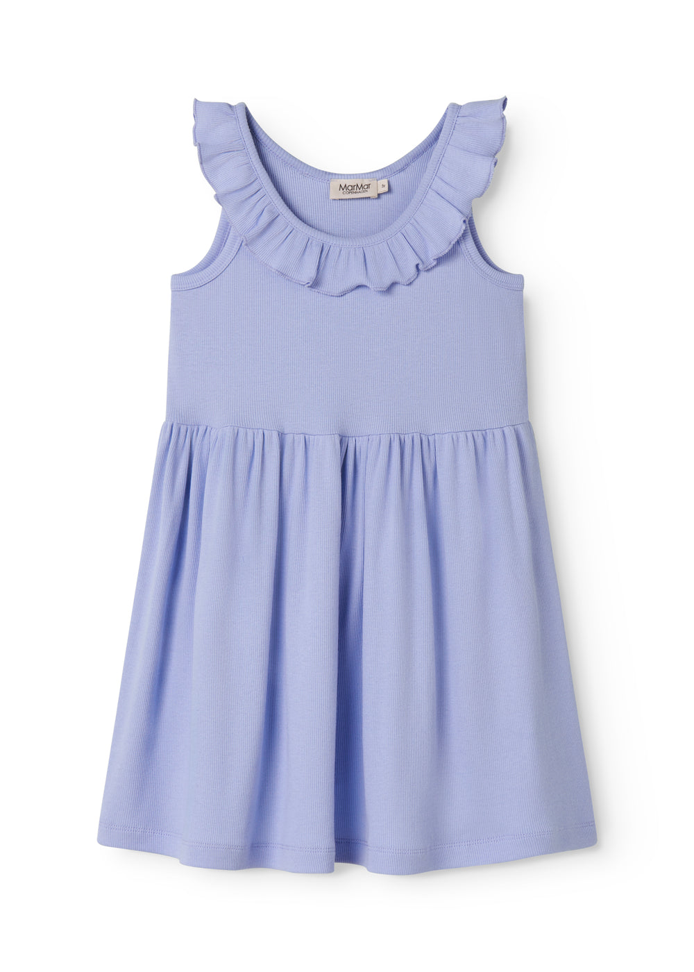 Short-sleeved kids strap dress with a ruffle collar. The length of the dress goes above the knee. The dress is soft, keeps its shape and color, and contains elastane, which makes it stretchy and comfortable to wear.