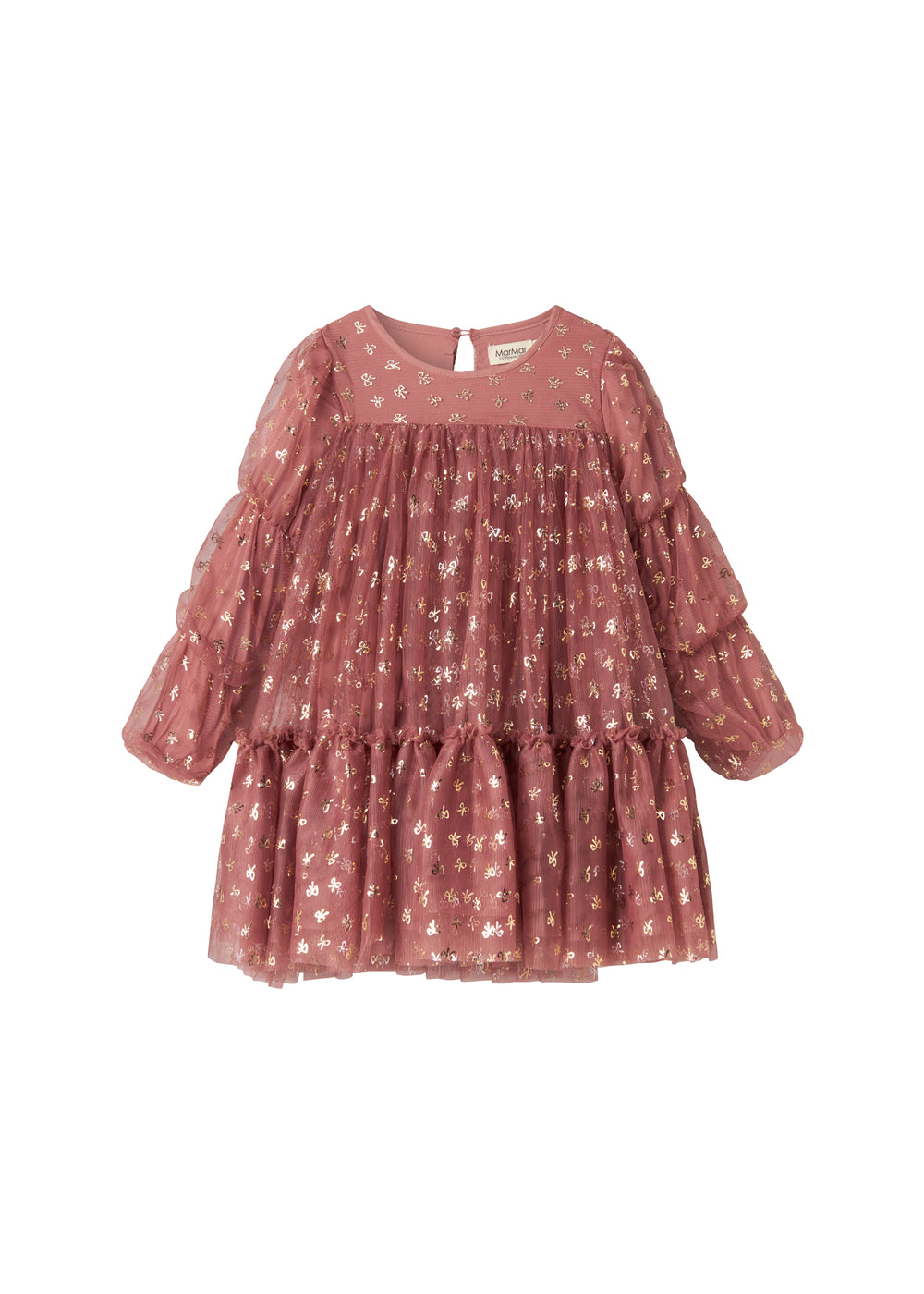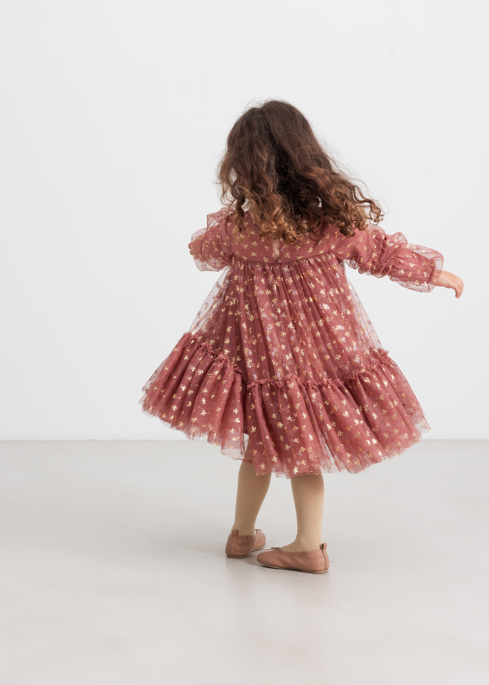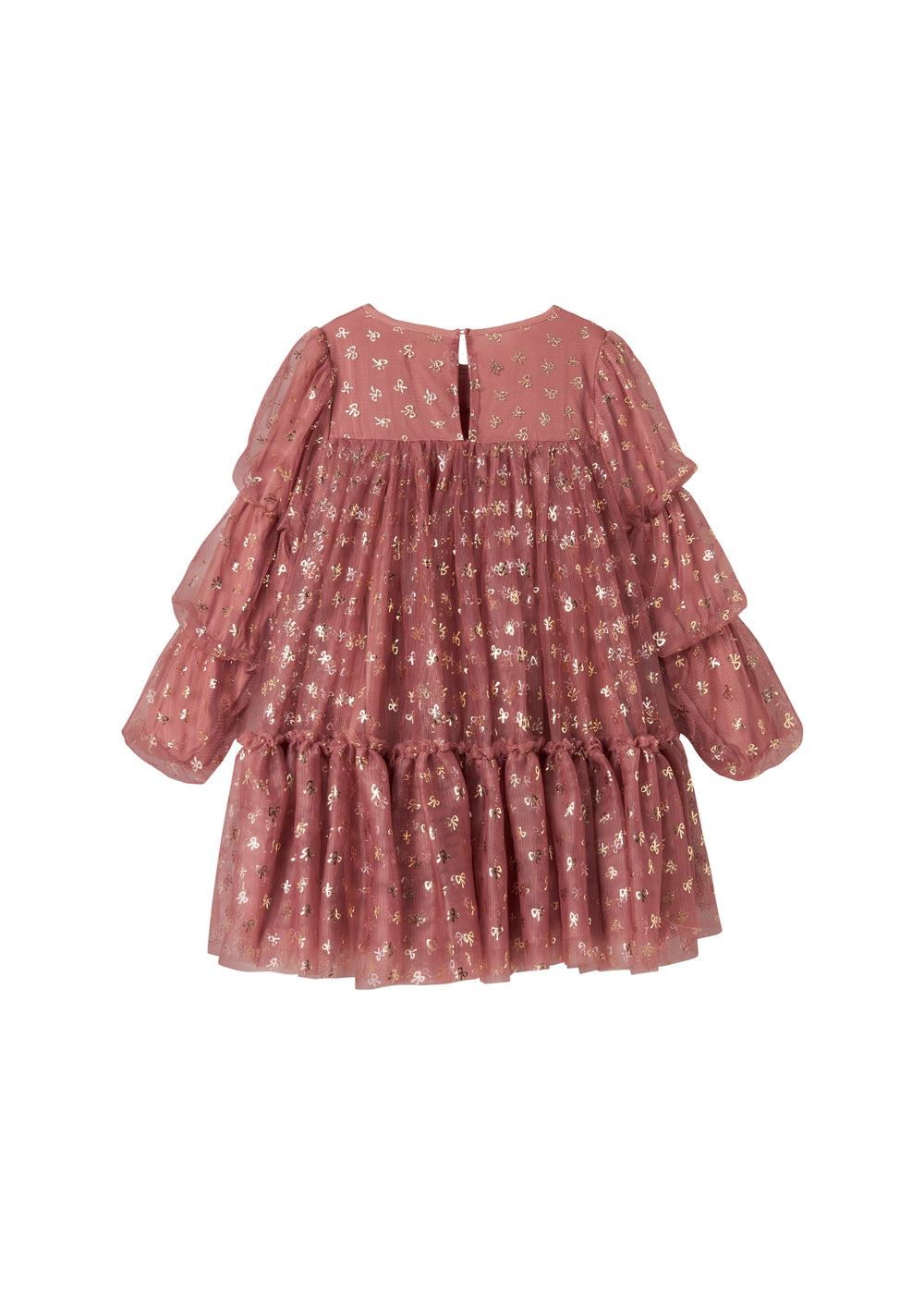 Long-sleeved tulle dress with lots of volume and soft cotton lining. The dress is decorated with gold bows, has a button closure at the back and the length of the dress goes above the knee.