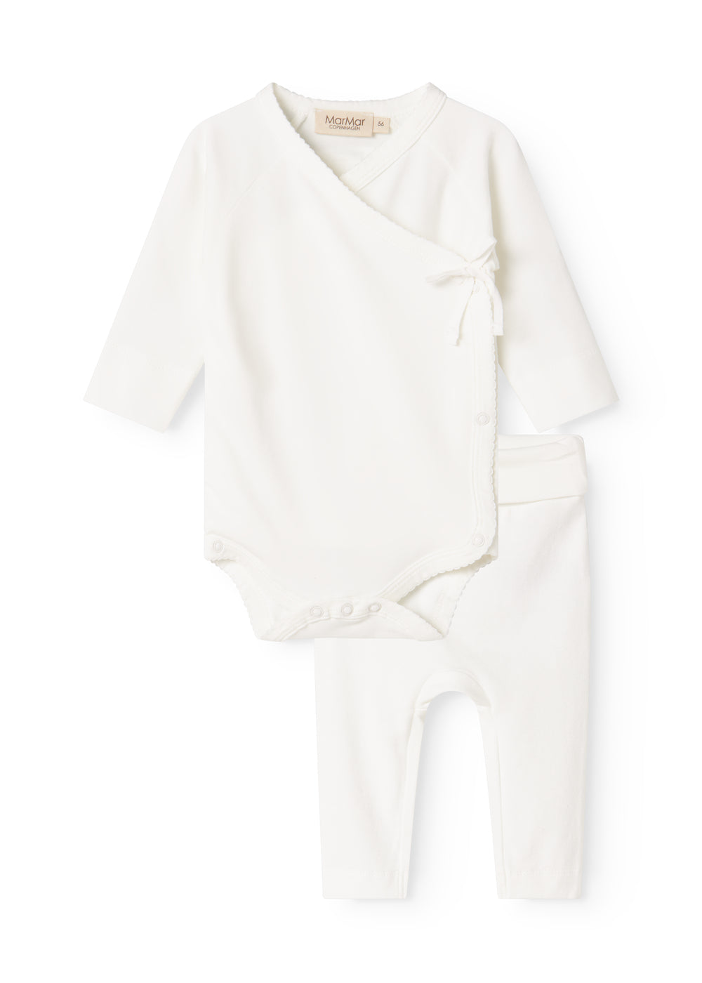Gift box containing a newborn set consisting of bodystocking and pants.