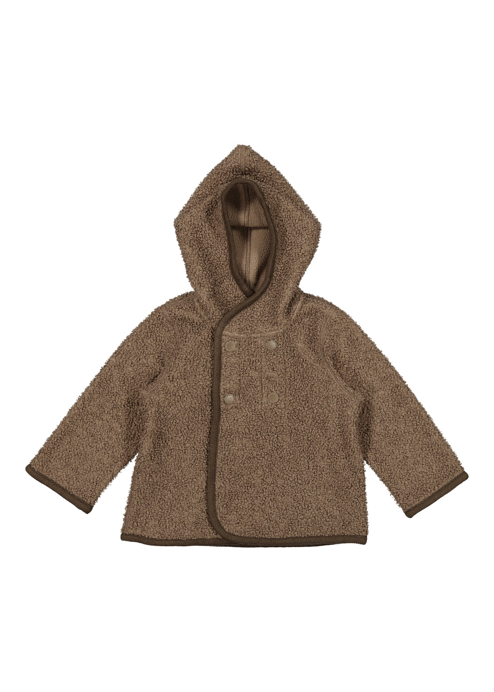 Teddy jacket with fleece on the inside and elf hood. The teddy jacket closes with an inside and outside button closure at the front and is both warm, soft and comfortable to wear.