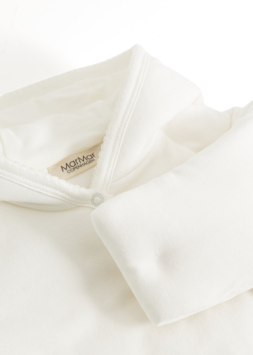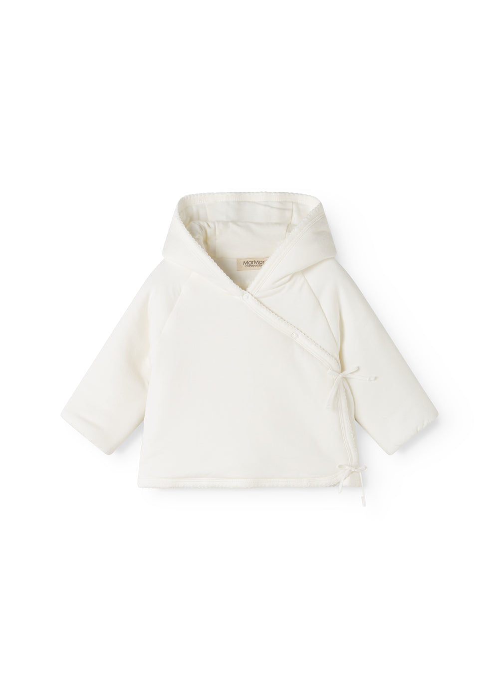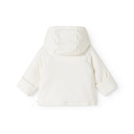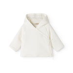 Varm vatteret jakke med slå-om-lukning og hætte. Jakken lukkes med trykknapper og bindebånd. Jakken fra størrelse 0M-9M har smart ombuk mulighed på ærmerne for at holde den lille varm.