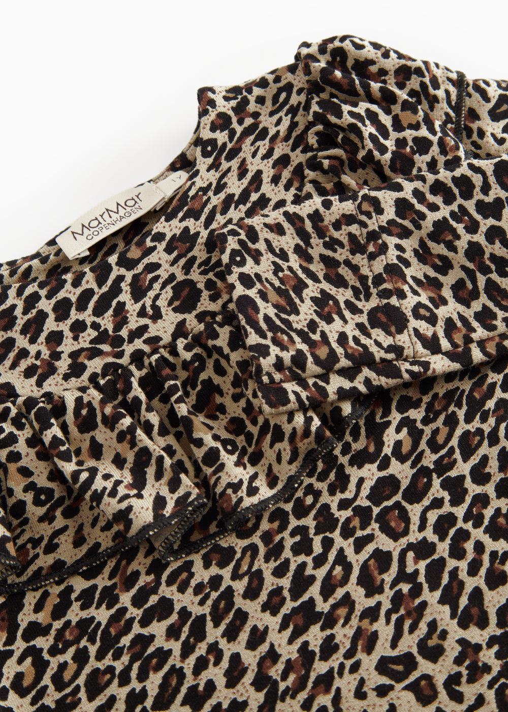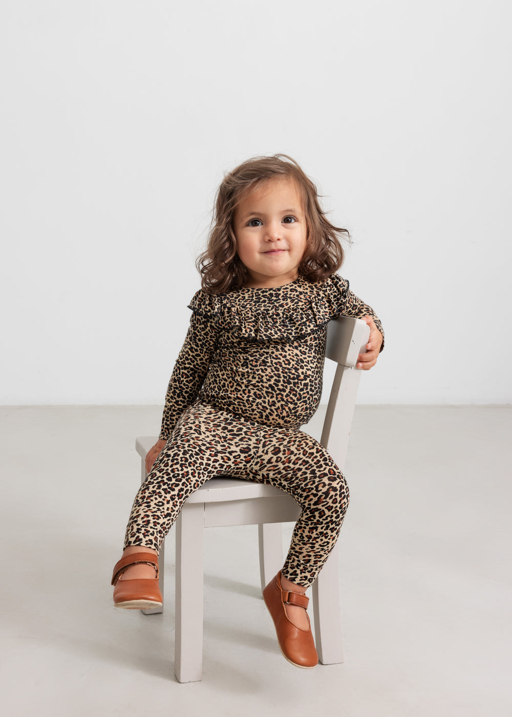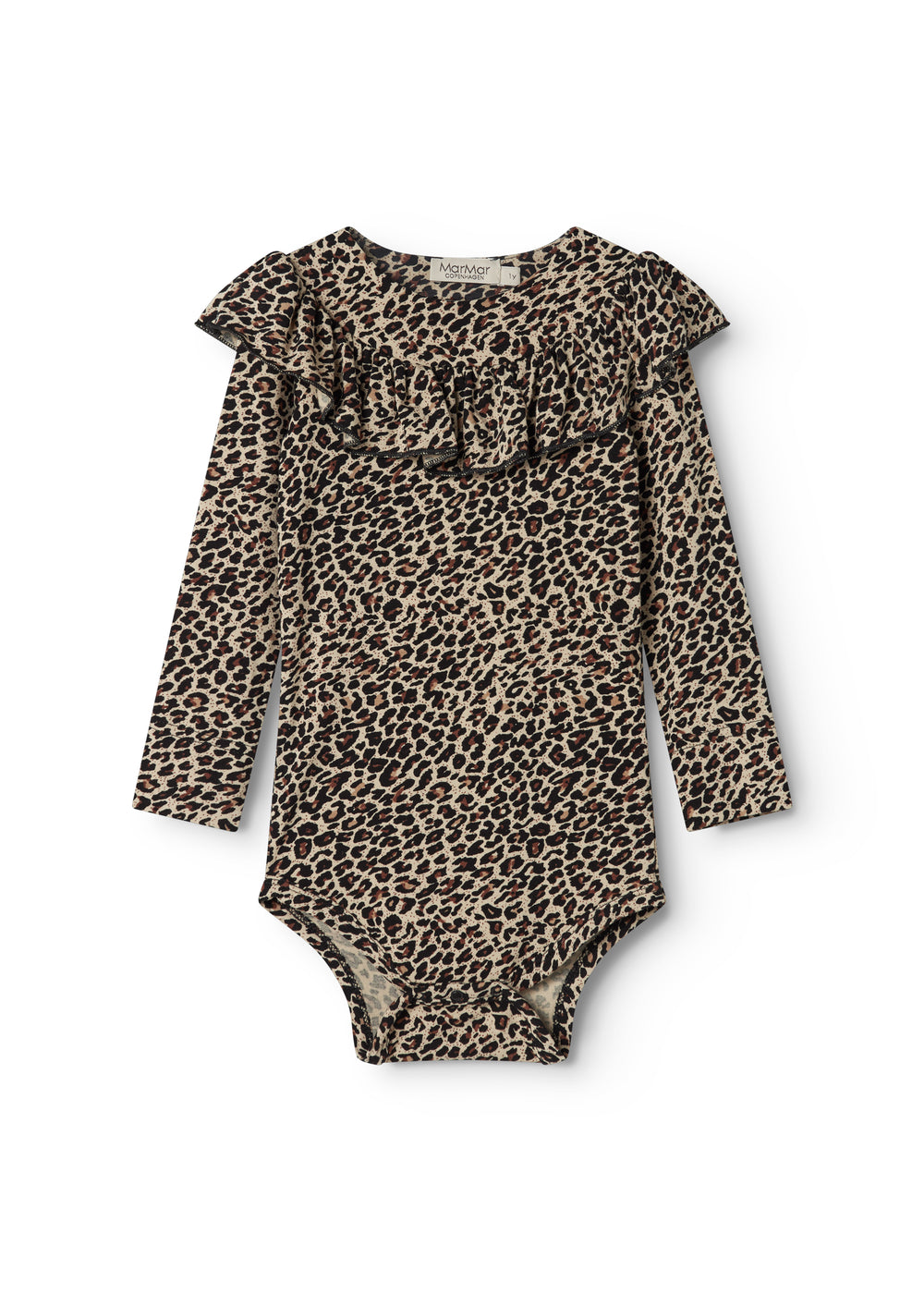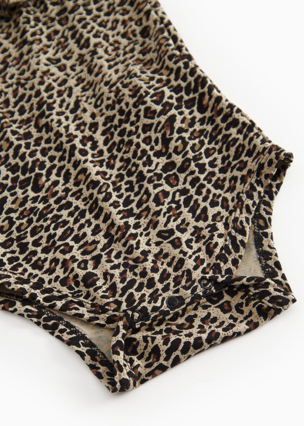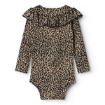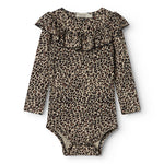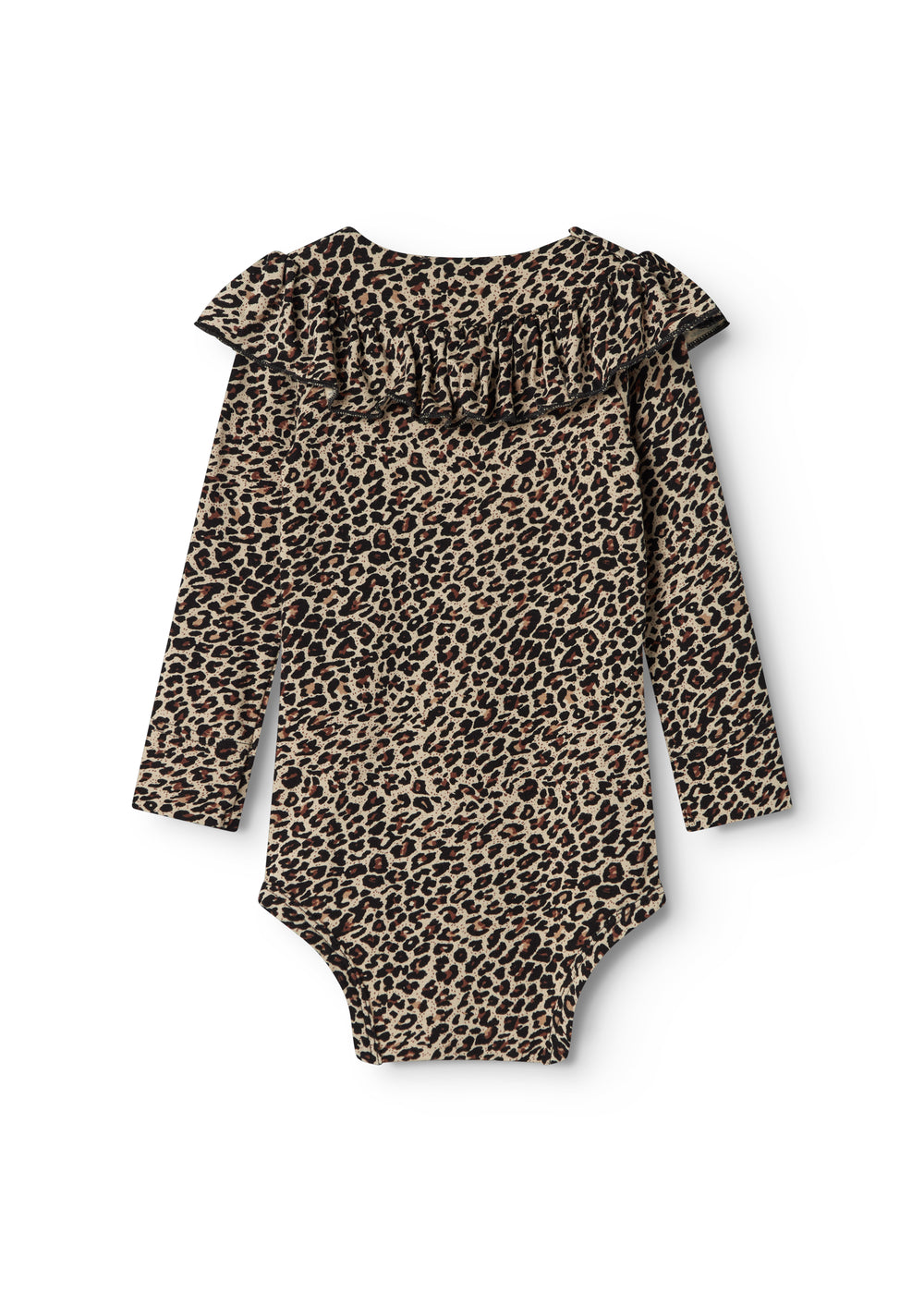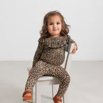 Long-sleeved leopard bodystocking with a ruffle collar, closed with snaps on the left shoulder and between the legs for easy diaper changes.