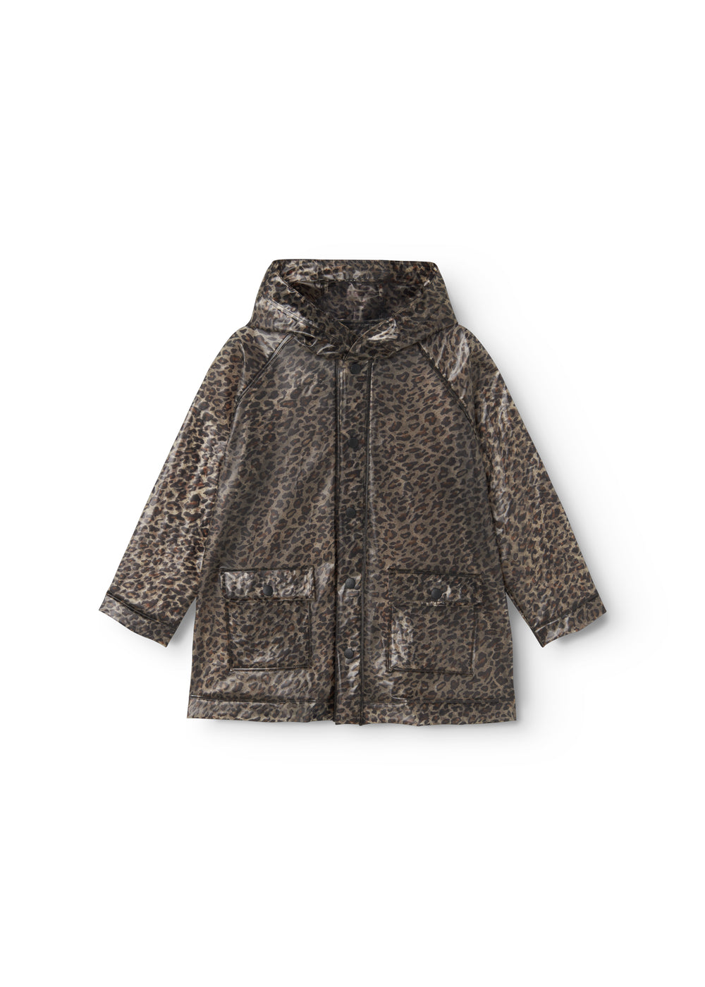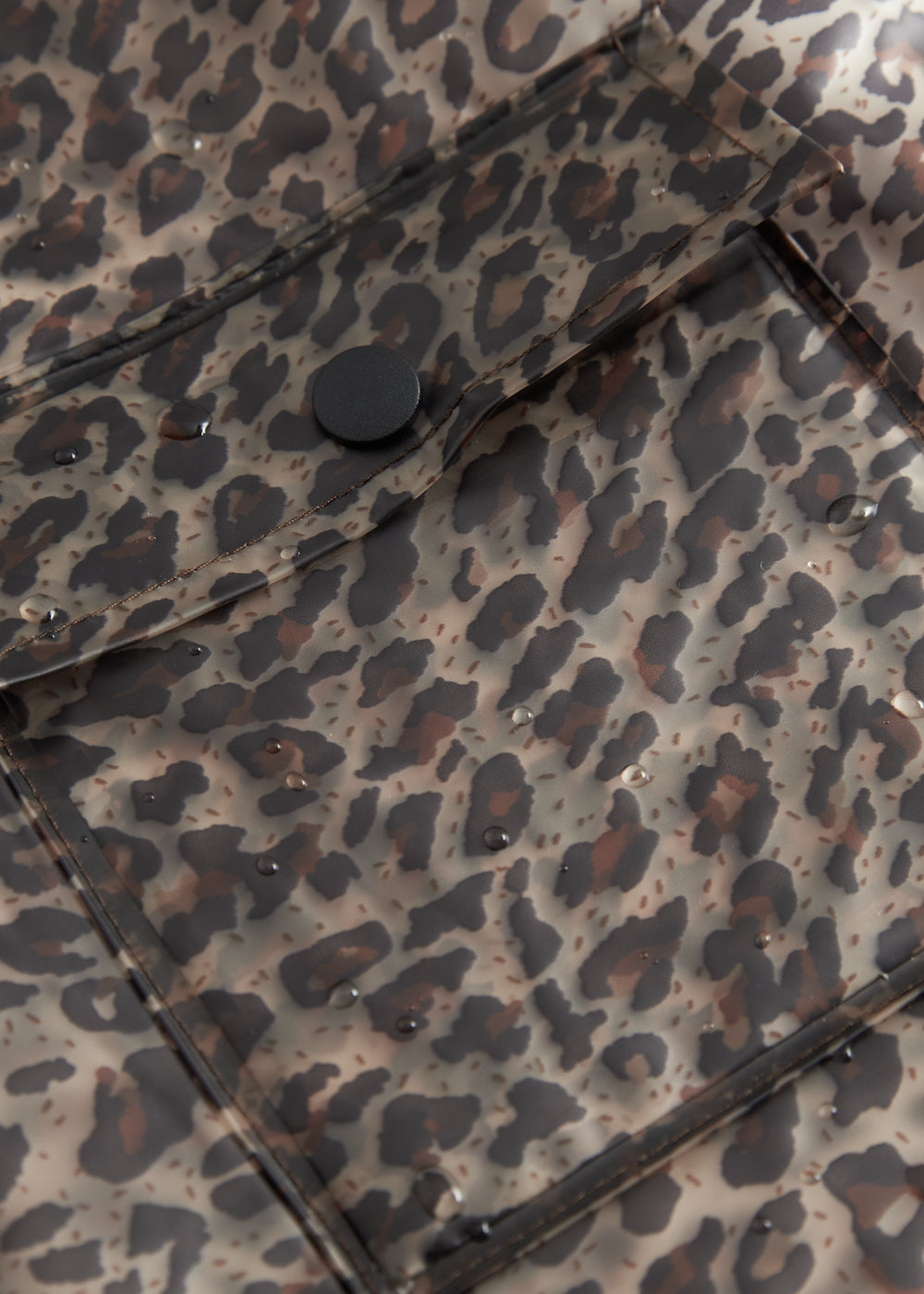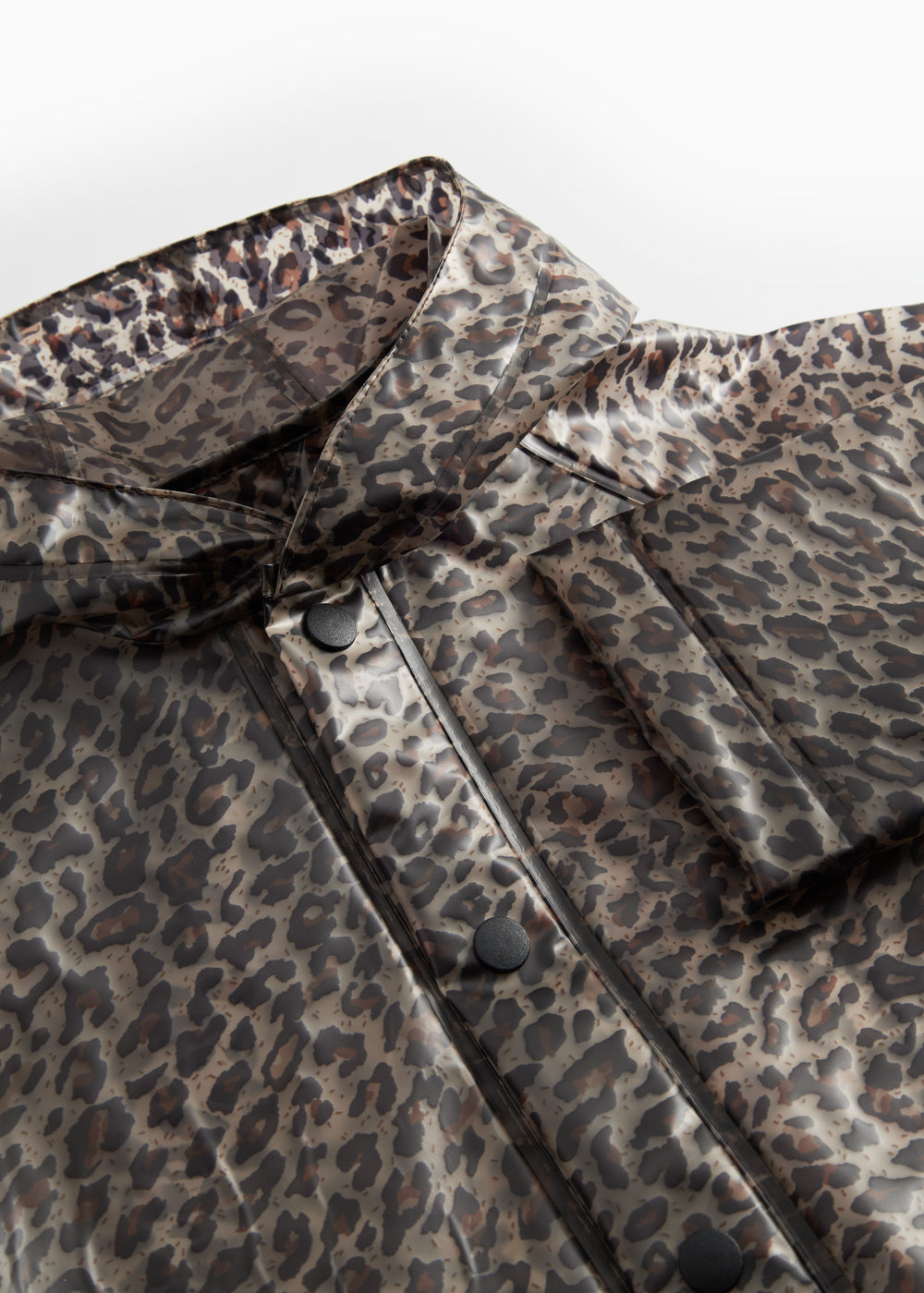 Transparent rain jacket in leopard print with hood, press stud closure and two large front pockets. The rain jacket is waterproof and has a water column pressure of 10,000 mm.