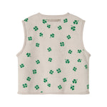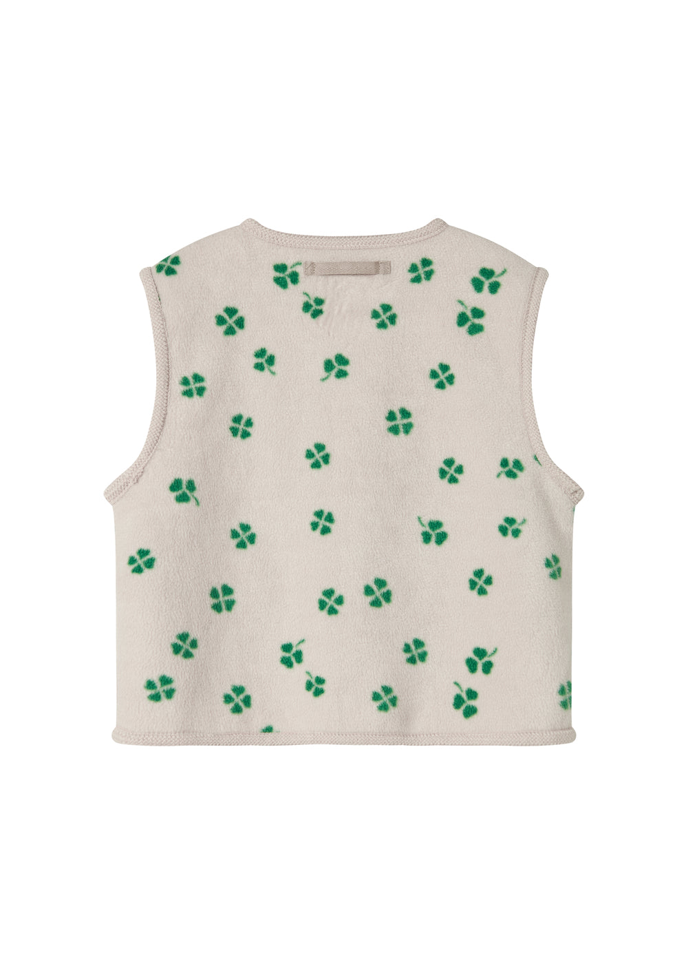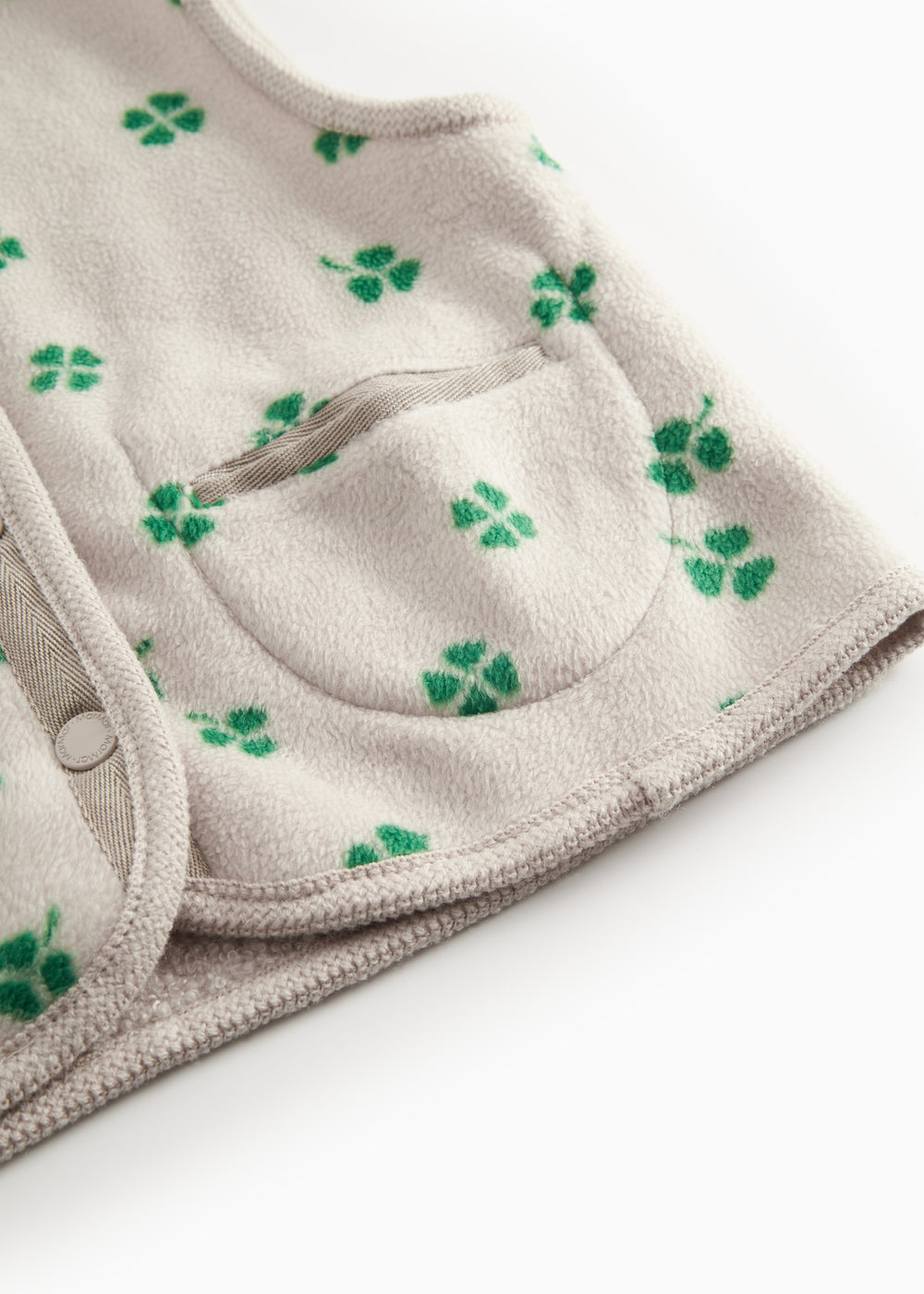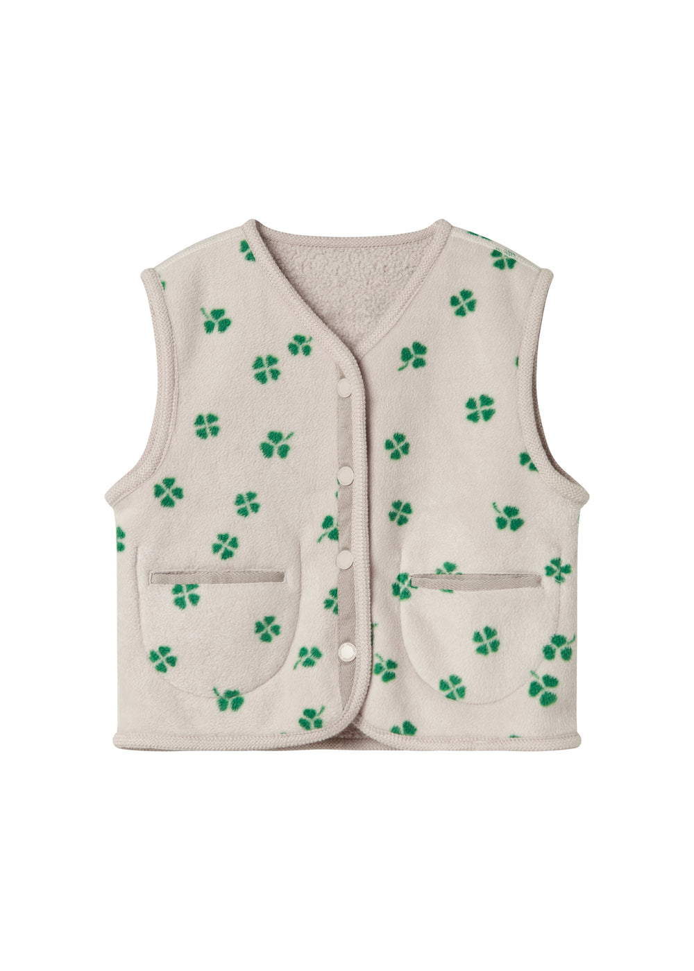 Reversible teddy vest for children with fleece and four-leaf clover on one side. The vest closes with a button closure and has two spacious pockets on both sides. The teddy vest is both warm, soft and comfortable to wear.
