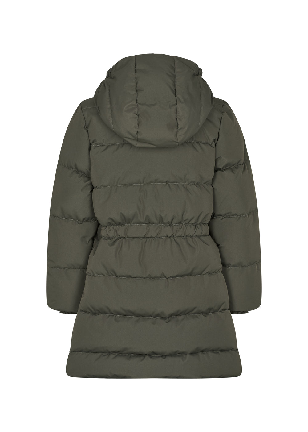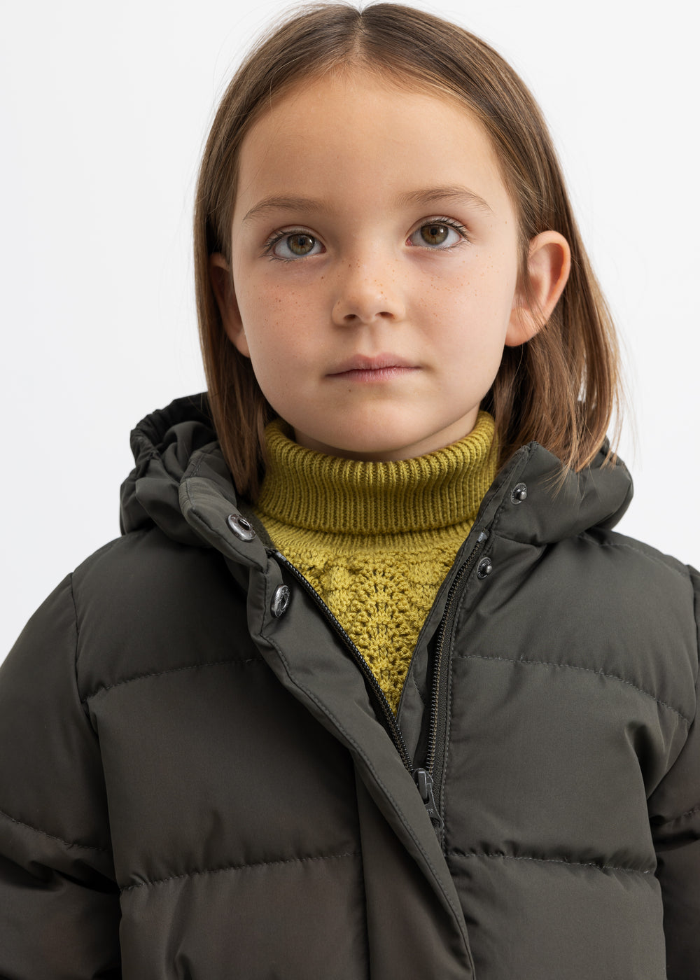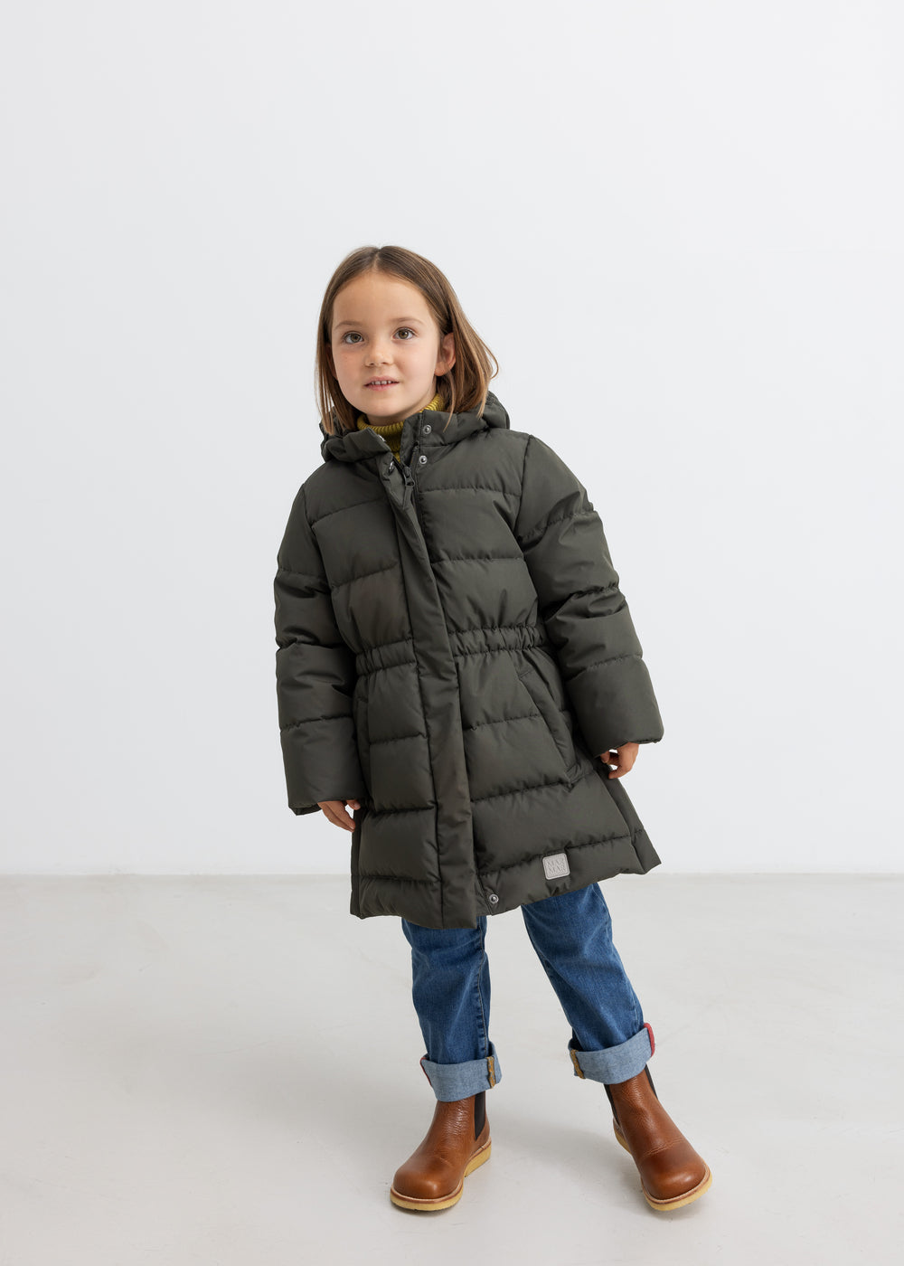Long and comfortable down jacket designed to keep your child warm and comfortable during the cold months. The jacket has a longer fit that provides extra protection against cold and wind. The down coat has elastic on the inside that can be tightened at the waist for a more feminine look. The jacket has two slanted side pockets where hands can be kept warm or small items can be stored. The down jacket has a removable hood, zippers on the sides that can be opened to increase freedom of movement, making the jacket ideal for active play and outdoor adventures. The down jacket closes with a hidden zipper closure and press studs at the front that provide extra protection against cold and wind.