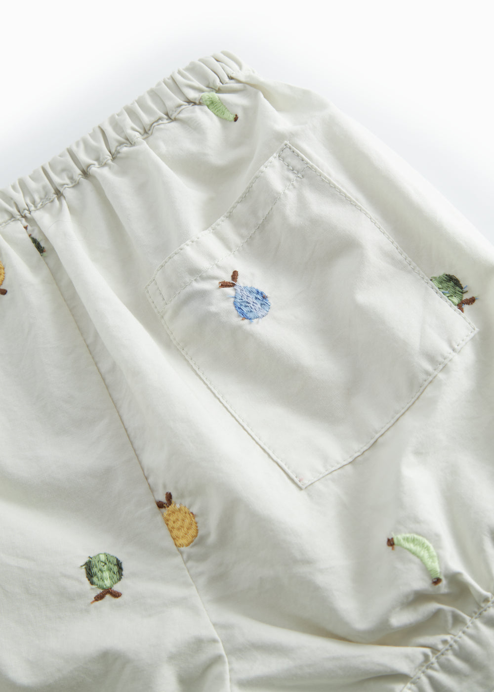 Comfortable baby shorts with a loose fit, a pocket on the back and an elastic waist. The shorts have a nice fruit embroidery and are made of a light and crispy cotton quality, which makes them comfortable to wear.
