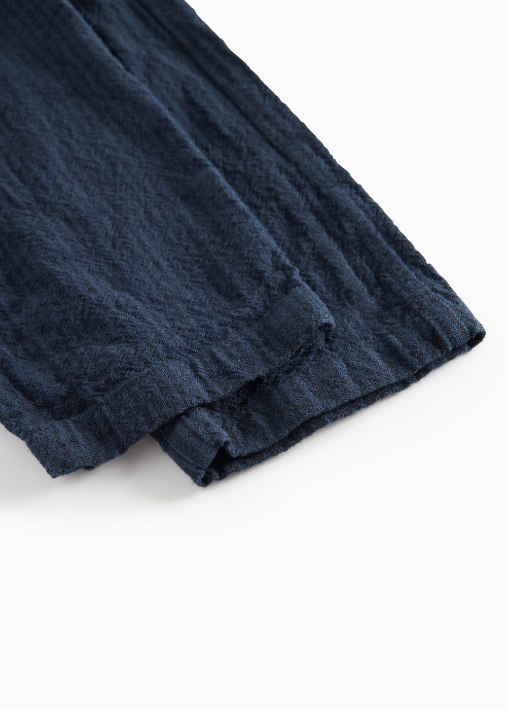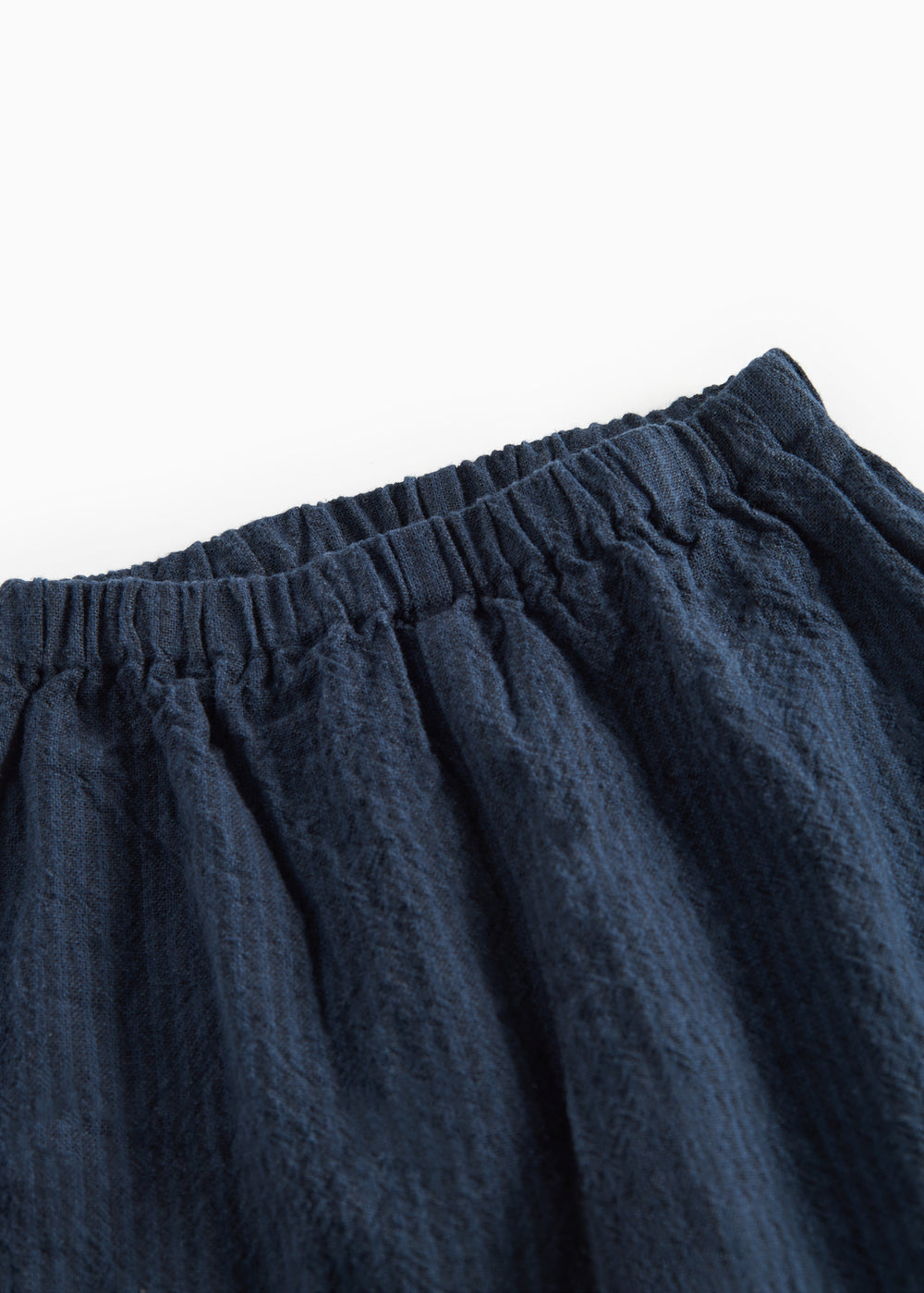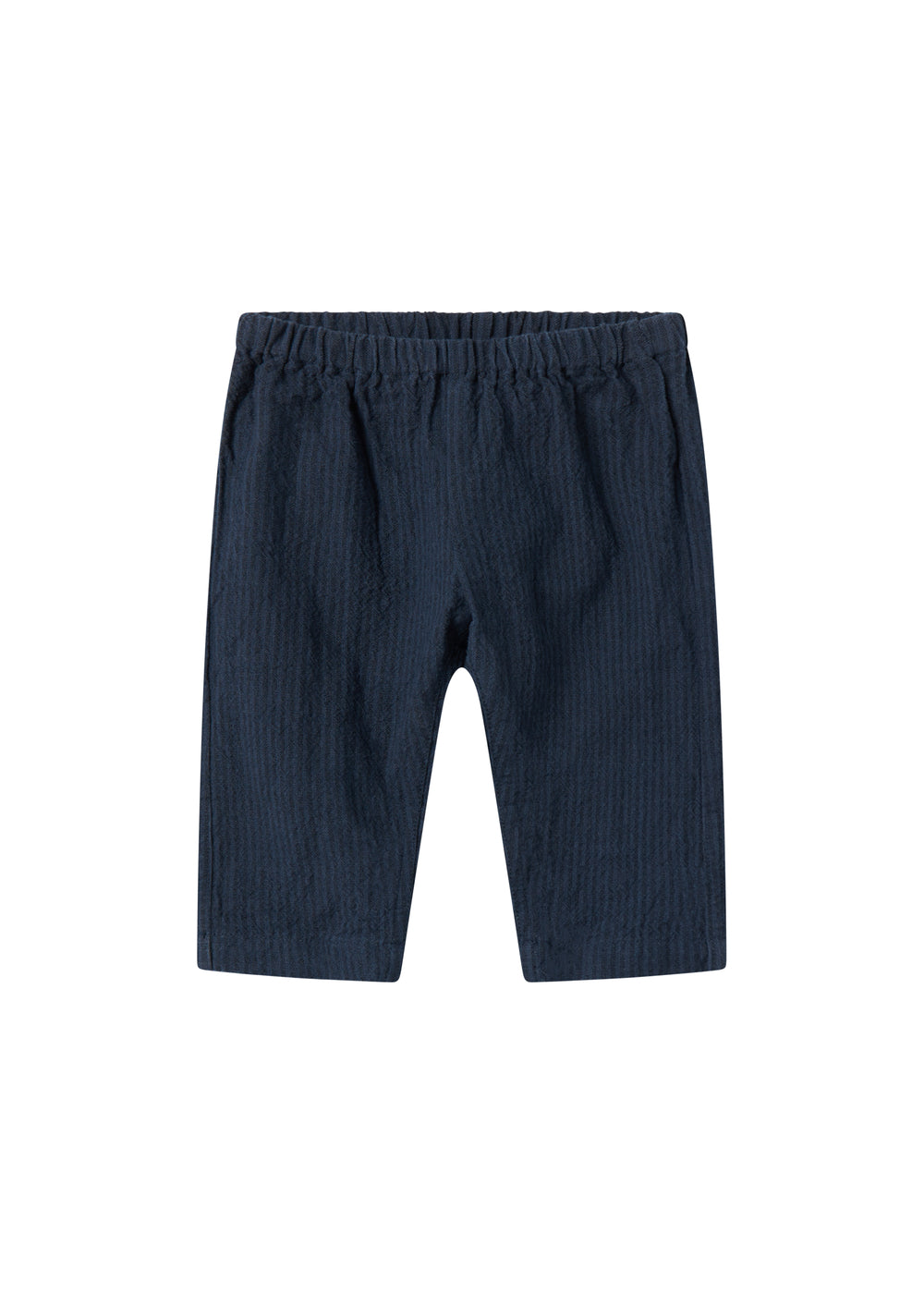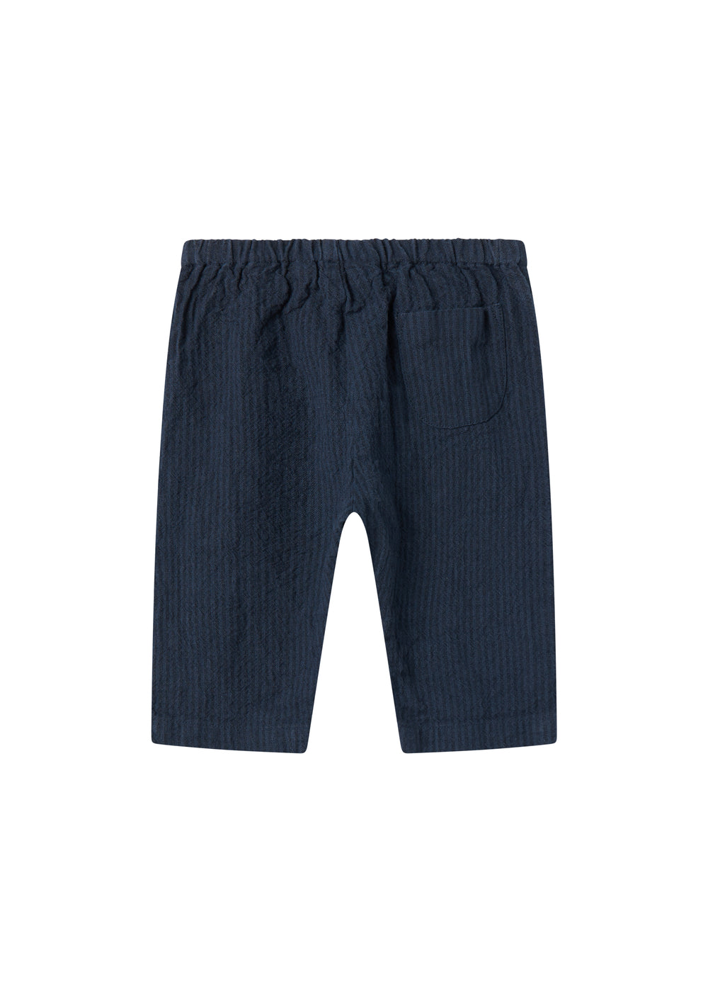 Comfortable baby pants in striped chambray denim, with a loose fit and a pocket on the back and elastic at the waist.