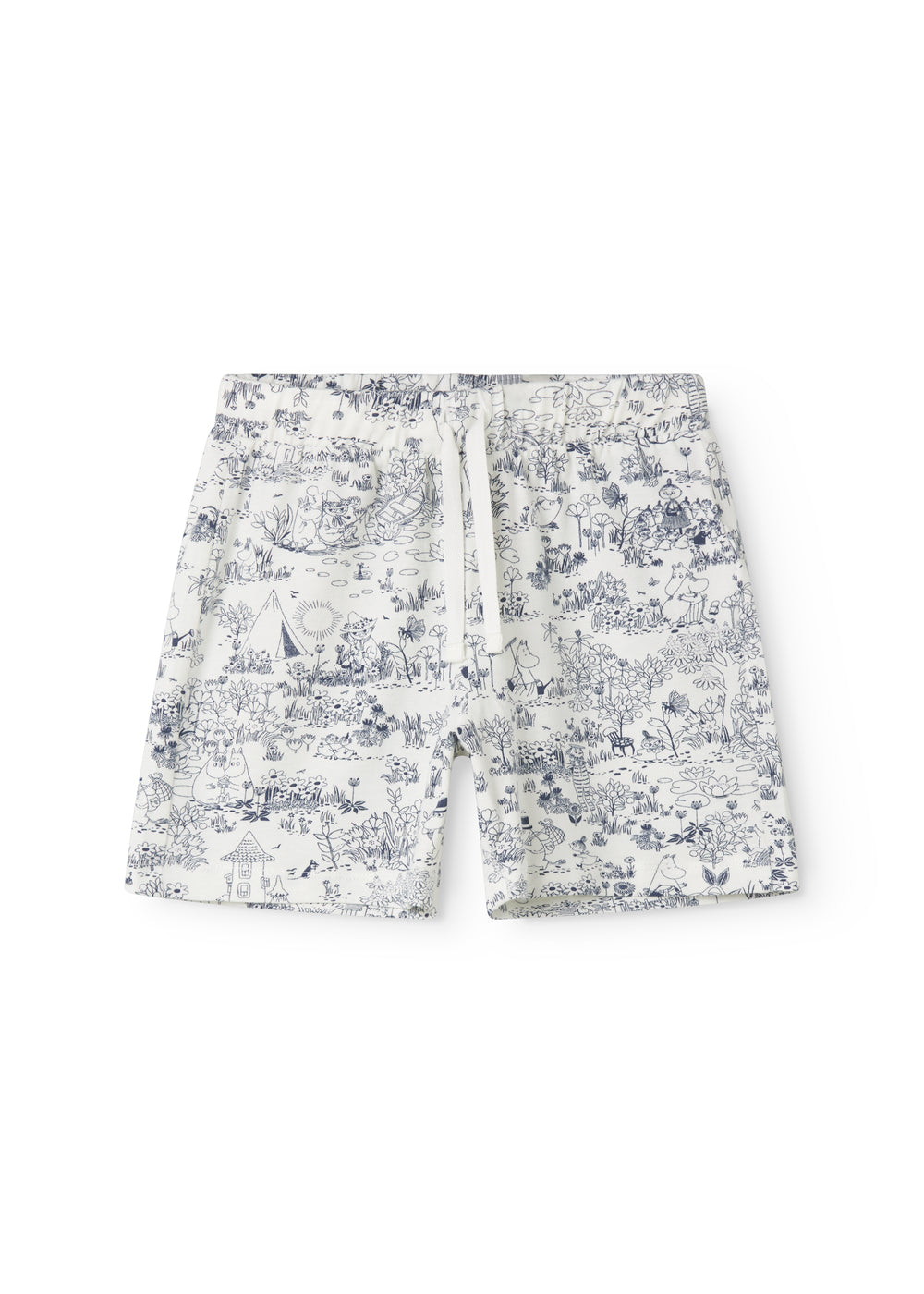 Shorts for children with a fine Moomin print, wide elastic, and ties at the waist.