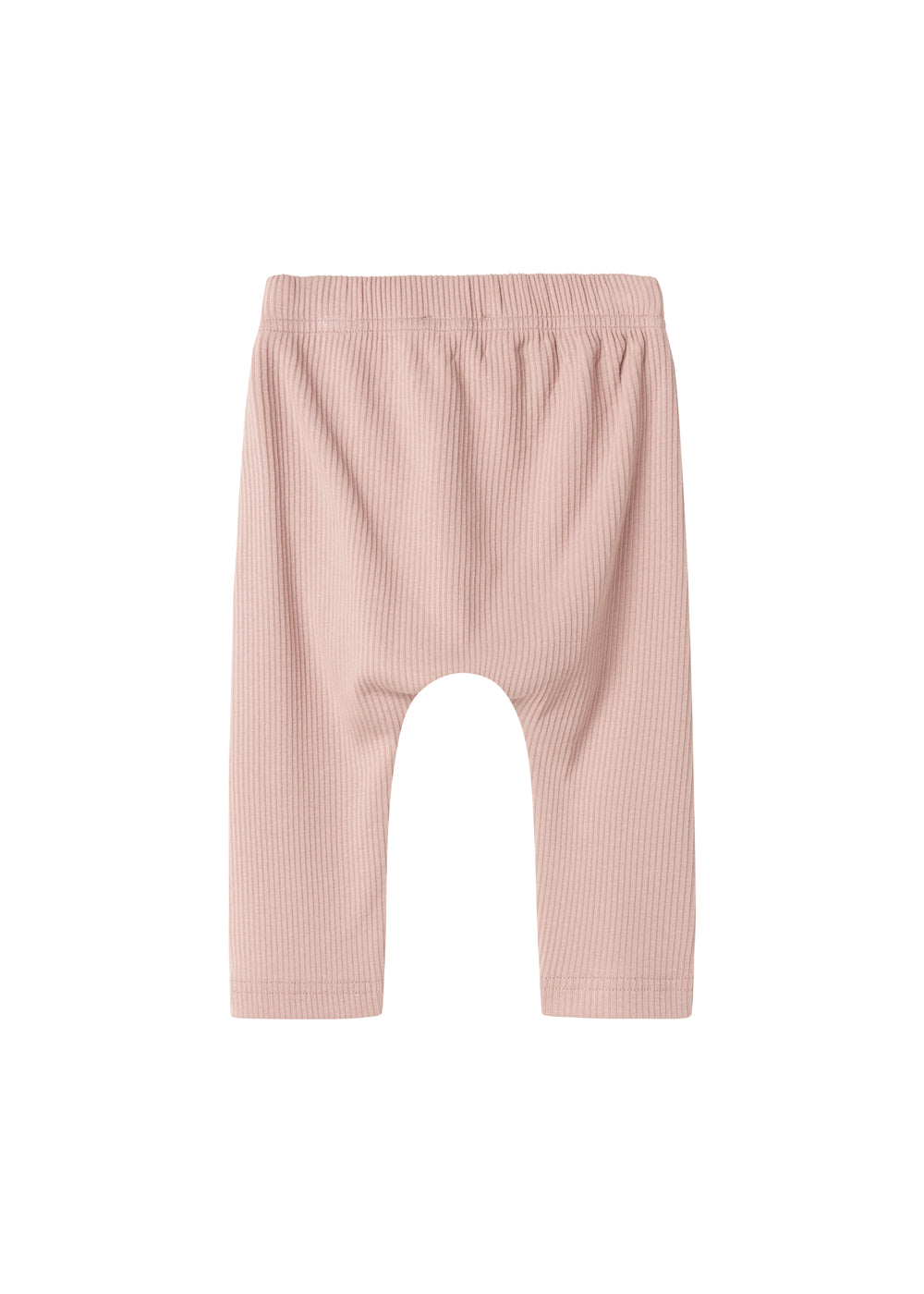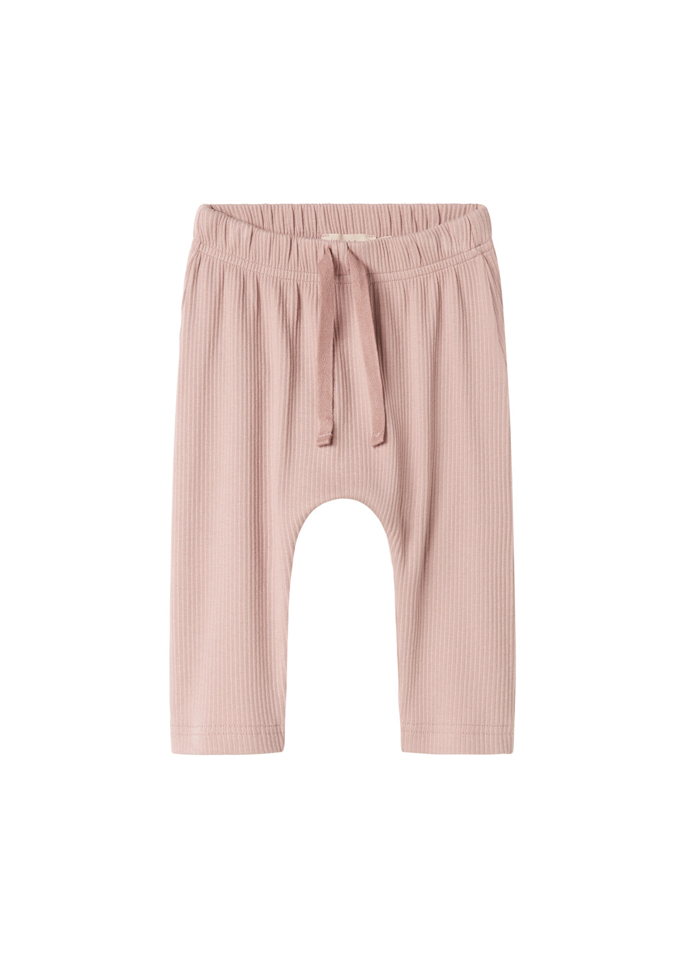 Baby pants with wide elastic and a tie at the waist. The pants are ribbed, soft, stretchy and comfortable to wear.