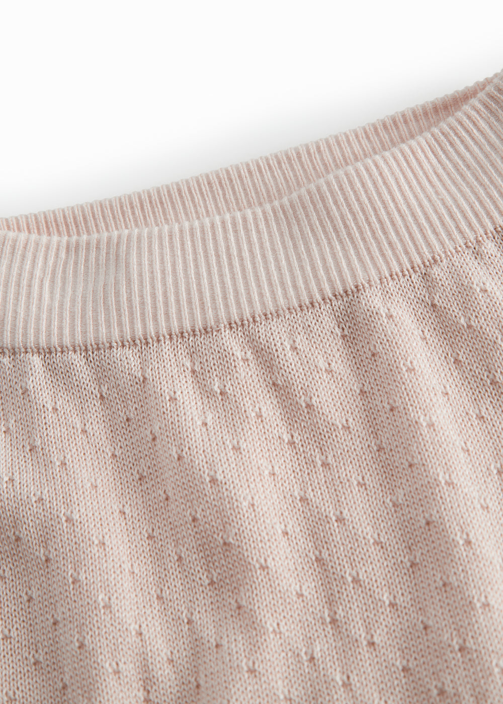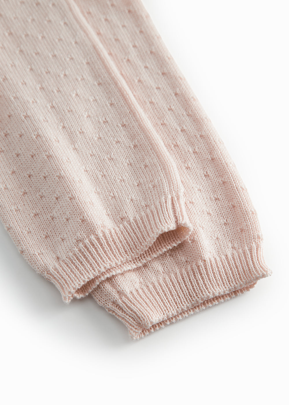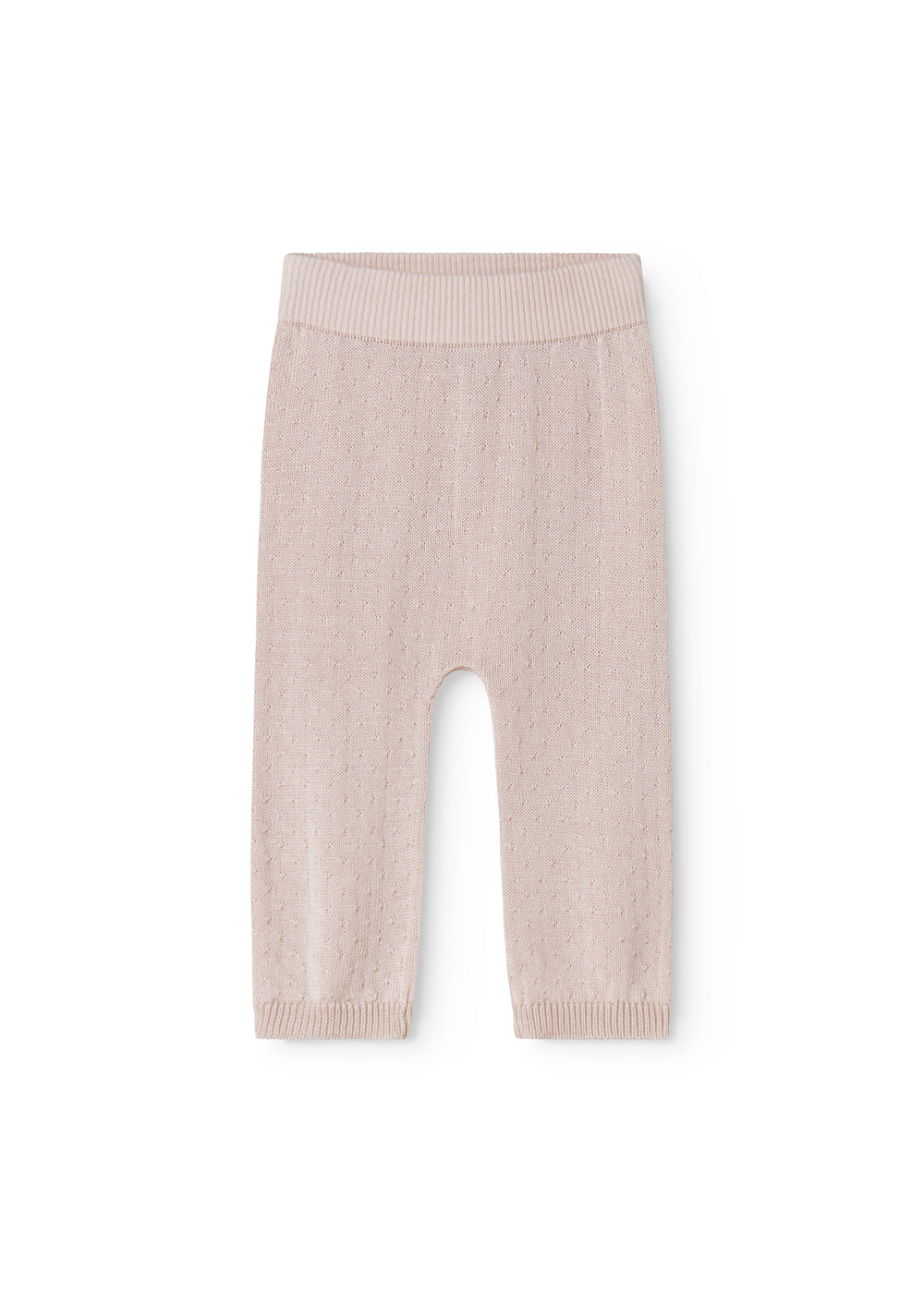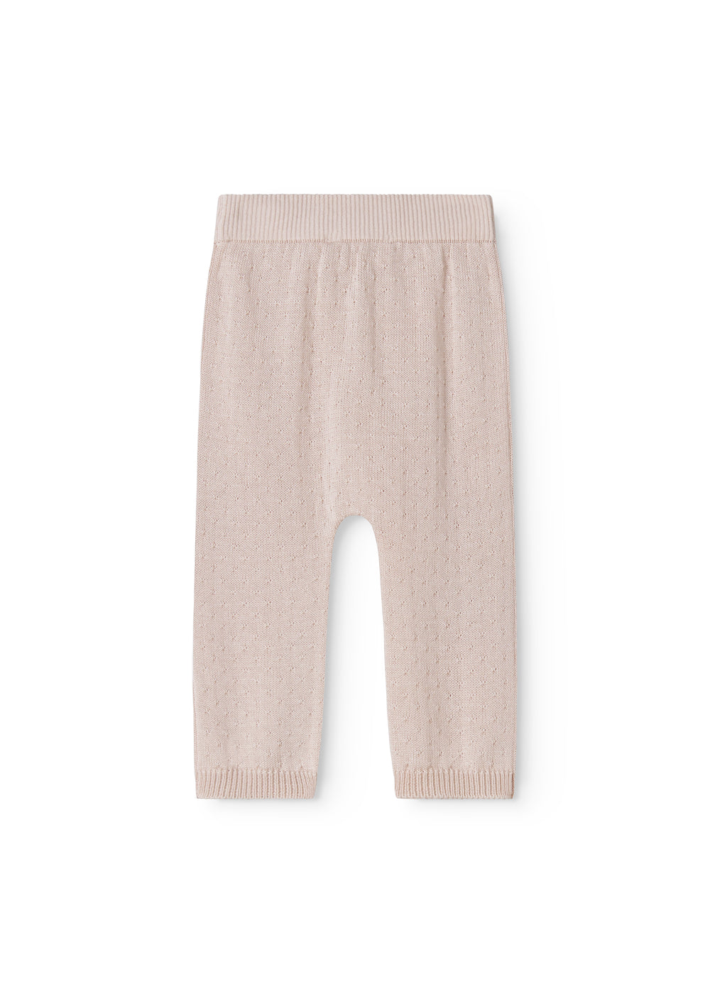 Knitted trousers for the little ones with a fine lace pattern. The trousers have a wide elasticated waist and ribbed edges at the ankles for a soft and comfortable fit.