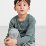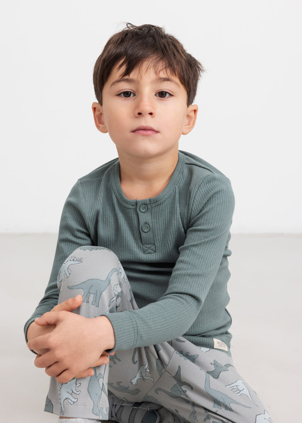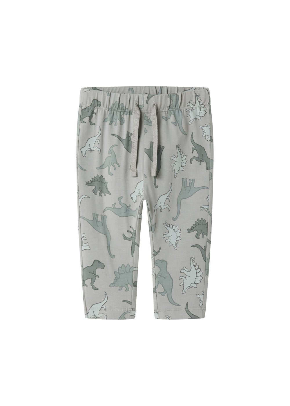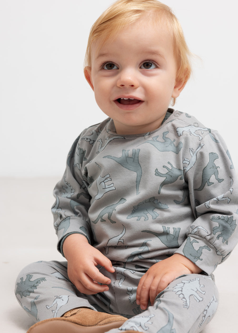 Comfortable pants with a dinosaur print, elastic and decorative ribbon at the waist. The pants are soft, stretchy and comfortable to wear.