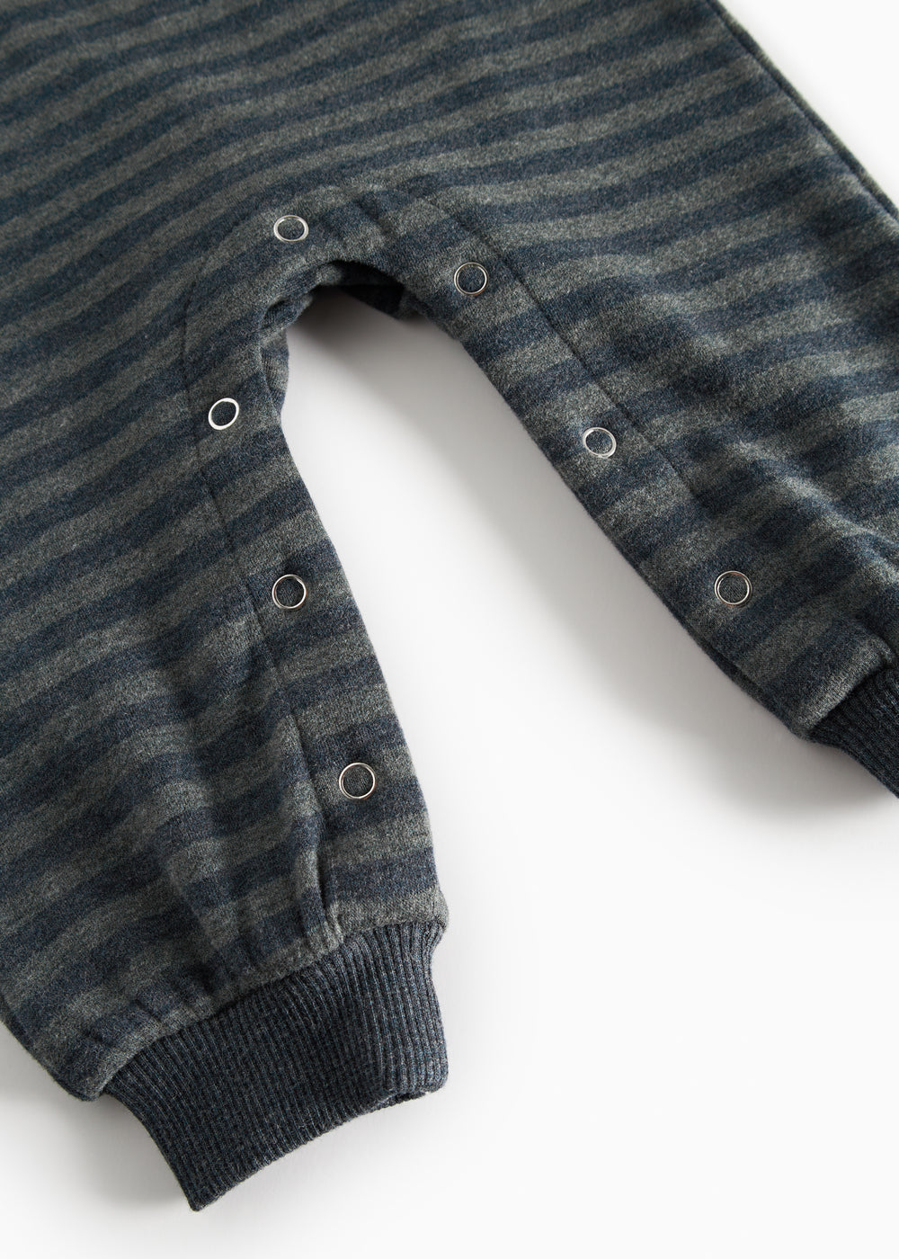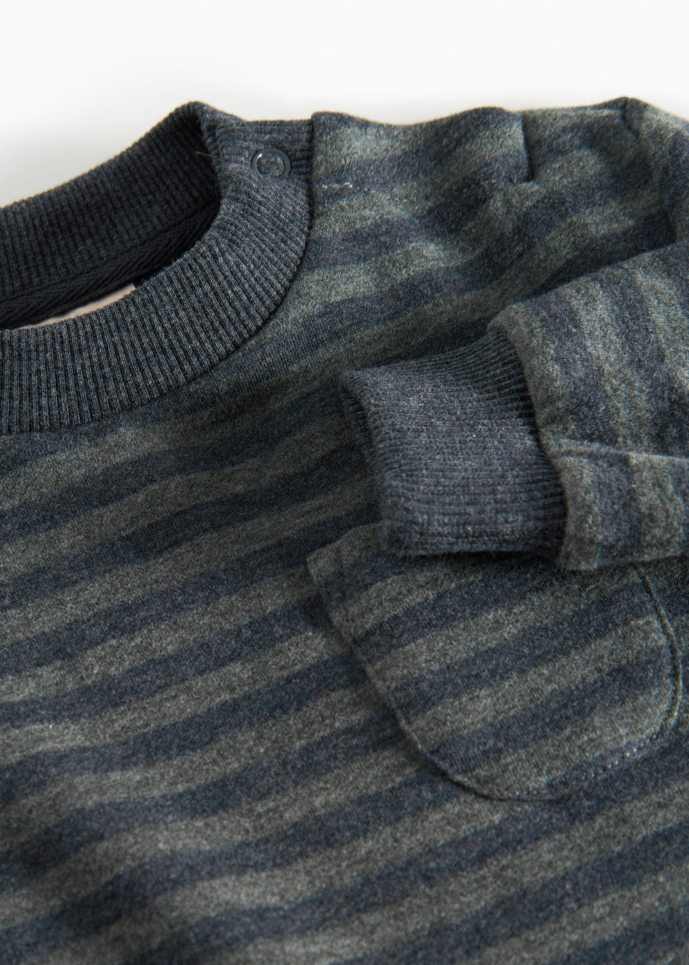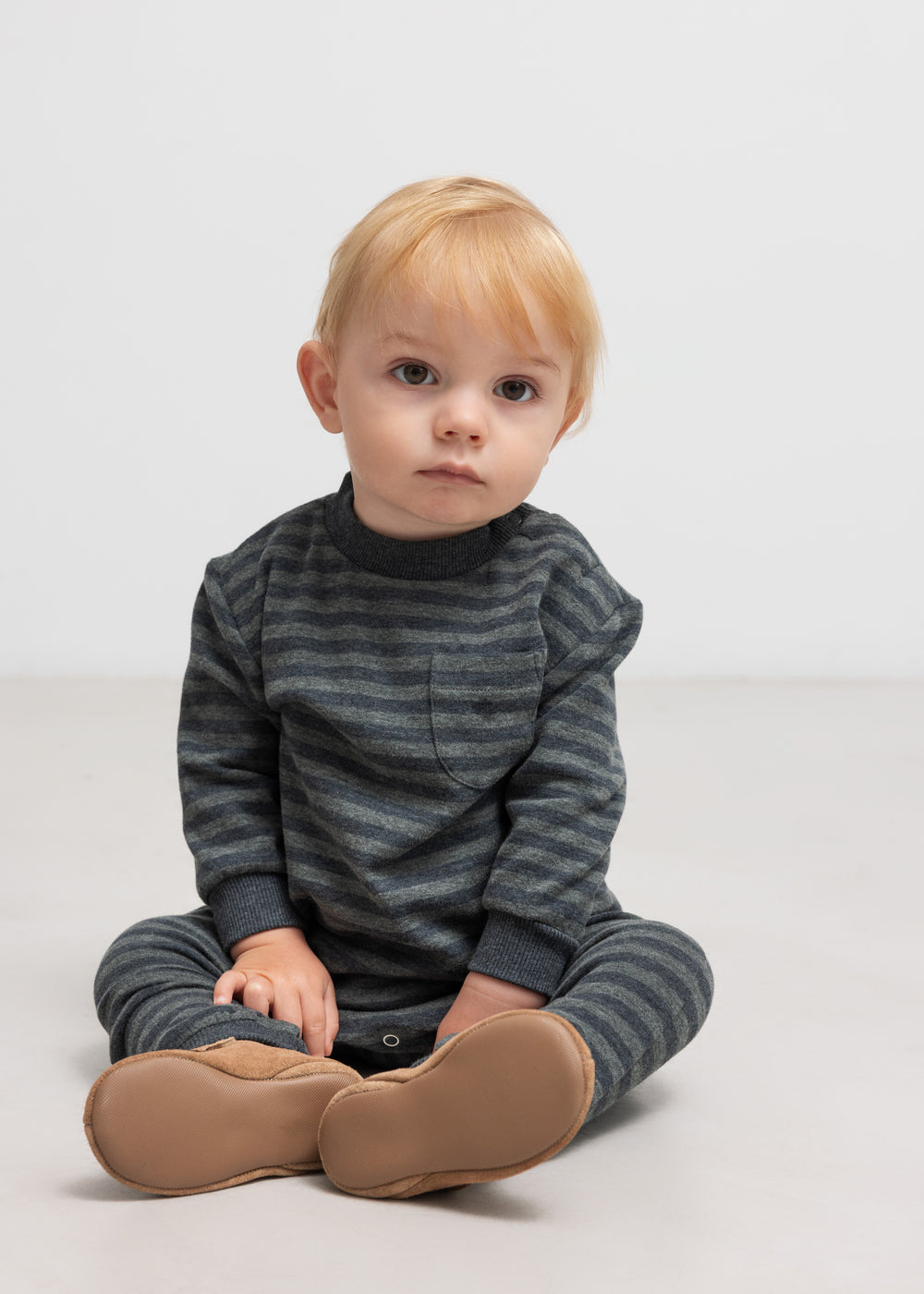 Soft long-sleeved jumpsuit with ribbed neck, sleeves and legs. The jumpsuit has a small pocket on the left chest and closes with snaps along the legs for easy diaper changes. The jumpsuit is very soft and comfortable to wear.