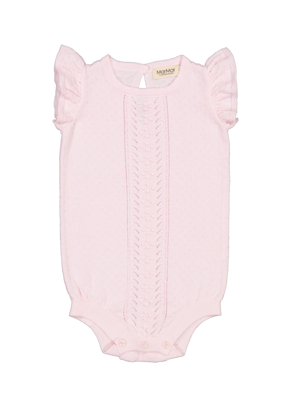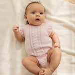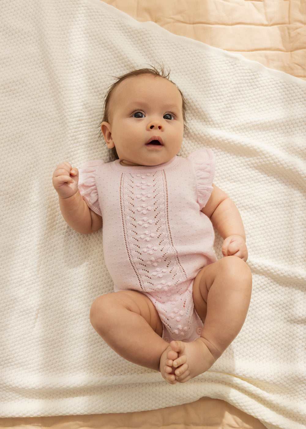 Short-sleeved bodystocking with fine ruffle details on the sleeve, pointelle/lace details and button closure at the back and between the legs for easier diaper changes.