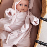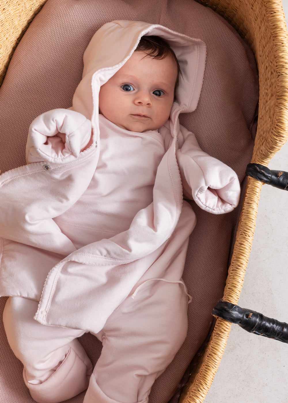The jumpsuit has smart fold-over options on both hands and feet to keep your little one warm.