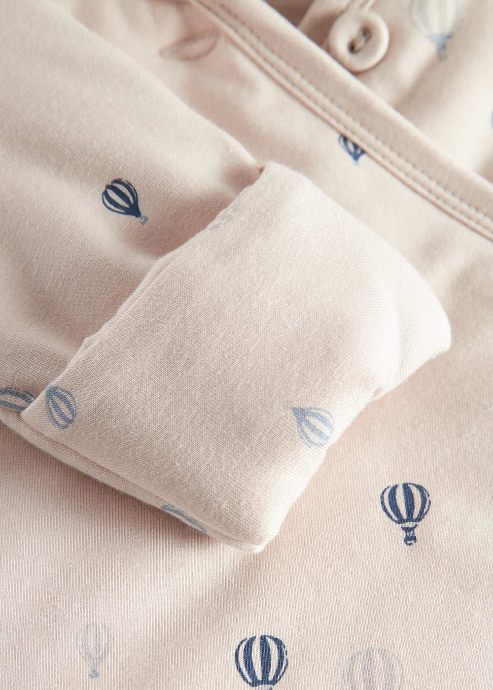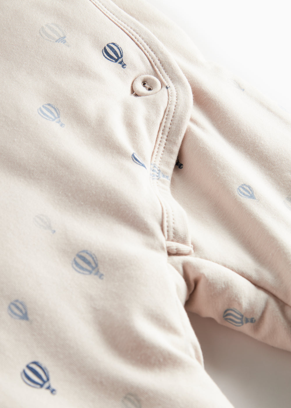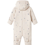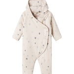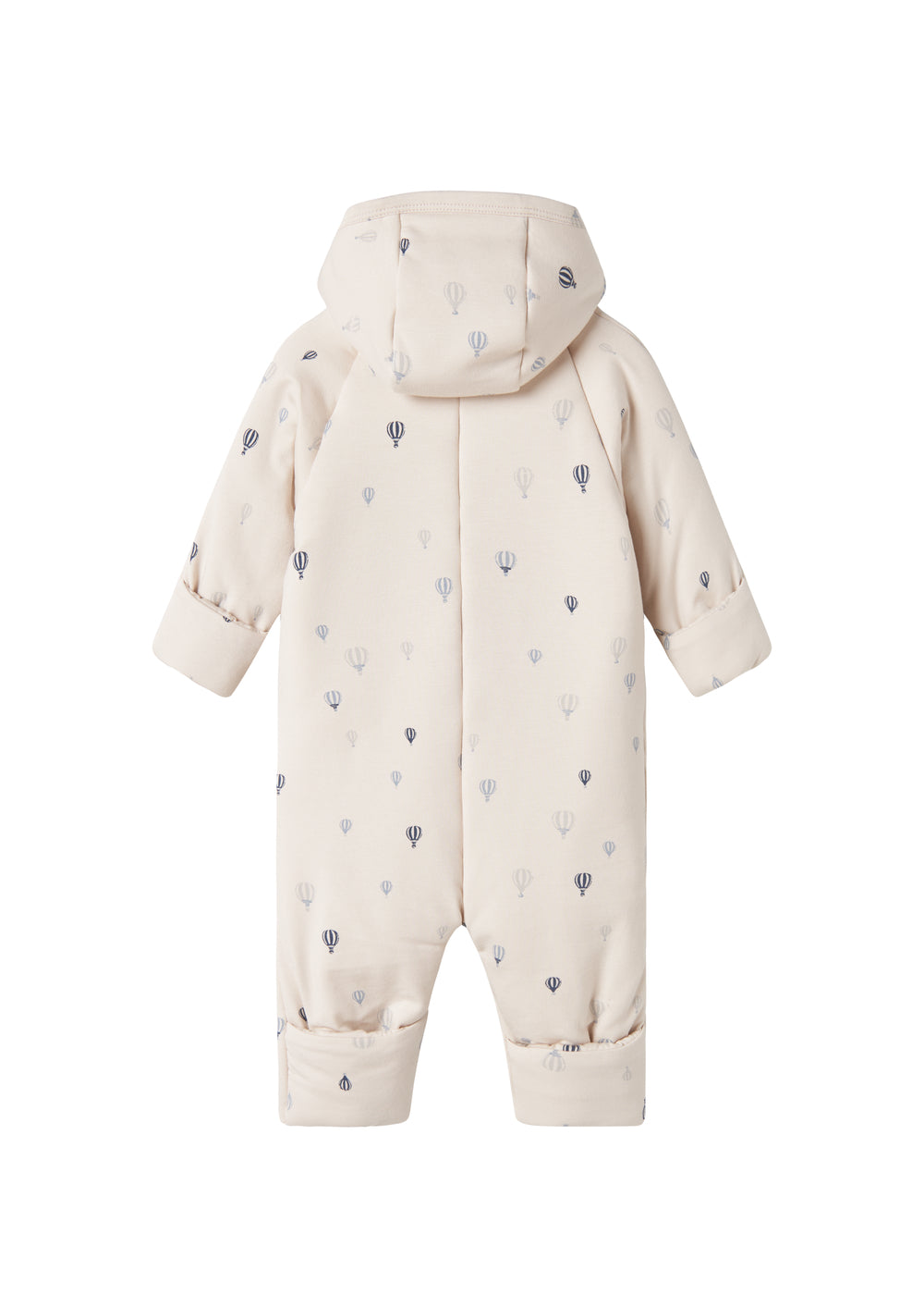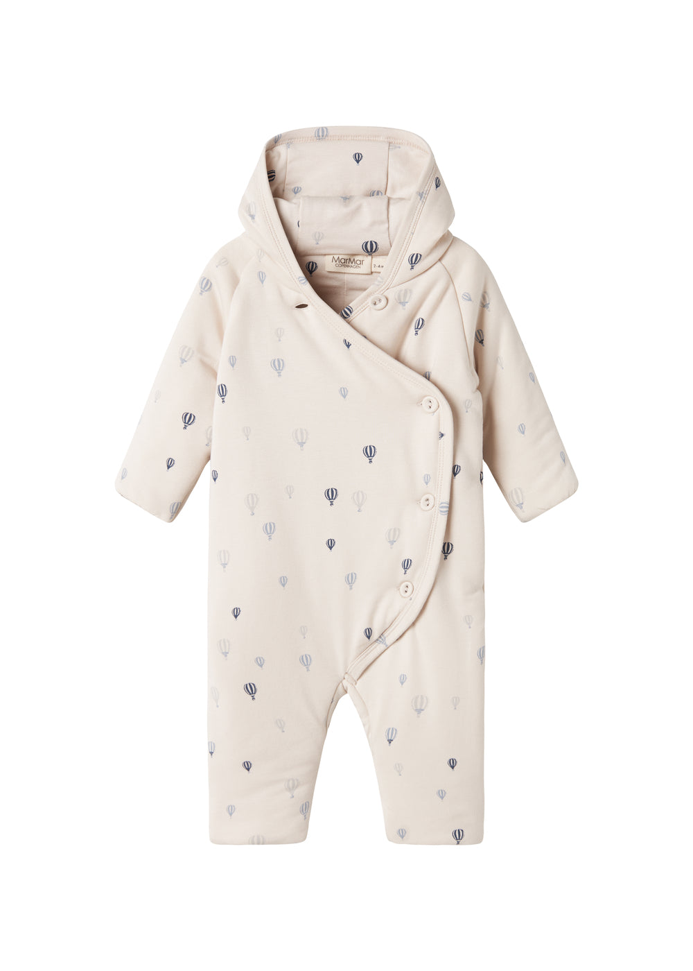 Warm padded jumpsuit for newborns with hood and button closure. The jumpsuit has a smart fold-over option on both hands and feet to keep the little one warm. The jumpsuit has a nice print and is both soft, stretchy and comfortable to wear.