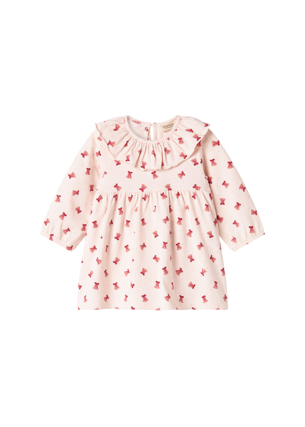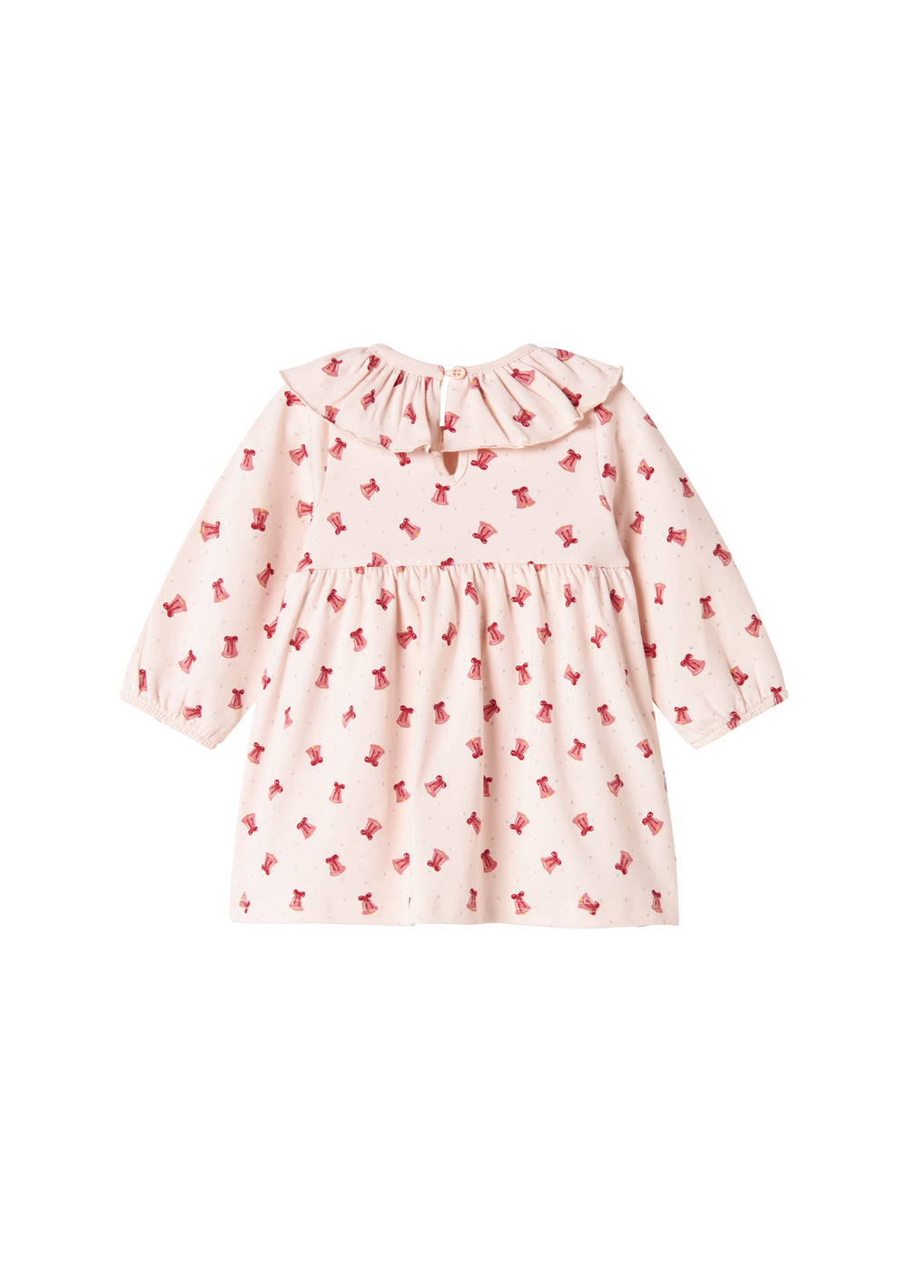 Long-sleeved baby dress with a nice collar and bodystocking with press-stud closure inside. The dress has a nice print and picot edges and is both soft, stretchy and comfortable to wear.