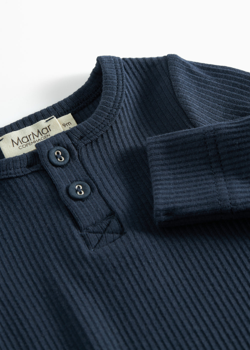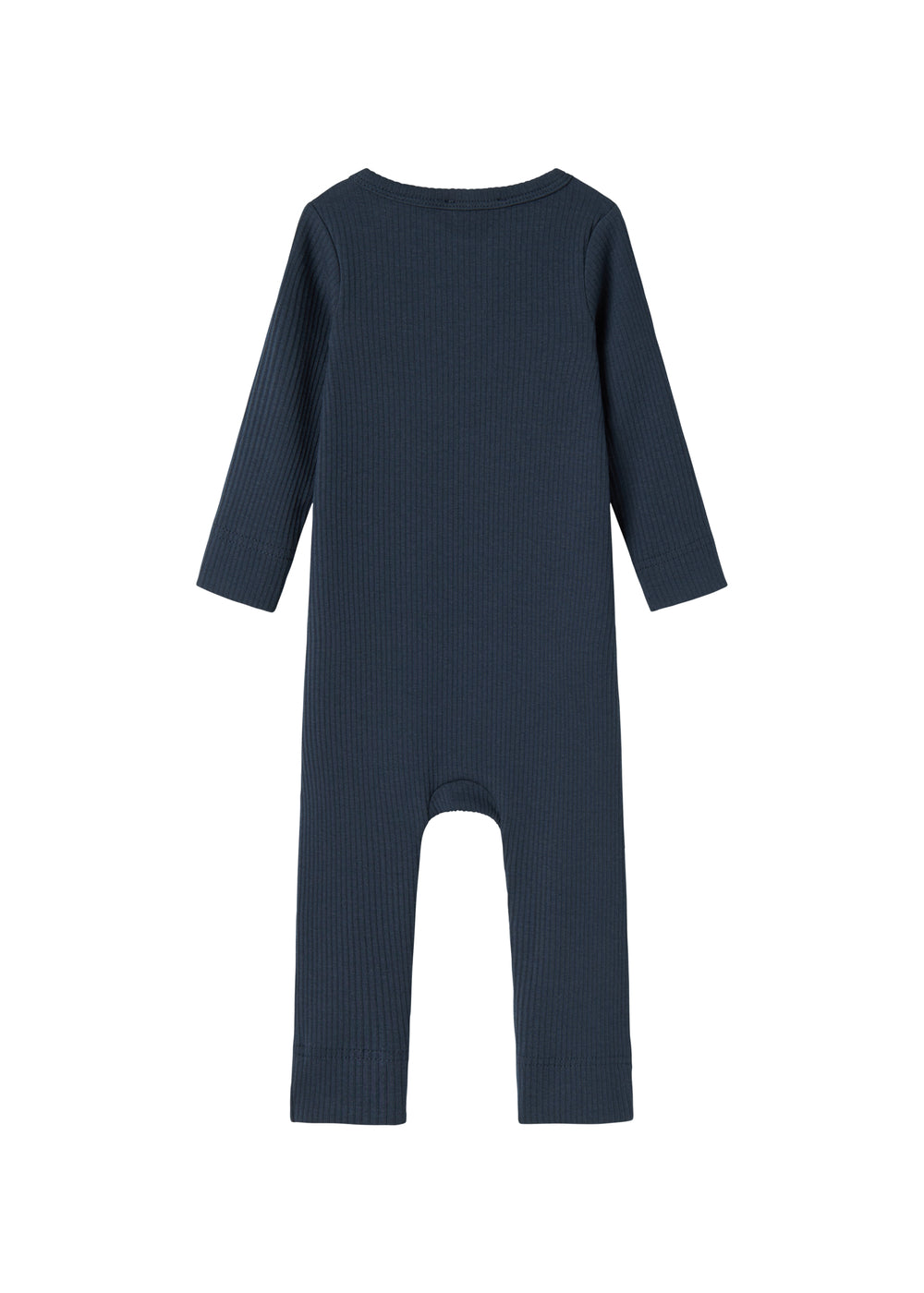 Baby jumpsuit with placket button closure that is closed with snaps between the legs for easy diaper changes. The jumpsuit is ribbed, soft, stretchy and comfortable to wear.