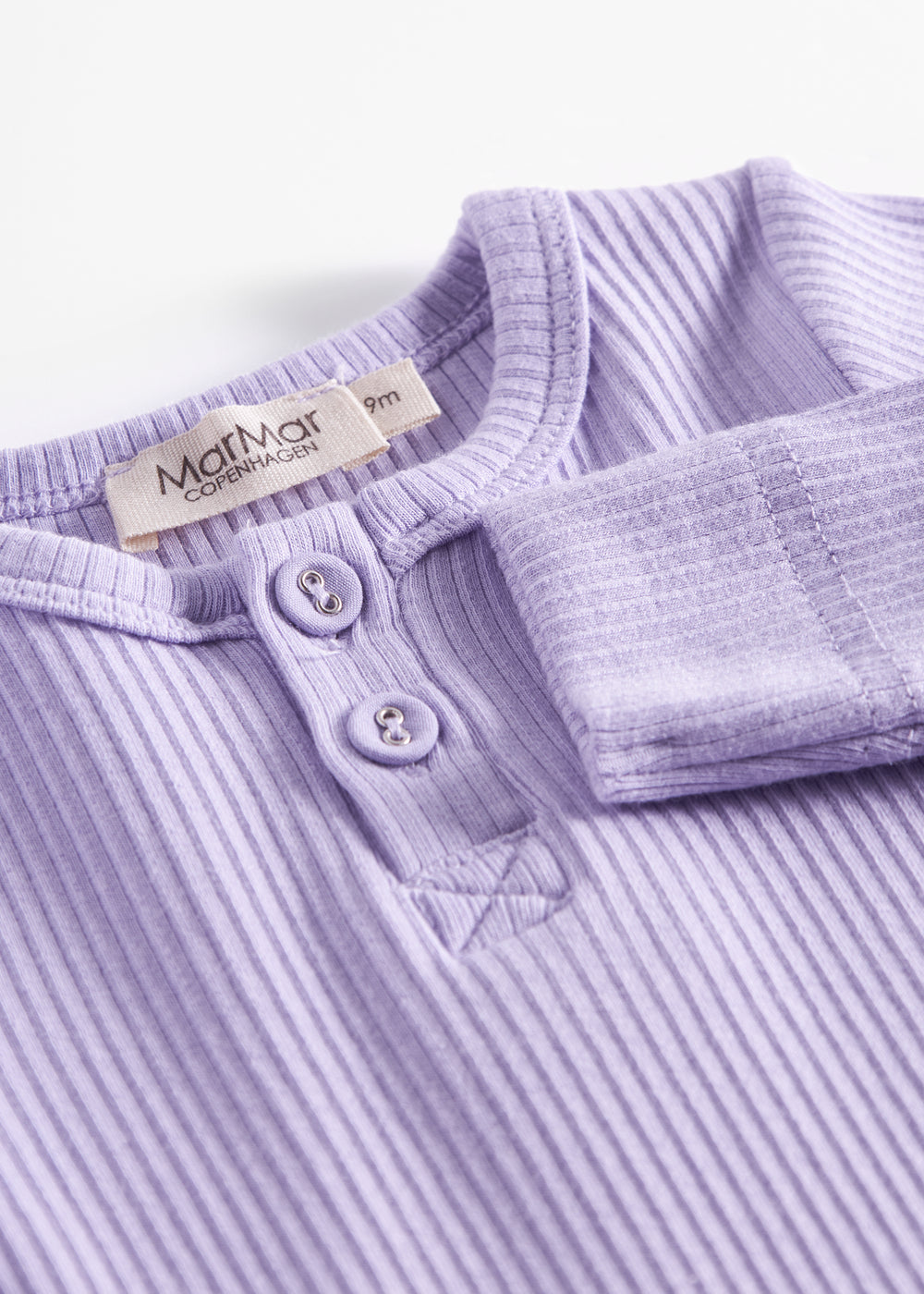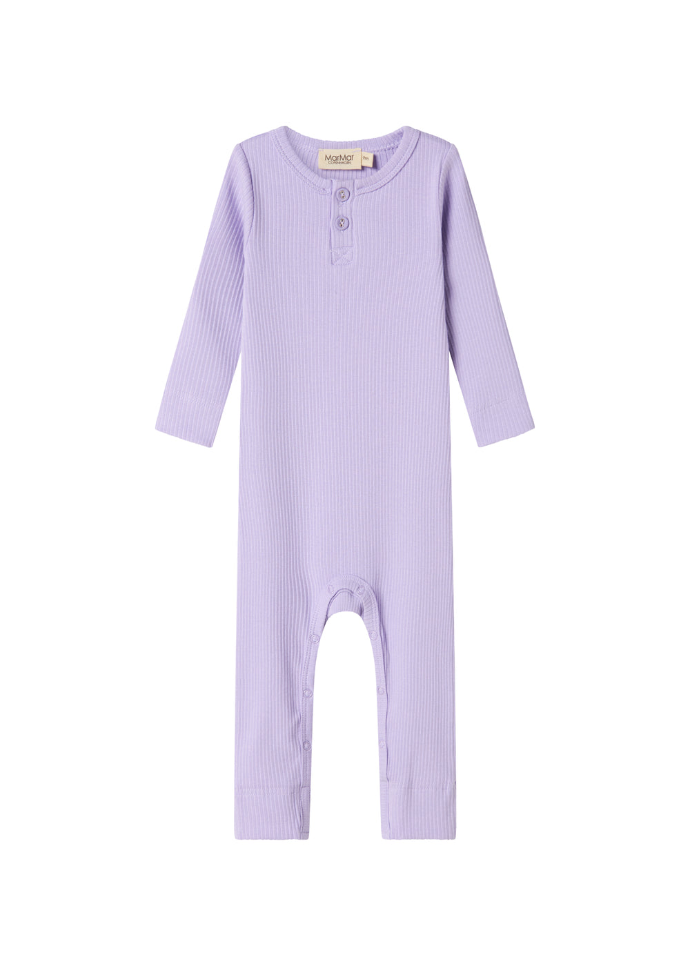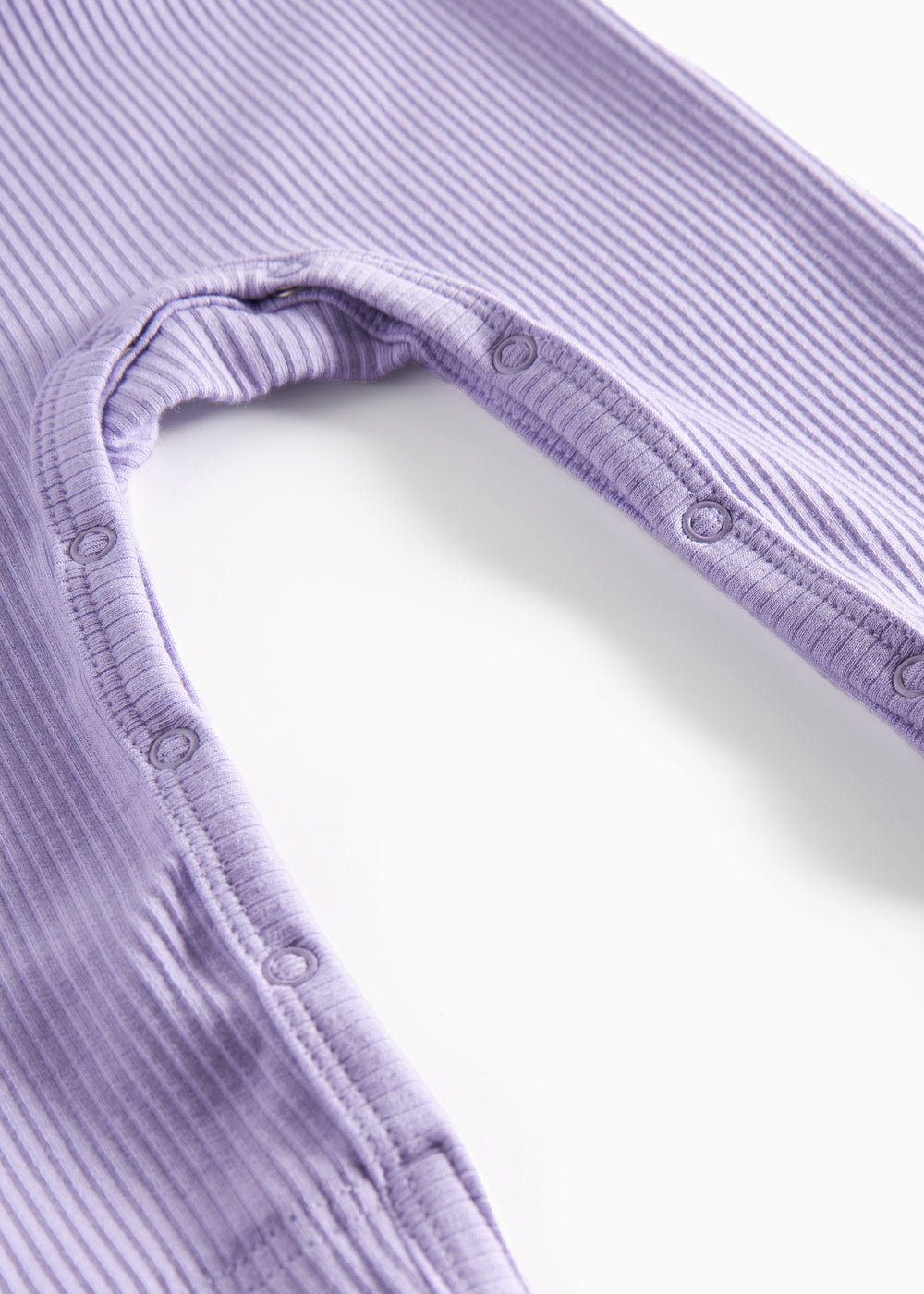 Baby jumpsuit with placket button closure that is closed with snaps between the legs for easy diaper changes. The jumpsuit is ribbed, soft, stretchy and comfortable to wear.