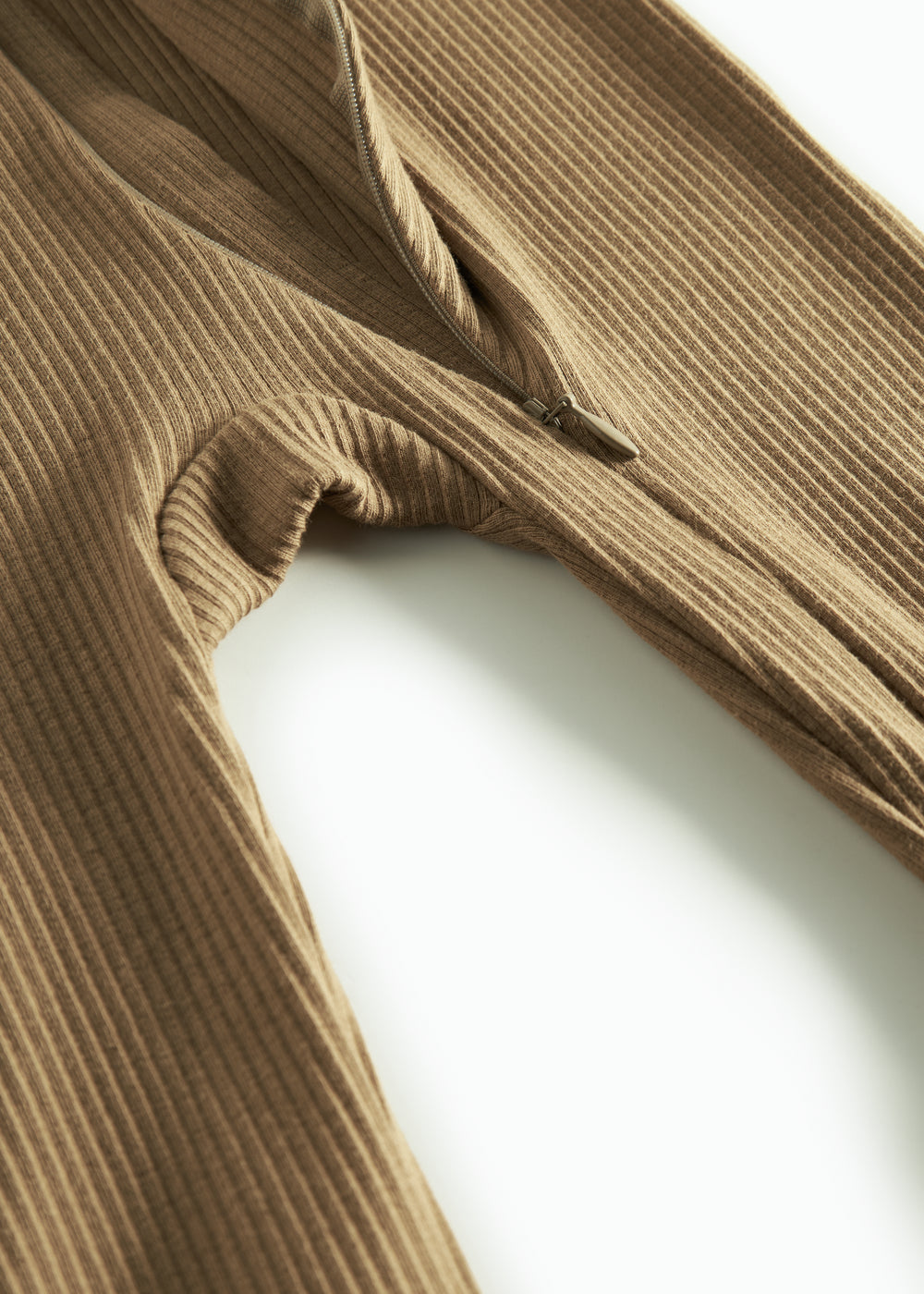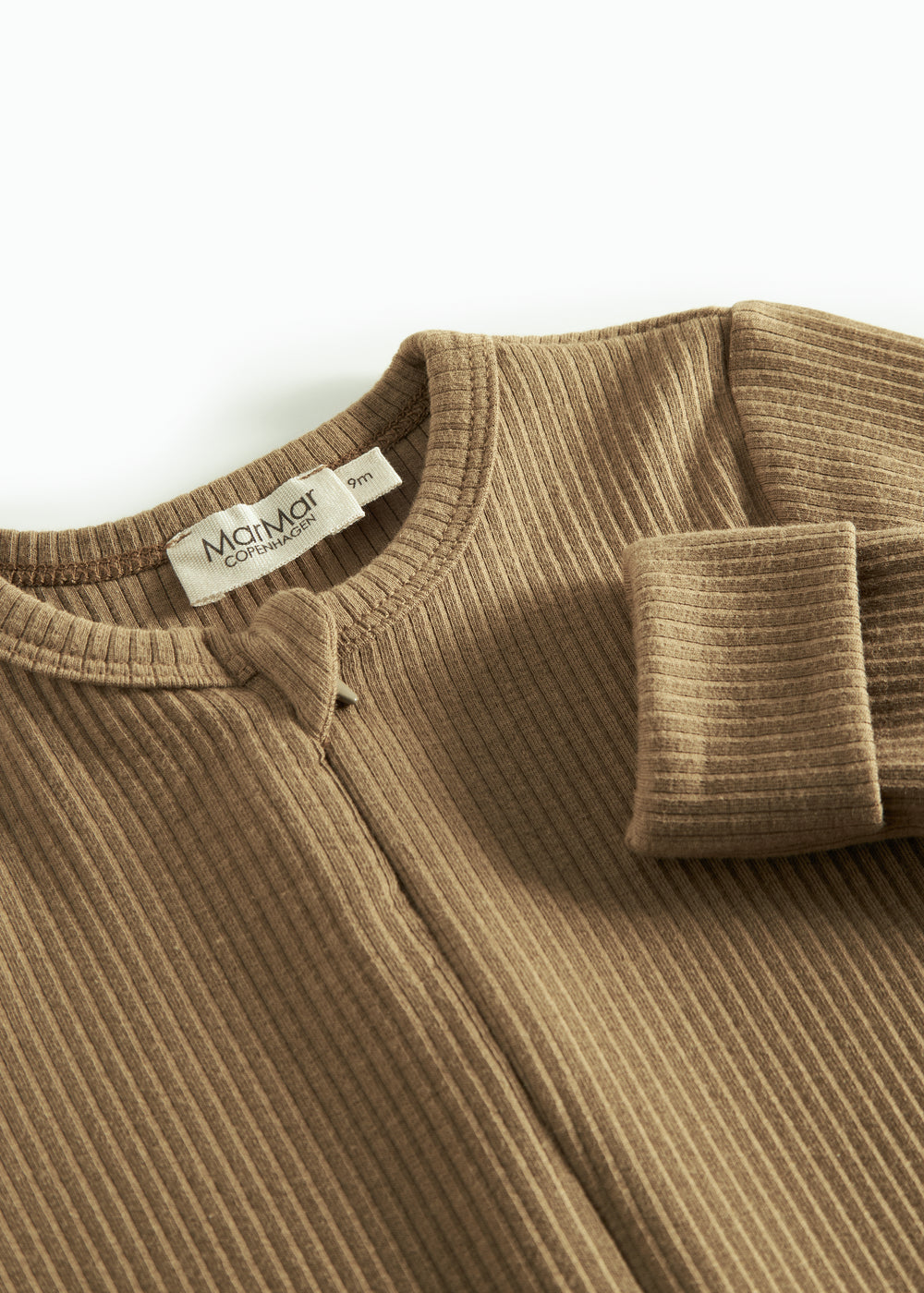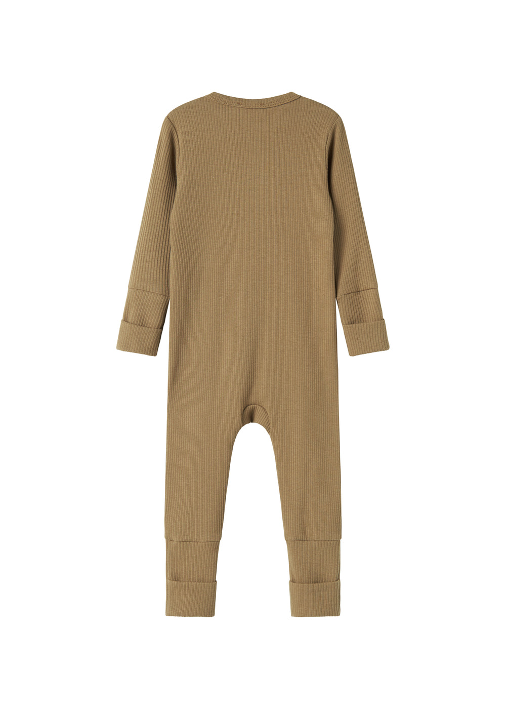Simple long-sleeved jumpsuit that can be zipped all the way from the neck down one leg with a zipper for easy diaper changes. The jumpsuit has pleats at both sleeves and legs, which can be adjusted as the child grows. The jumpsuit also has a foldable mitten/sock function from size 2-4M. The jumpsuit is ribbed, soft, stretchy and comfortable to wear.