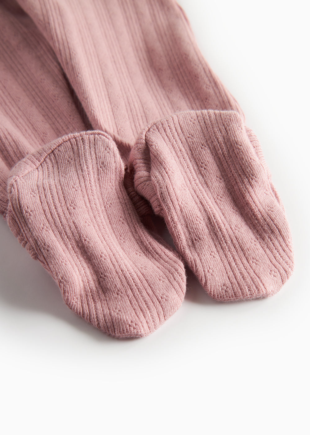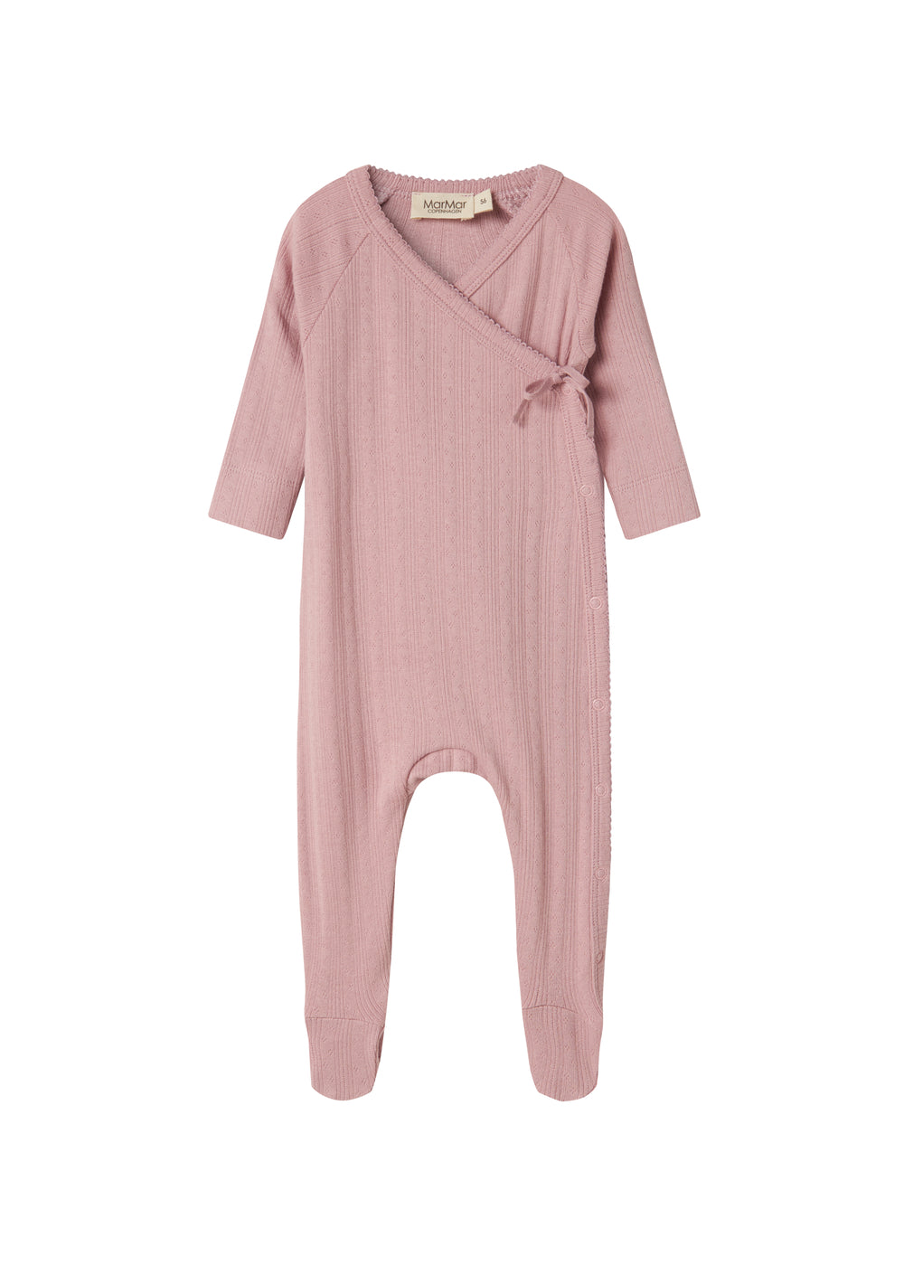 Long-sleeved pointelle onesie with feet for newborns. The onesie has a wrap-around closure, picot edges and closes with snaps and ties from the neck down one leg. The onesie is soft, stretchy and comfortable to wear.