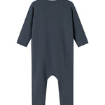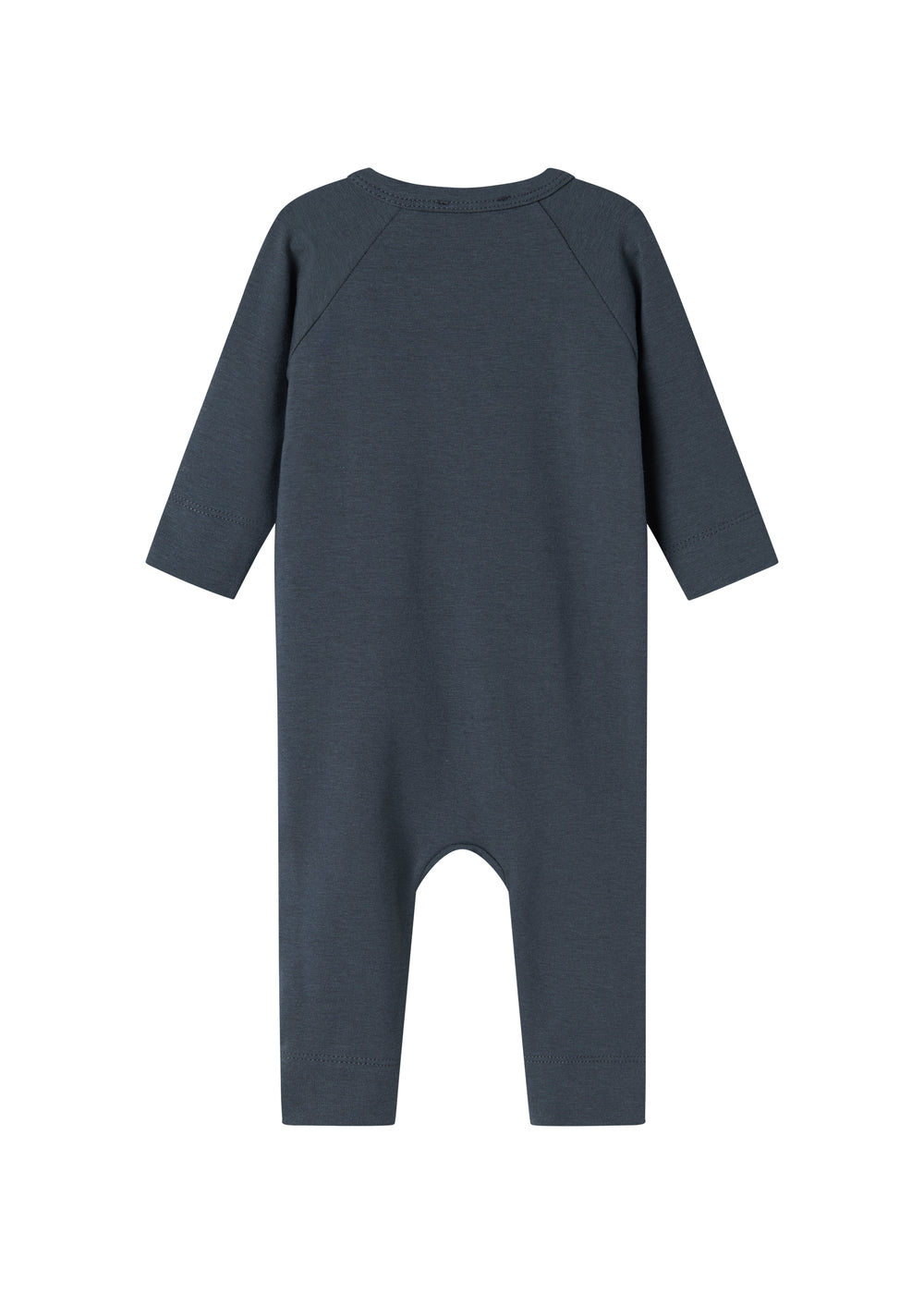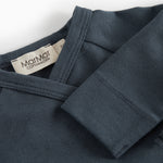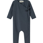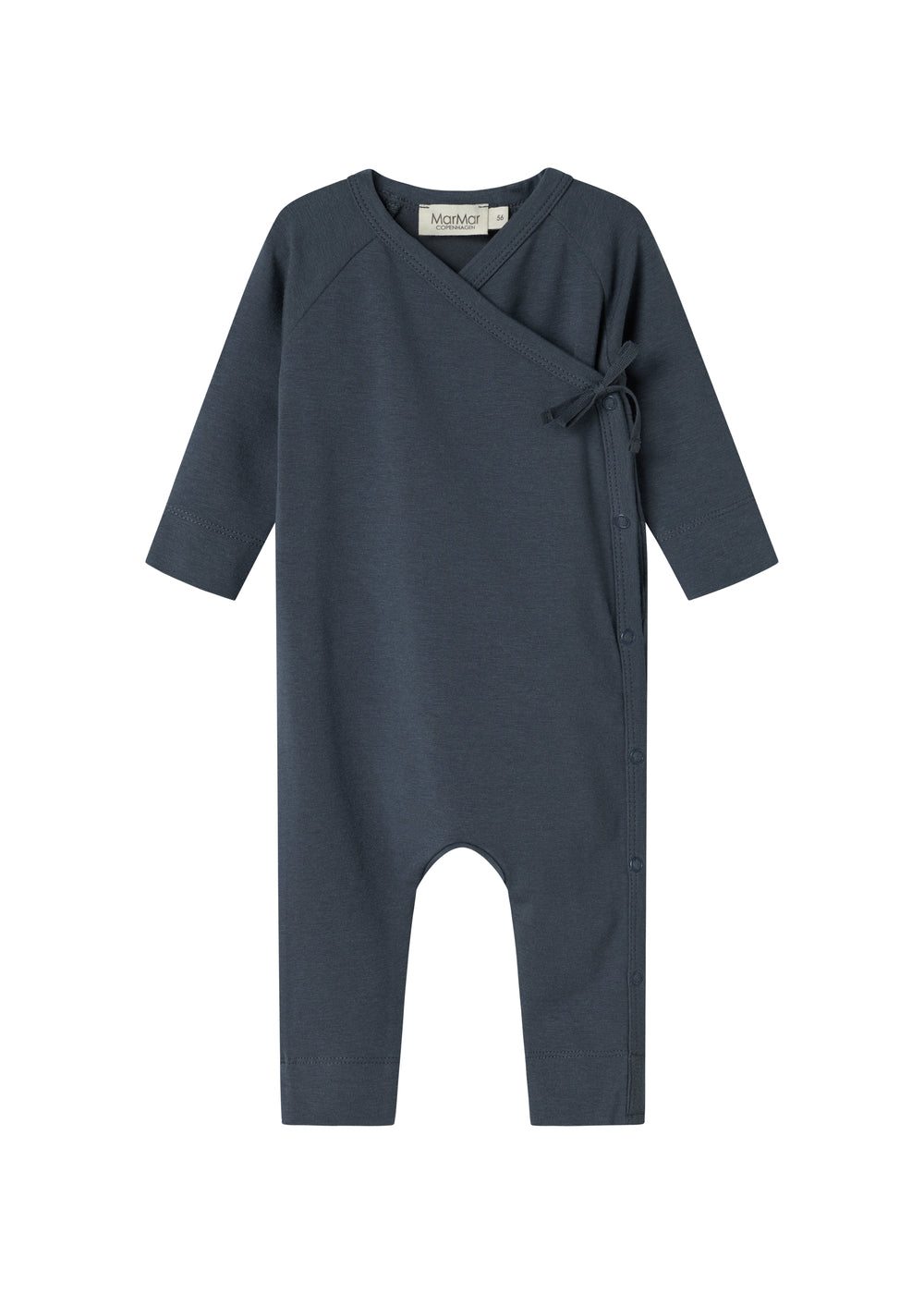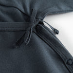 Long-sleeved jumpsuit with wrap-around closure, the jumpsuit closes with snaps and ties from the neck down one leg.