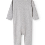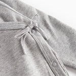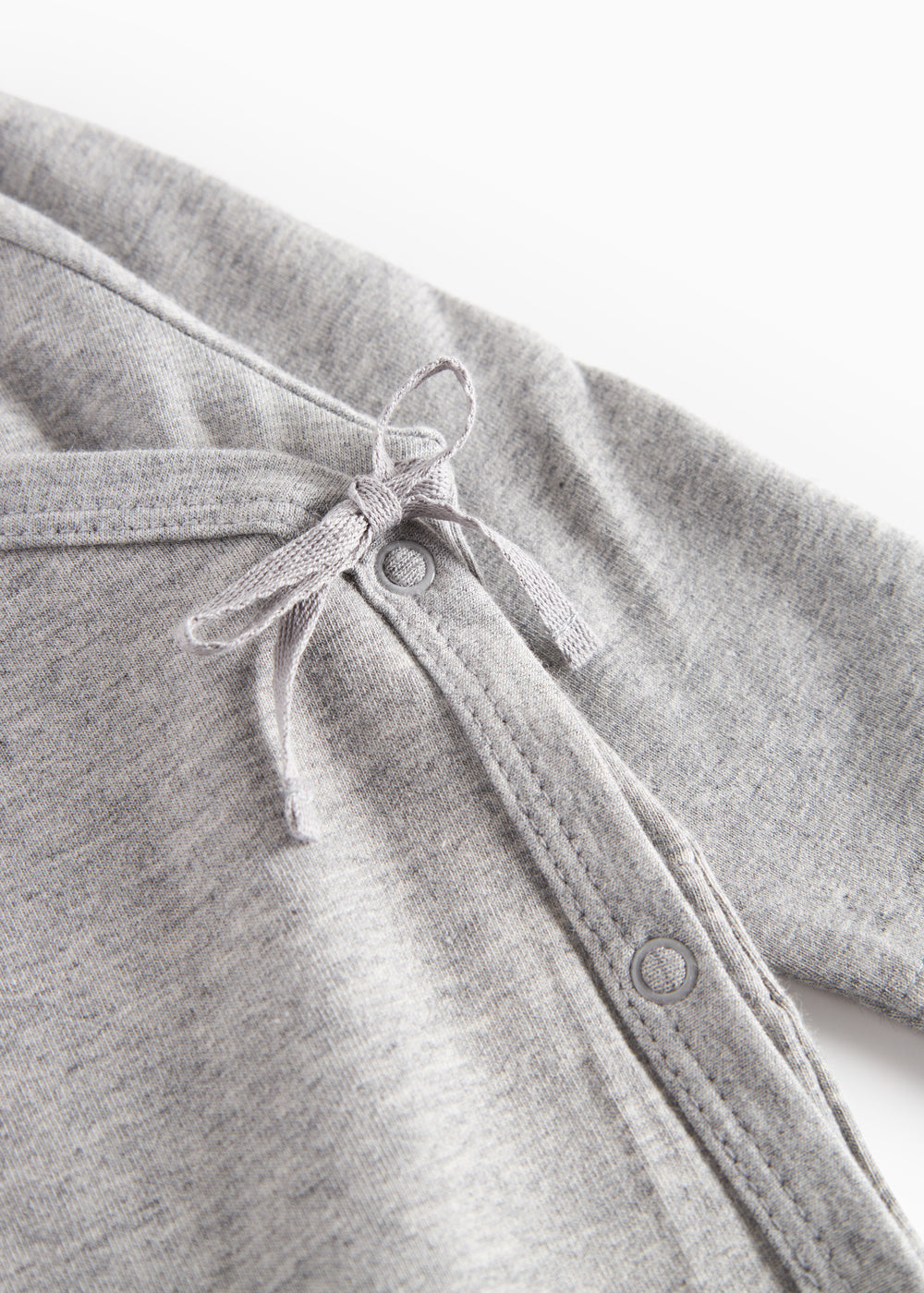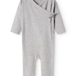 Long-sleeved jumpsuit with wrap-around closure, the jumpsuit closes with snaps and ties from the neck down one leg.