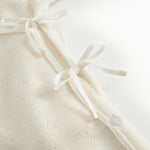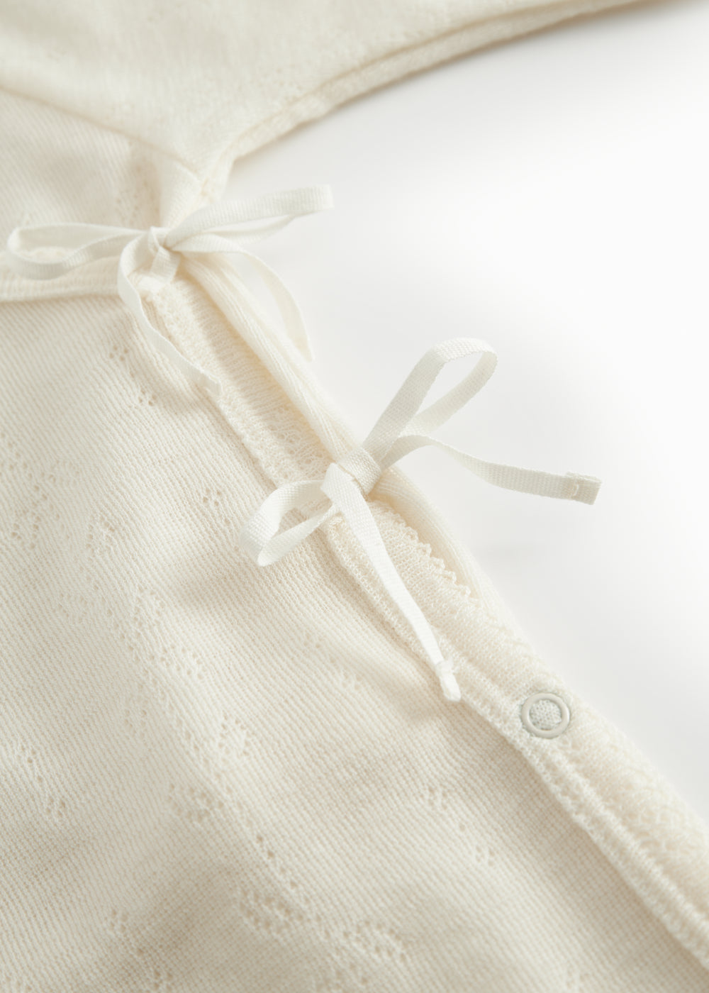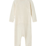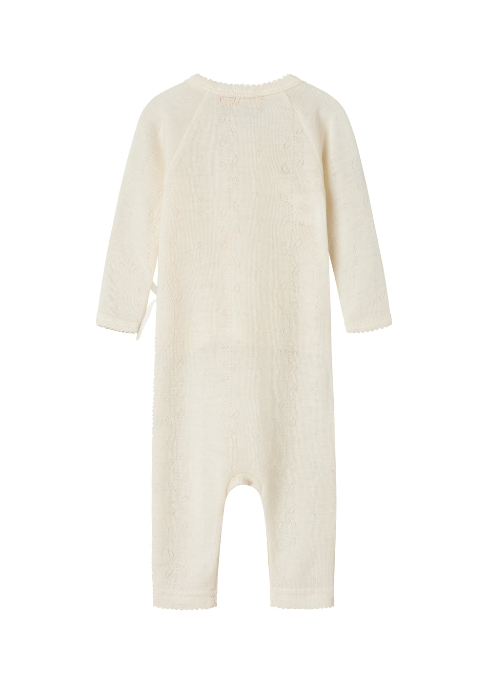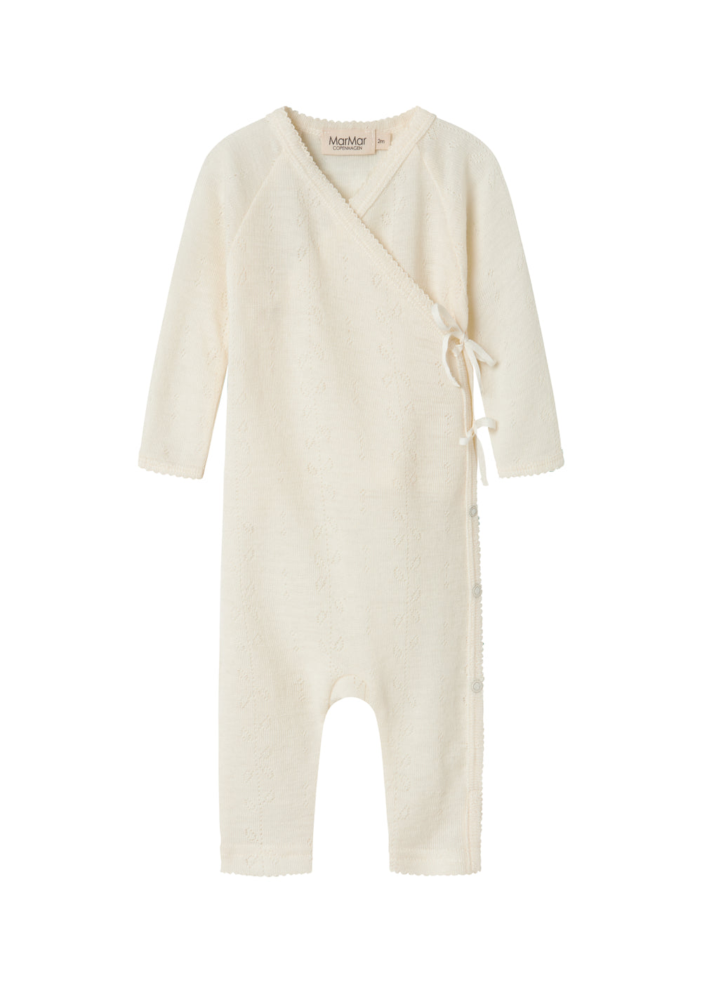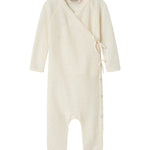 Long-sleeved jumpsuit for newborns. The jumpsuit has a wrap-around closure. Closes with snaps and ties.