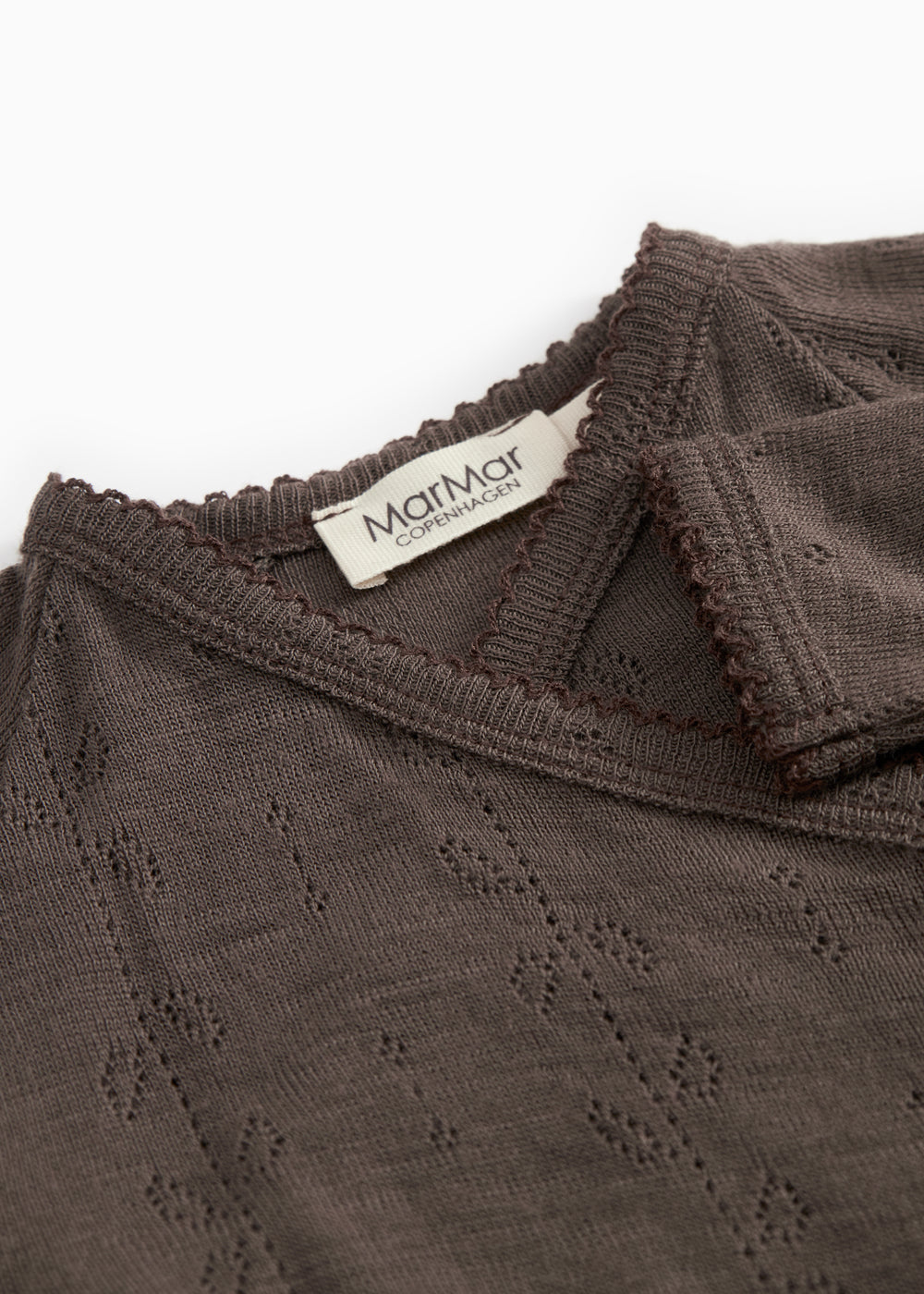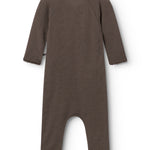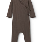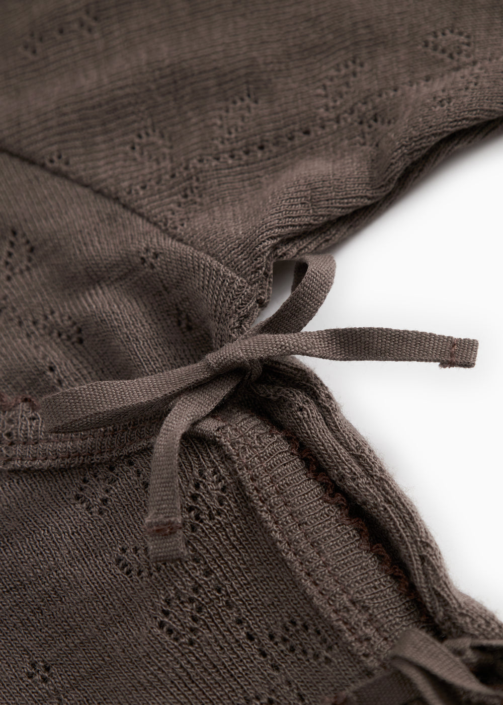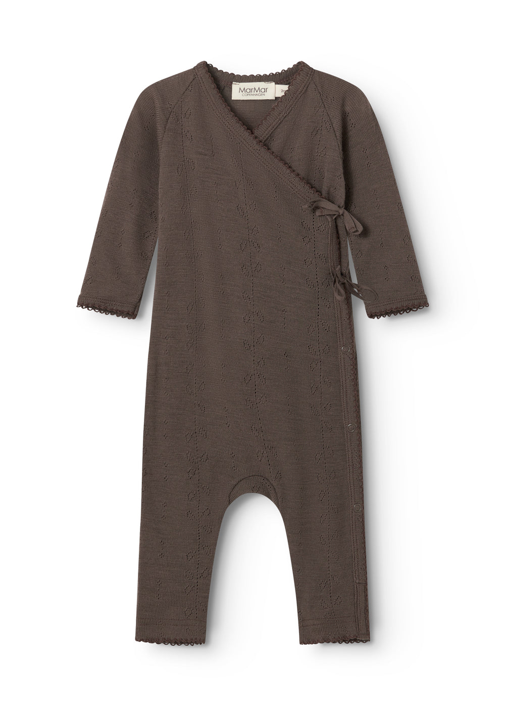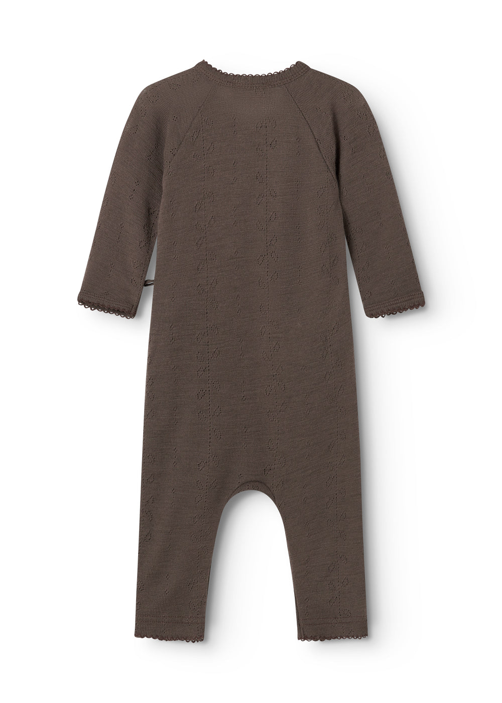 Baby jumpsuit in a very soft wool quality with a fine hole pattern. The jumpsuit has a wrap-around effect with snaps and ties.
