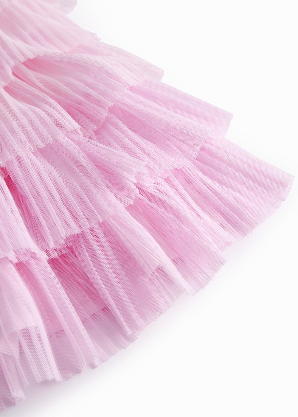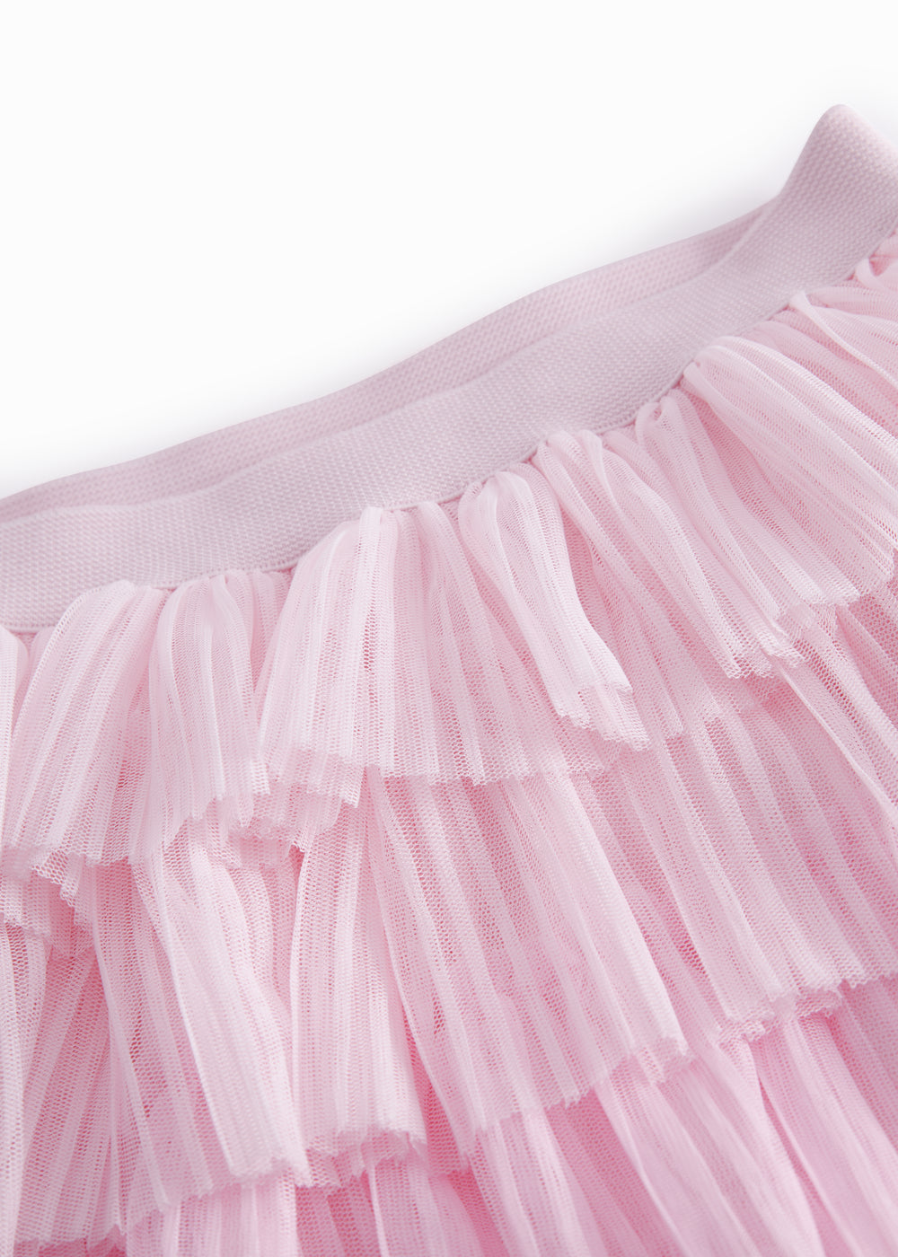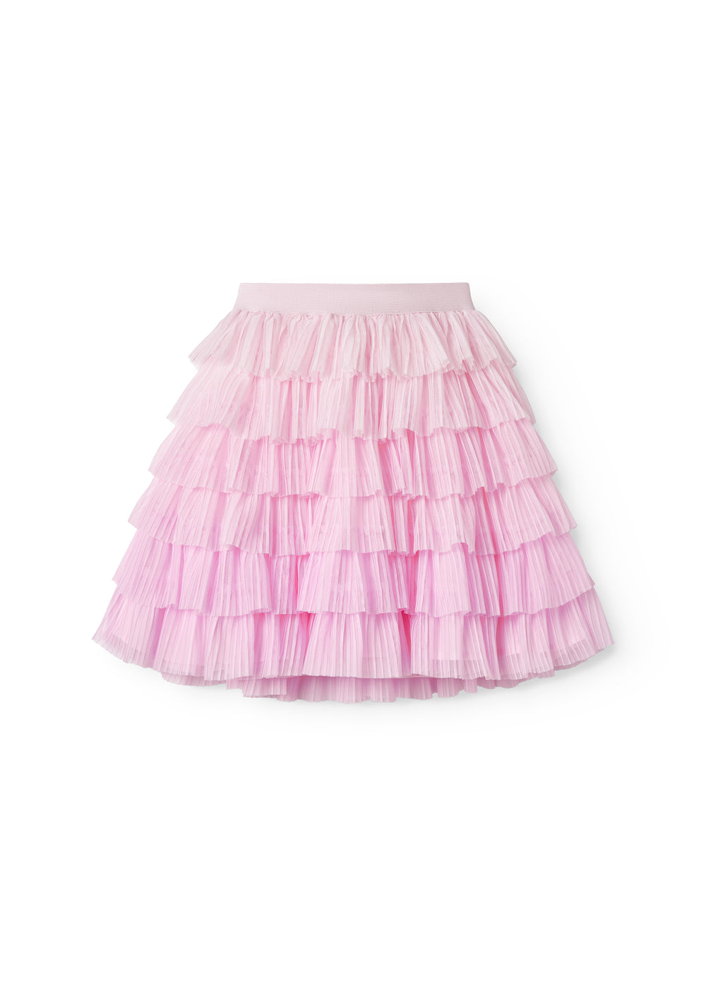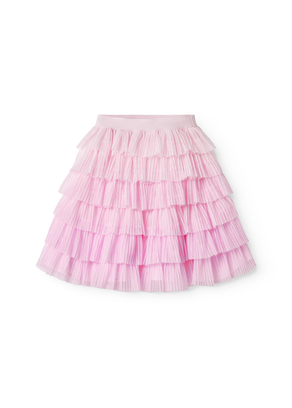 Festive skirt for children in light, pleated tulle with several layers. The skirt has elastic at the waist for a comfortable fit. The length of the skirt goes above the knee. The skirt is lined on the inside, so it feels soft against the skin while maintaining its light volume. The skirt is perfect for holidays and festive events.