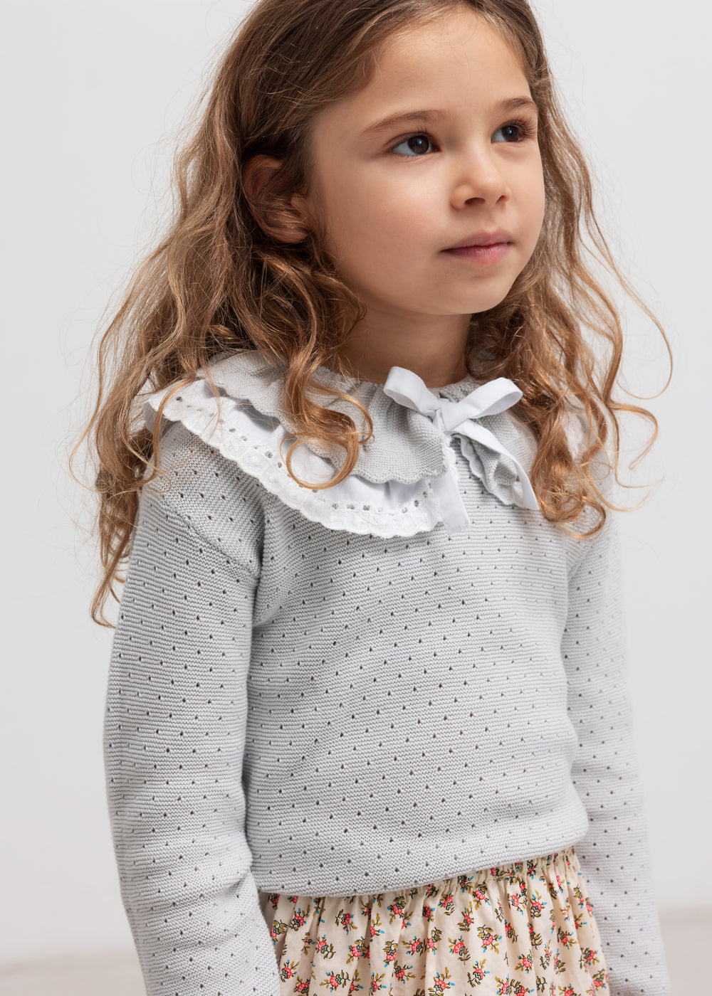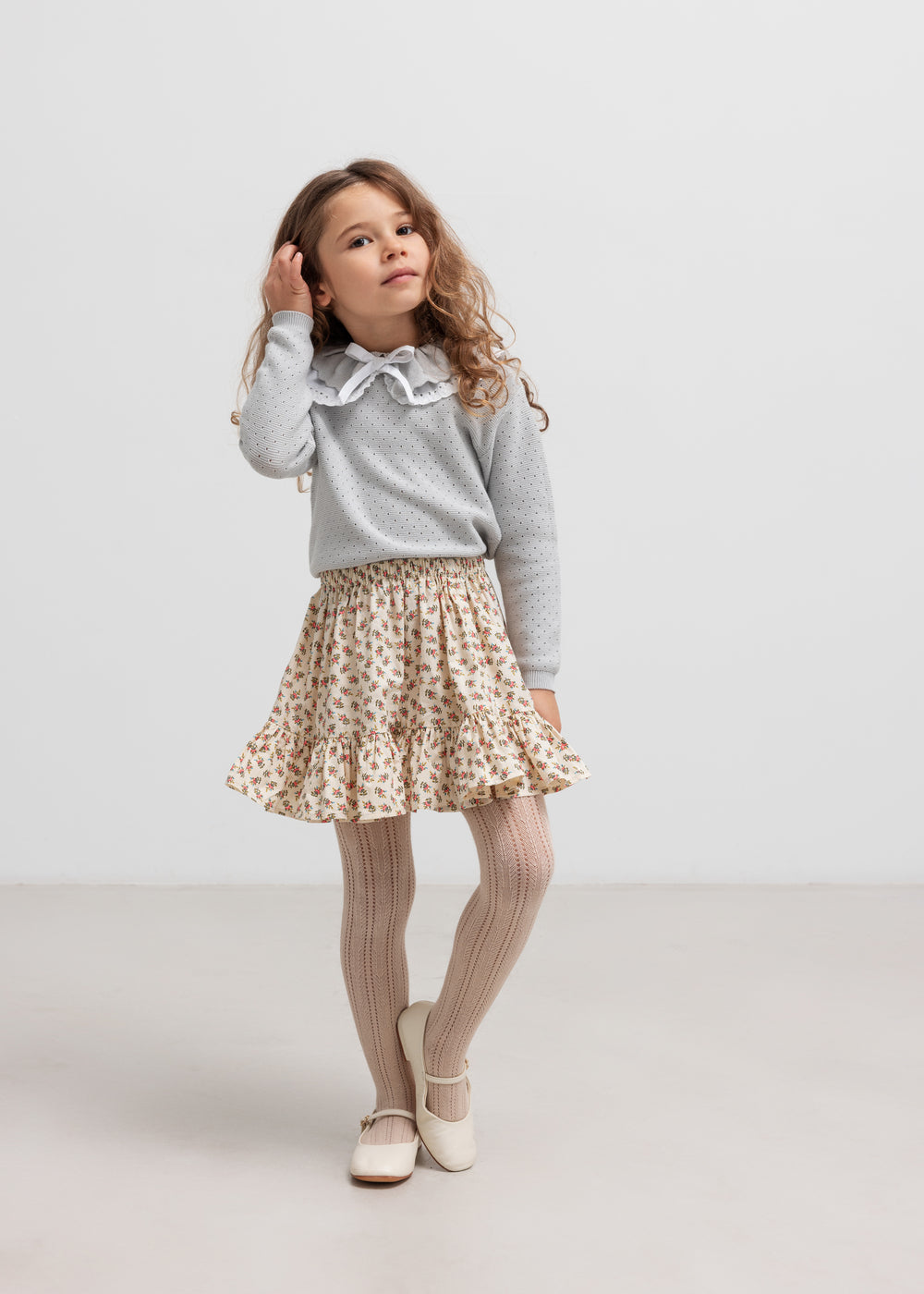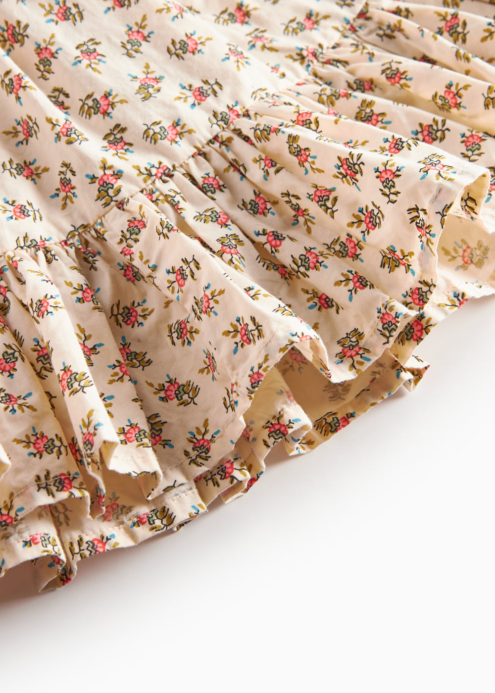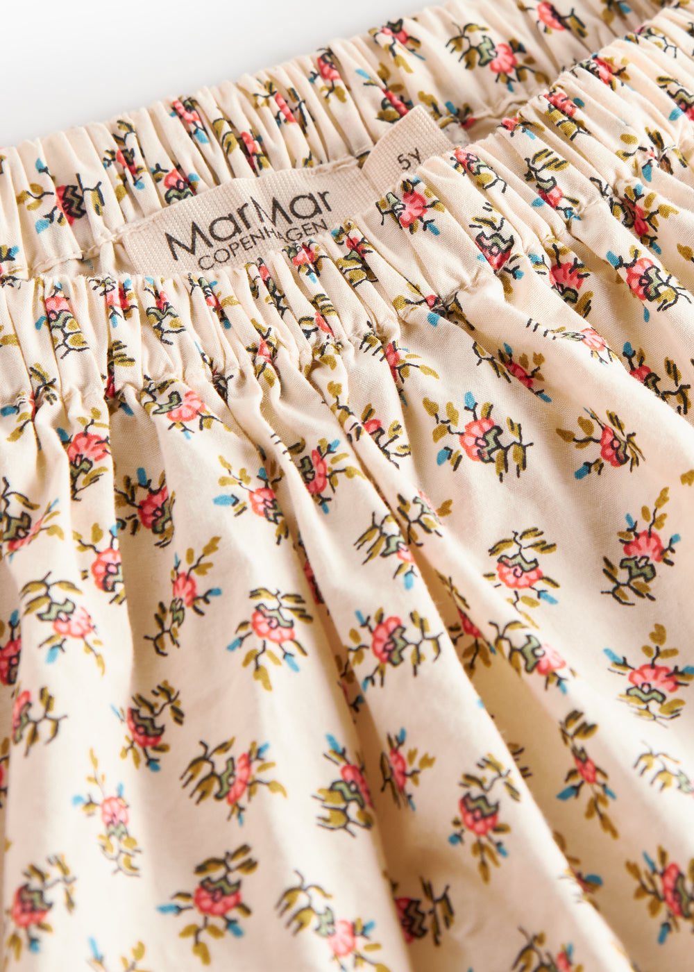 Loose-fitting skirt with a delicate hand-drawn floral print, wide ruffled hem and elastic at the waist for a comfortable fit. The length of the skirt goes above the knee. The skirt is both comfortable, light and airy to wear.
