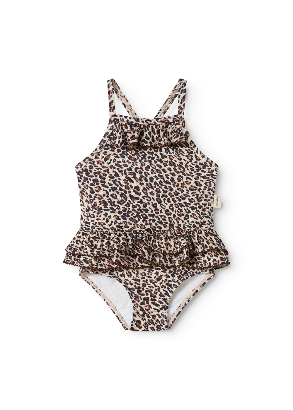Swimsuit for children with fine ruffle details, picot edges and a crossed back. The swimsuit has a nice leopard print.
