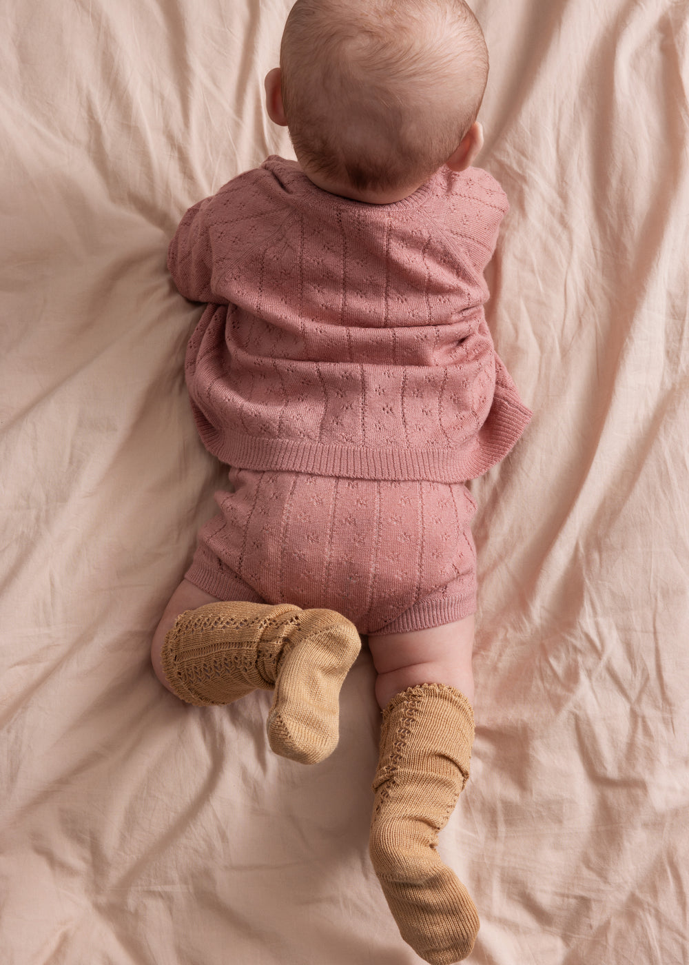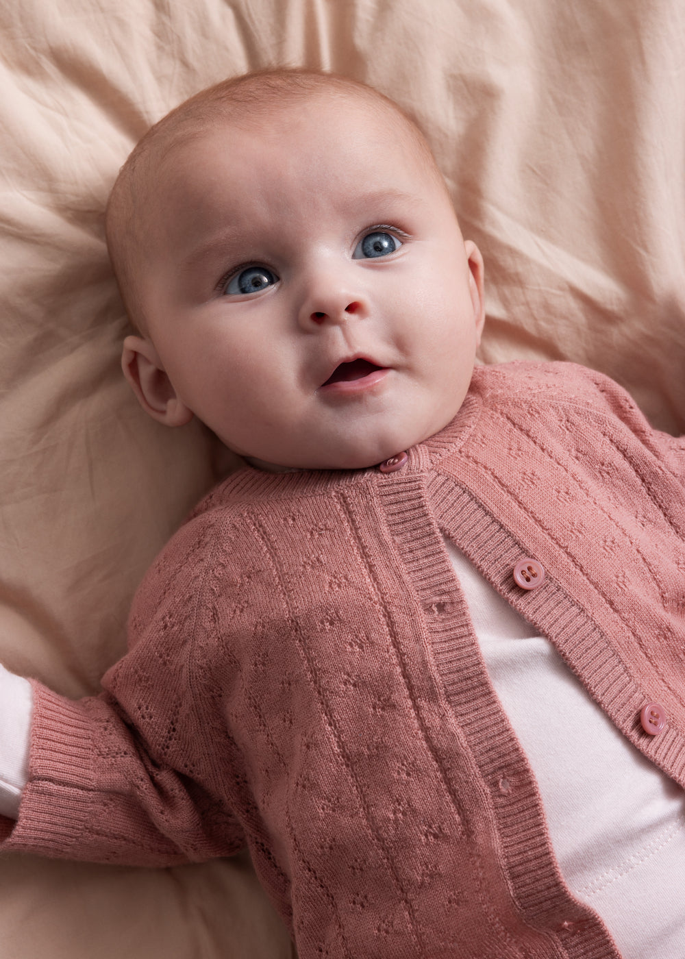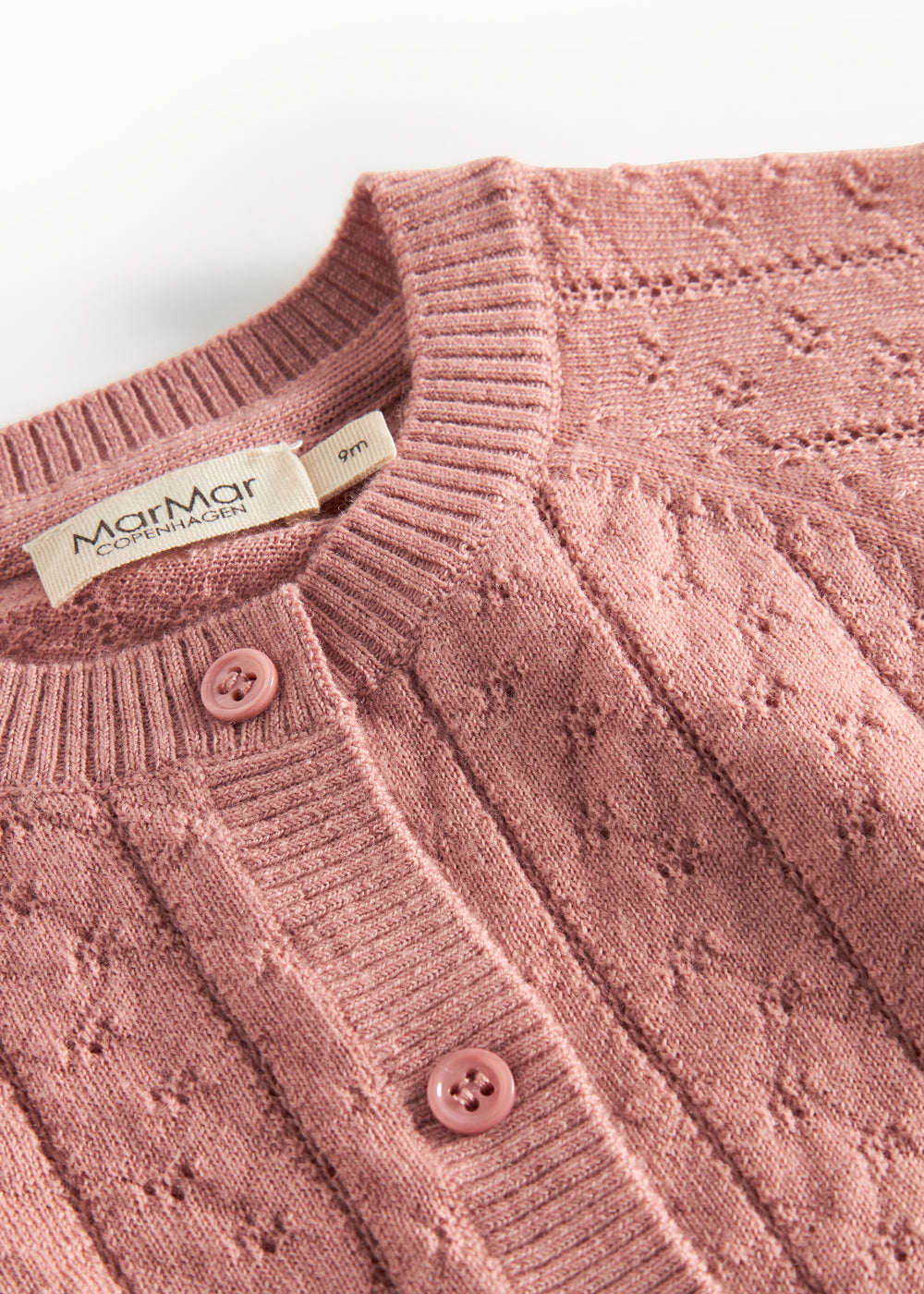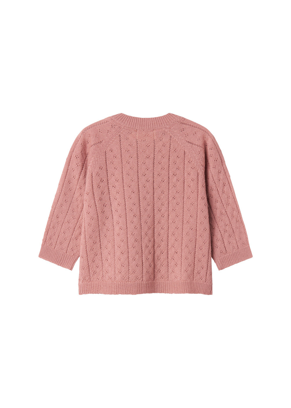Knit cardigan with button closure, pointelle details and rib details at the neck, sleeves and bottom for a comfortable fit. The cardigan is made of merino wool and is both warm, soft and comfortable to wear.