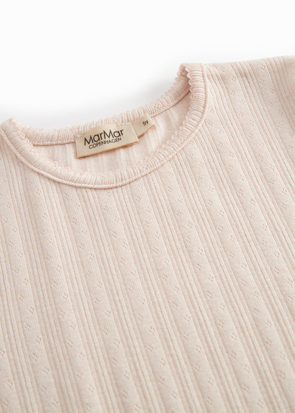 Simple short-sleeved pointelle t-shirt for children. The t-shirt is soft, stretchy and comfortable to wear.
