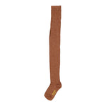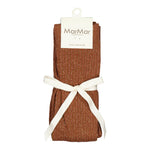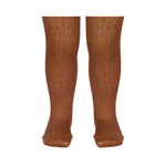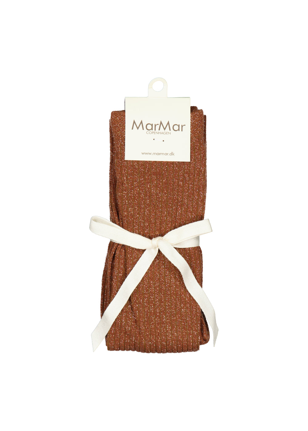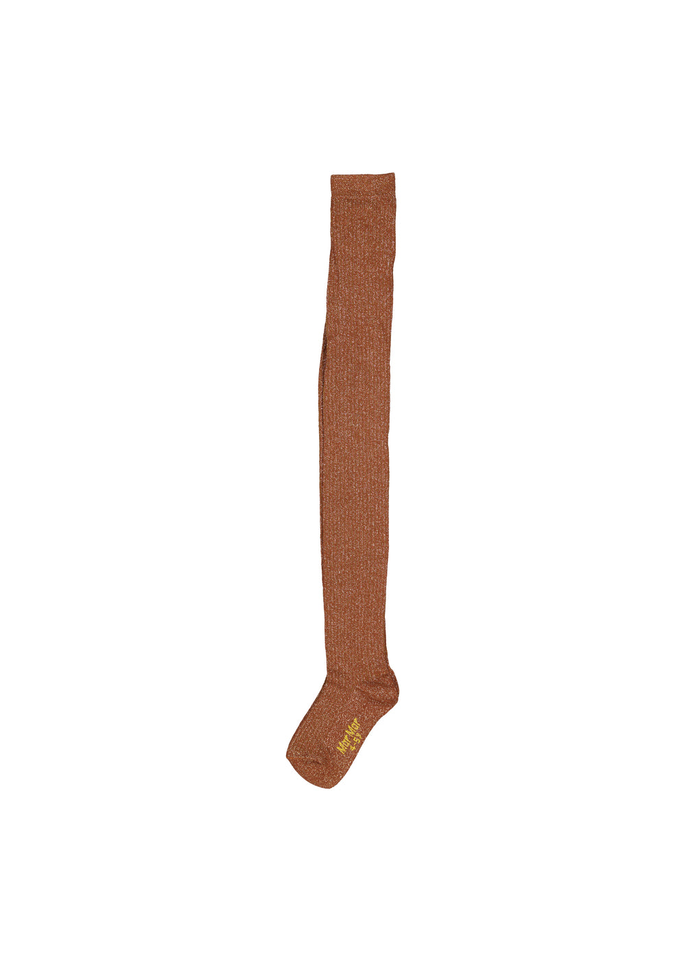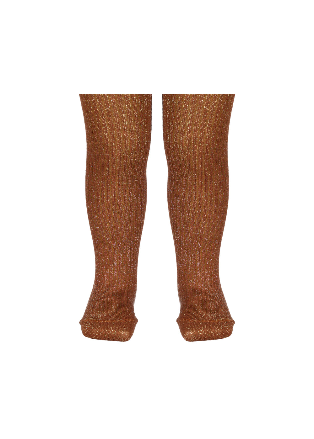 Tights with a reinforced heel and toe, which are stockinette-knit under the foot. The tights have a metallic look.