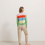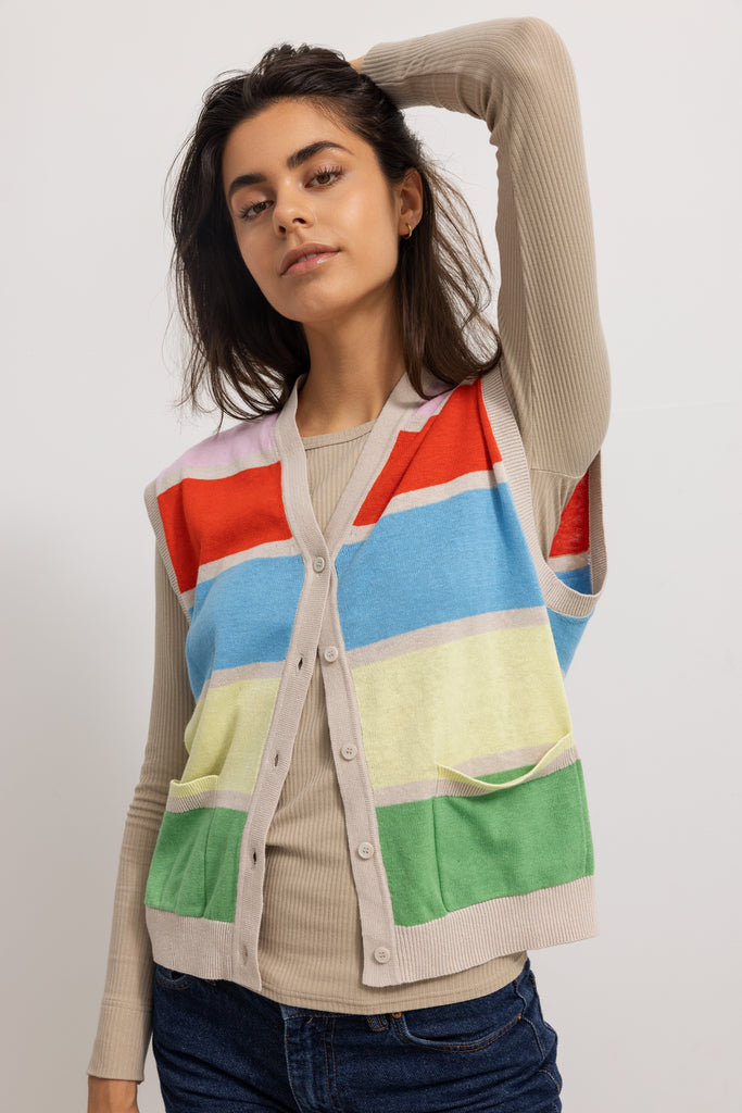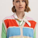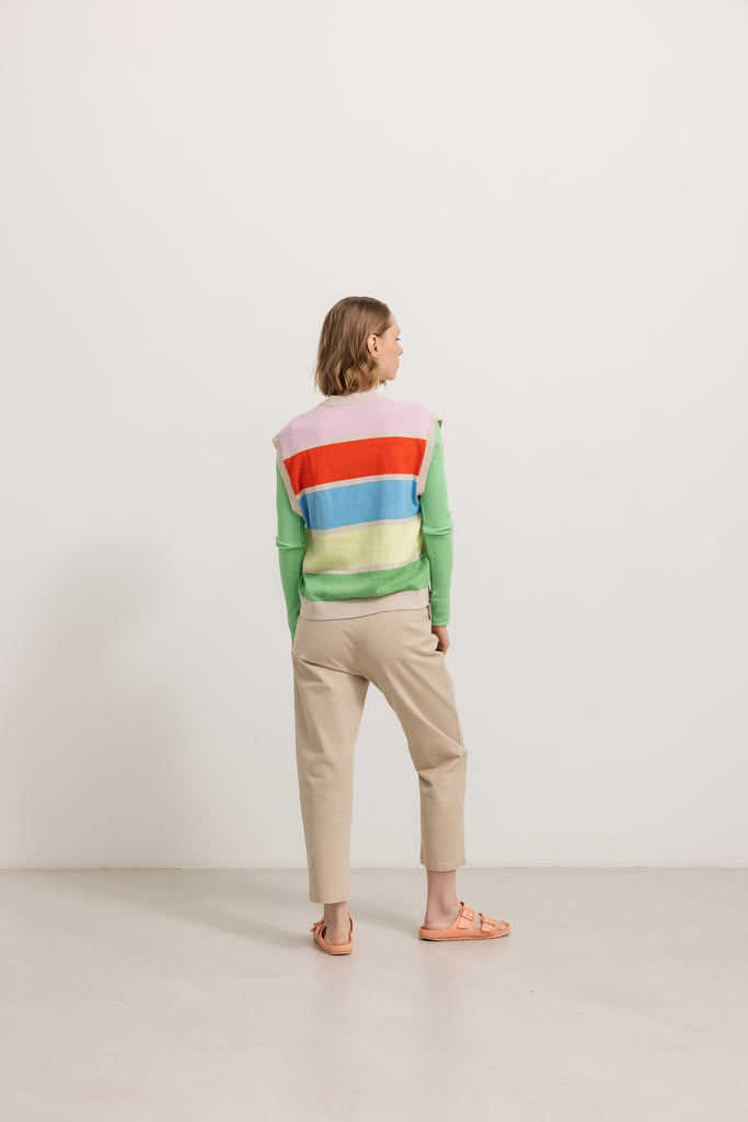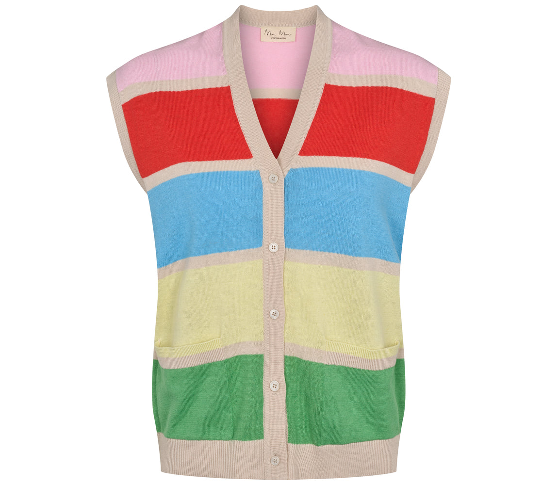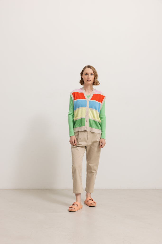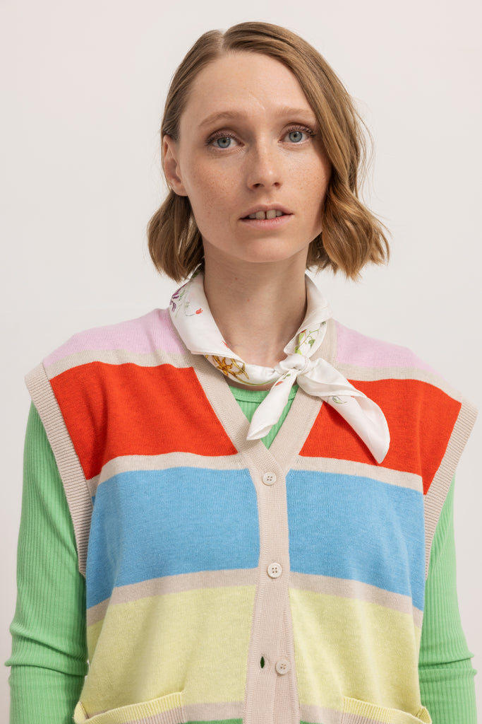 Vest with a v-neck, beautiful rainbow colors and button closure at the front. The vest is in a delicious linen and cotton blend.