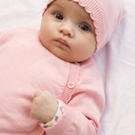 Knitted blouse for the little ones with raglan sleeves and button closure on the left side. The knitted blouse is in a stocking stitch with ribbed edges at the neck, sleeves and bottom, as well as wavy edges. The knitted blouse is comfortable and easy to wear.