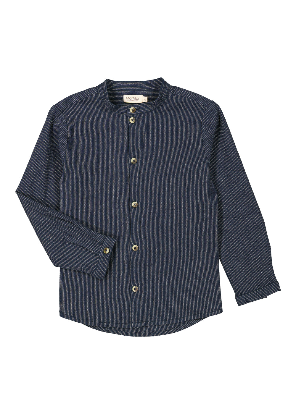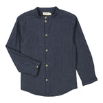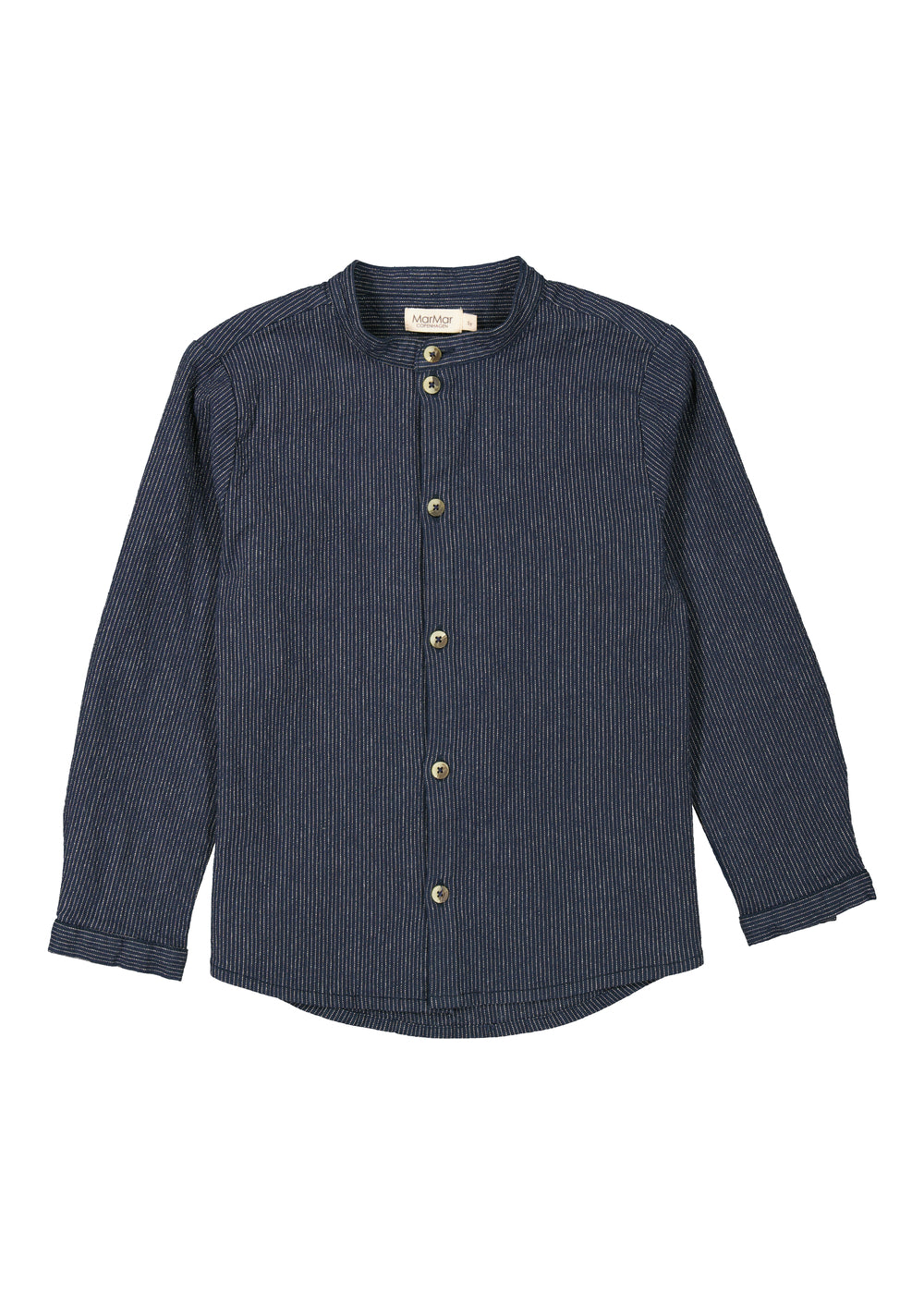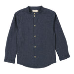 Long-sleeved striped chambray denim shirt with mandarin collar and button closure