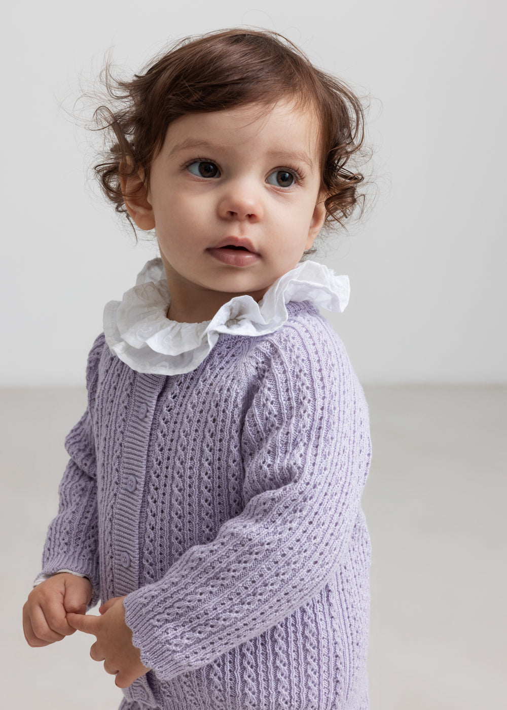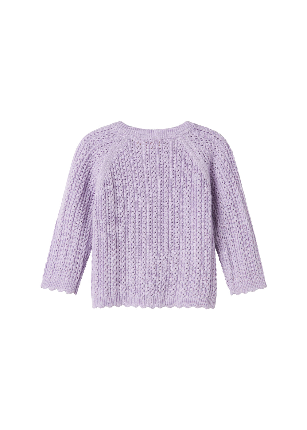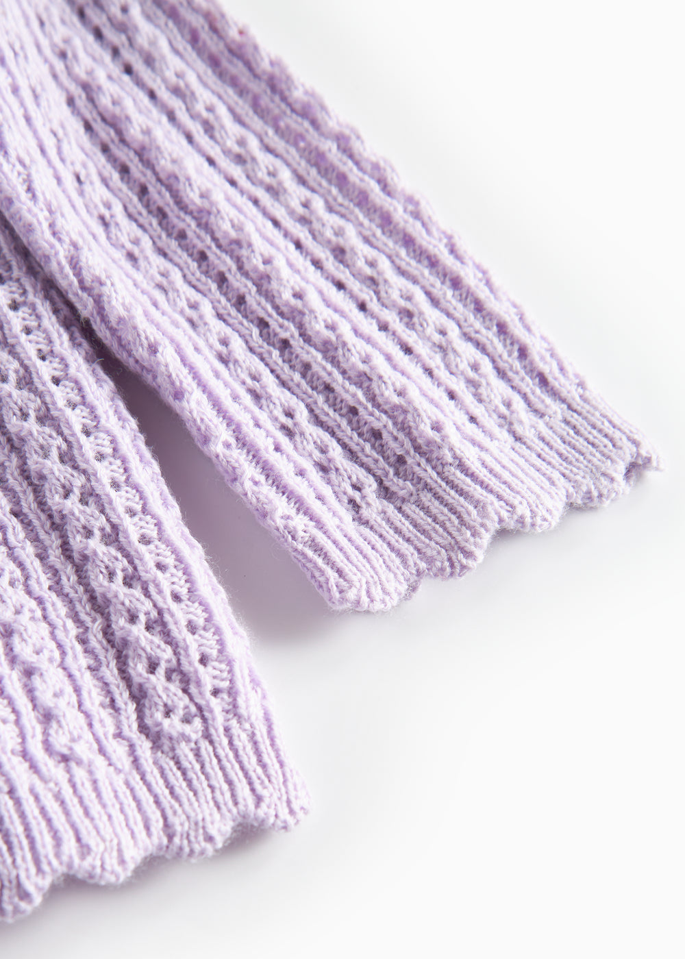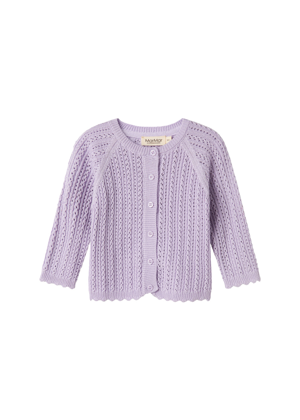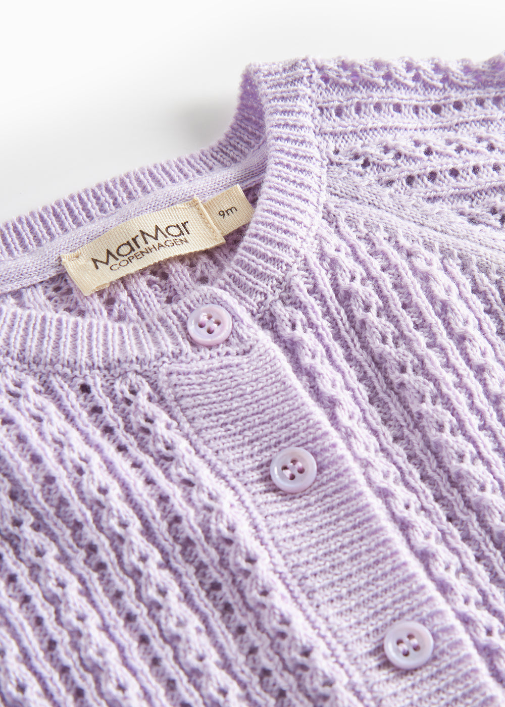 Knitted cardigan with raglan sleeves, fine pointelle/hole pattern details and button closure at the front. The cardigan has a round neck and fine wavy finish at the bottom.
