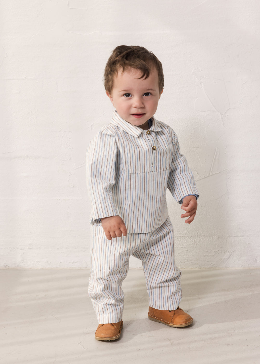 Long-sleeved striped baby shirt with collar and half-front closure with two buttons. The shirt has a roomy and comfortable fit and is soft to wear.