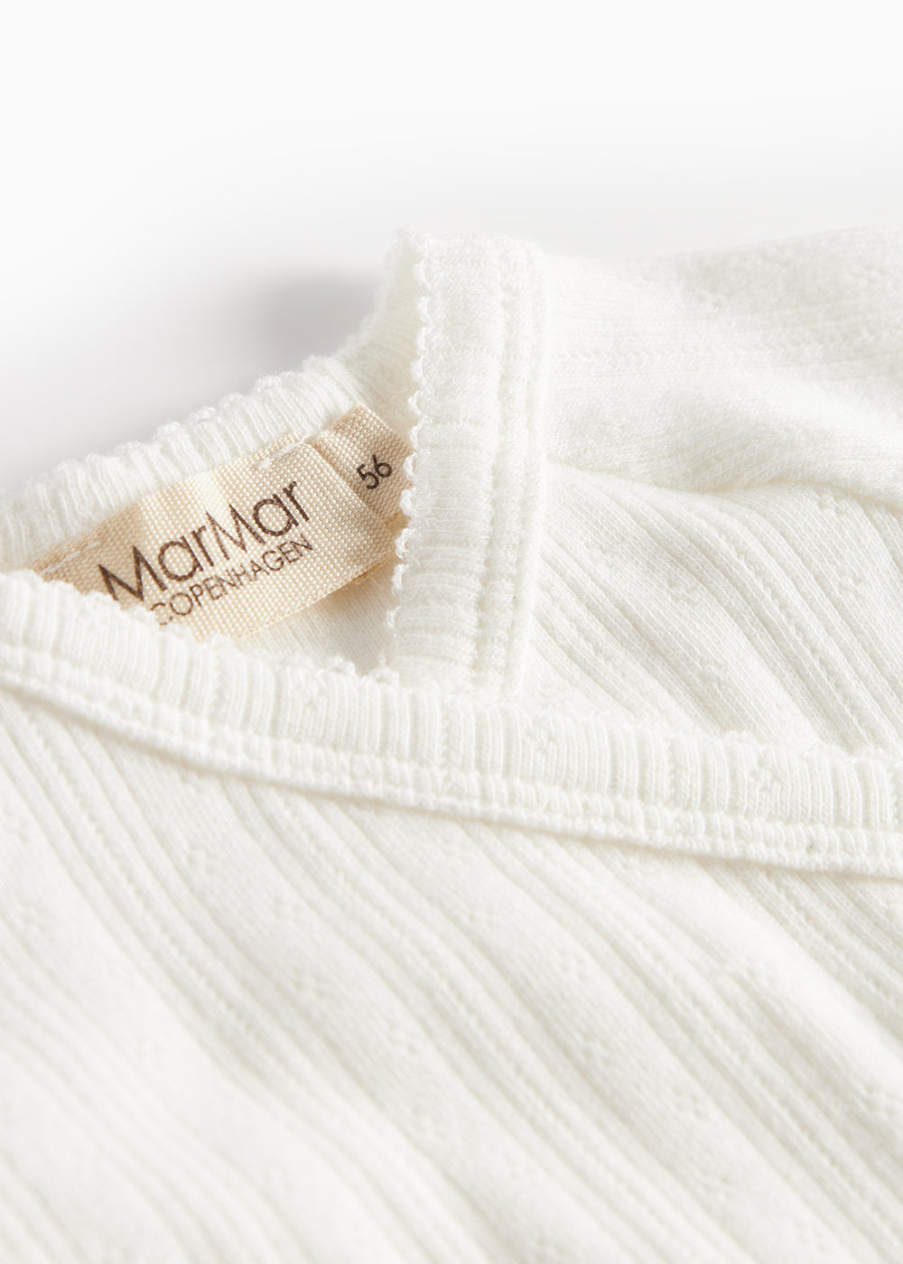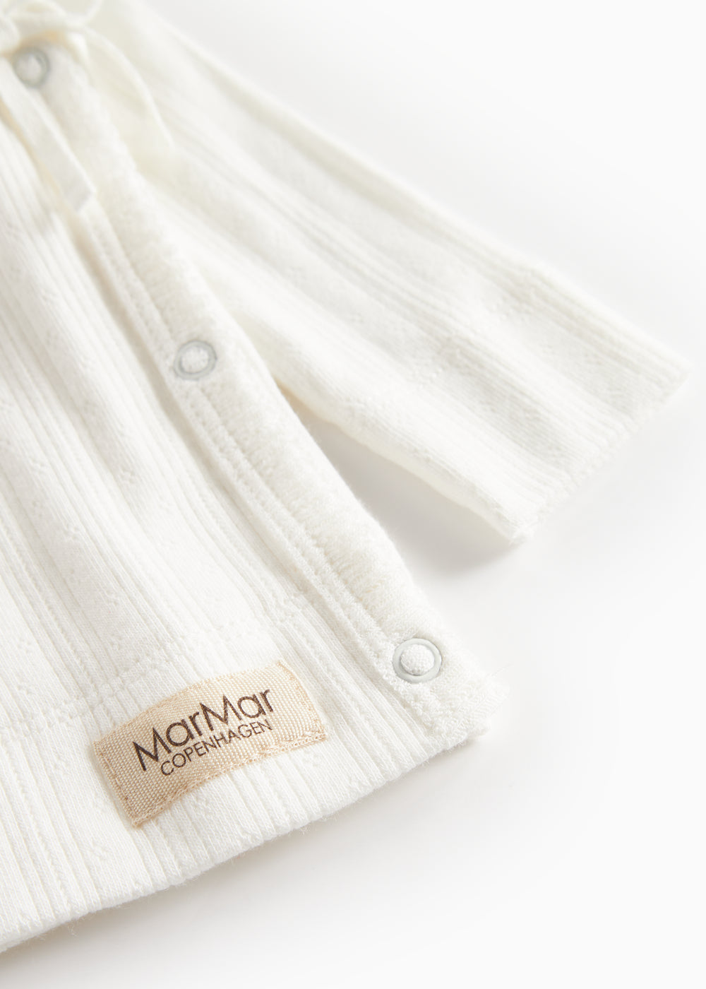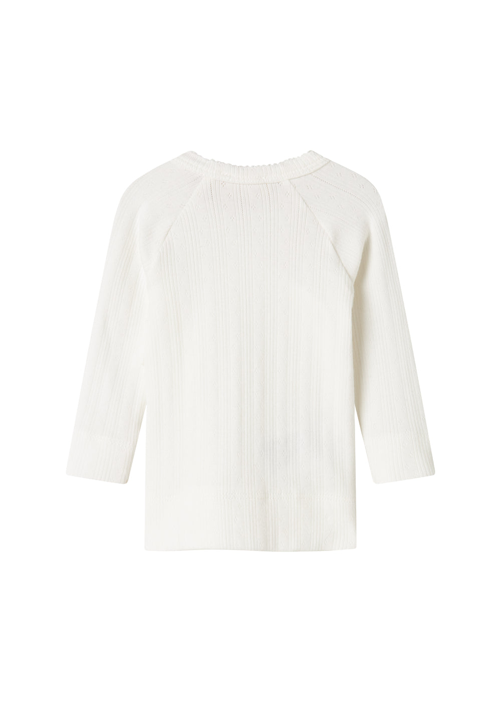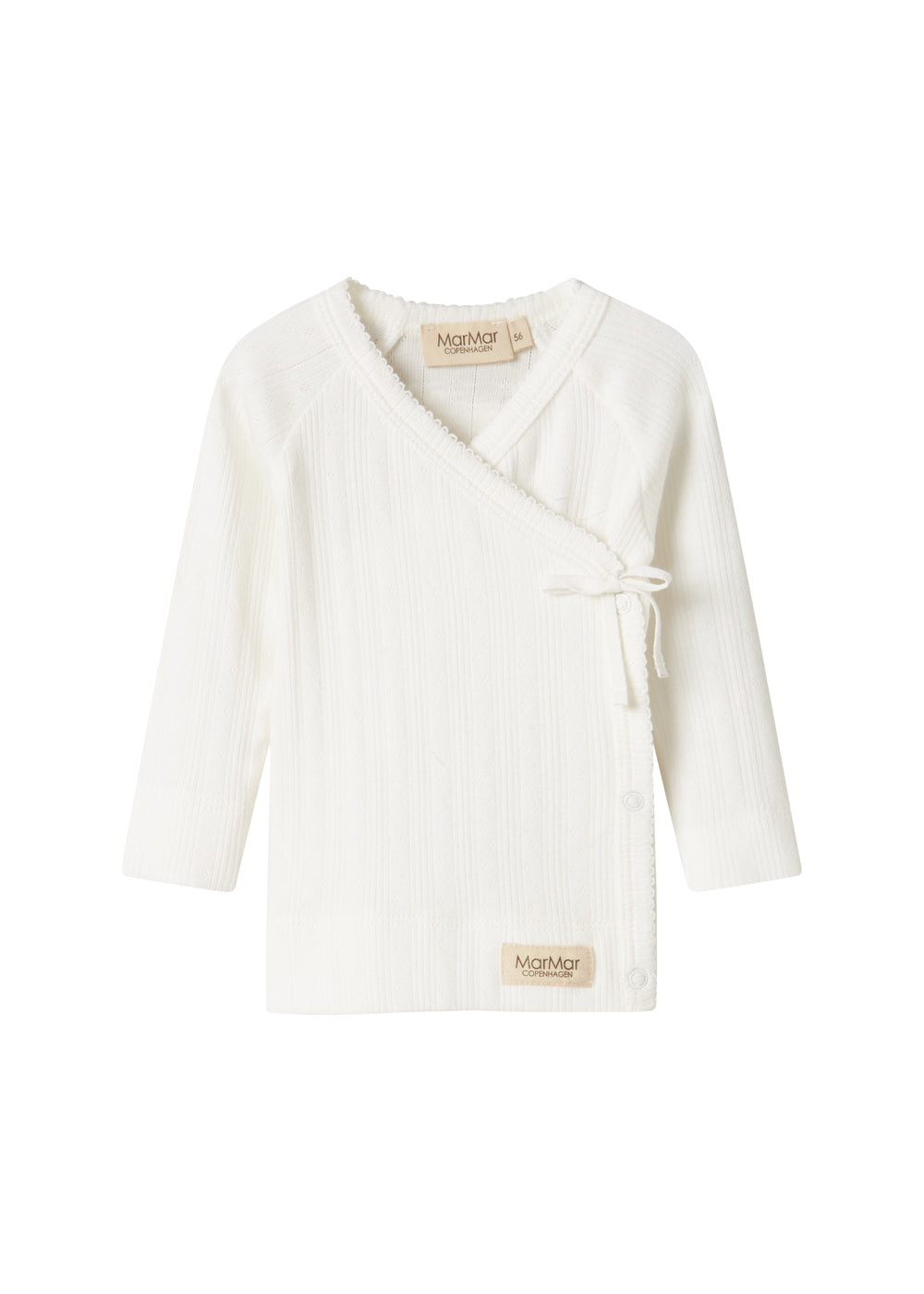 Long-sleeved pointelle blouse for newborns with a wrap-around closure and picot edges. The blouse closes with snaps and ties and is soft, stretchy and comfortable to wear.