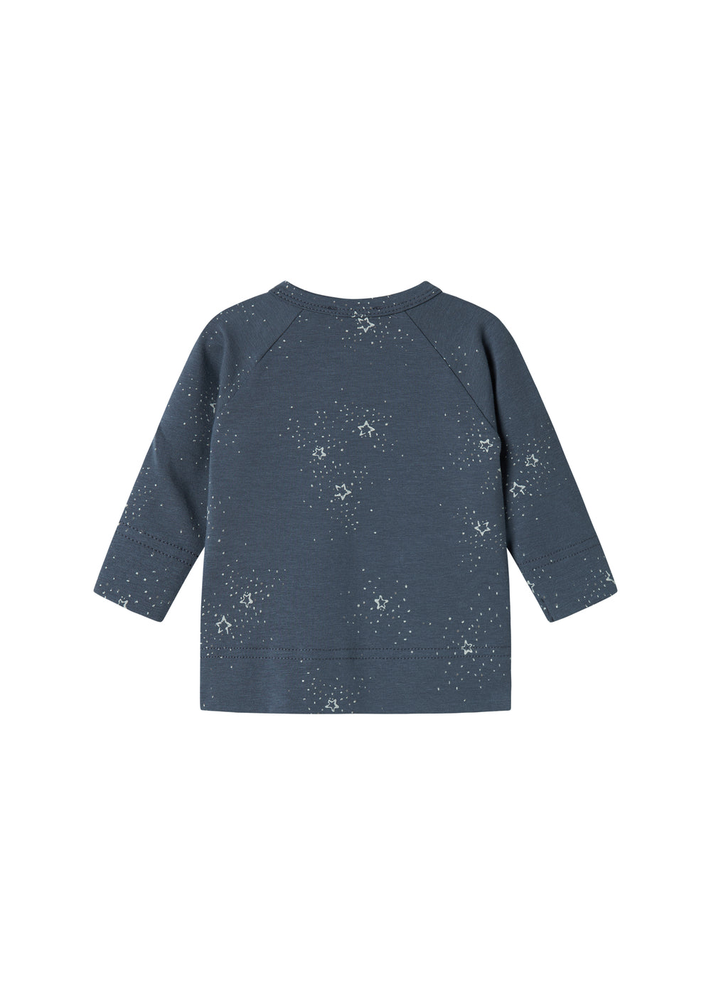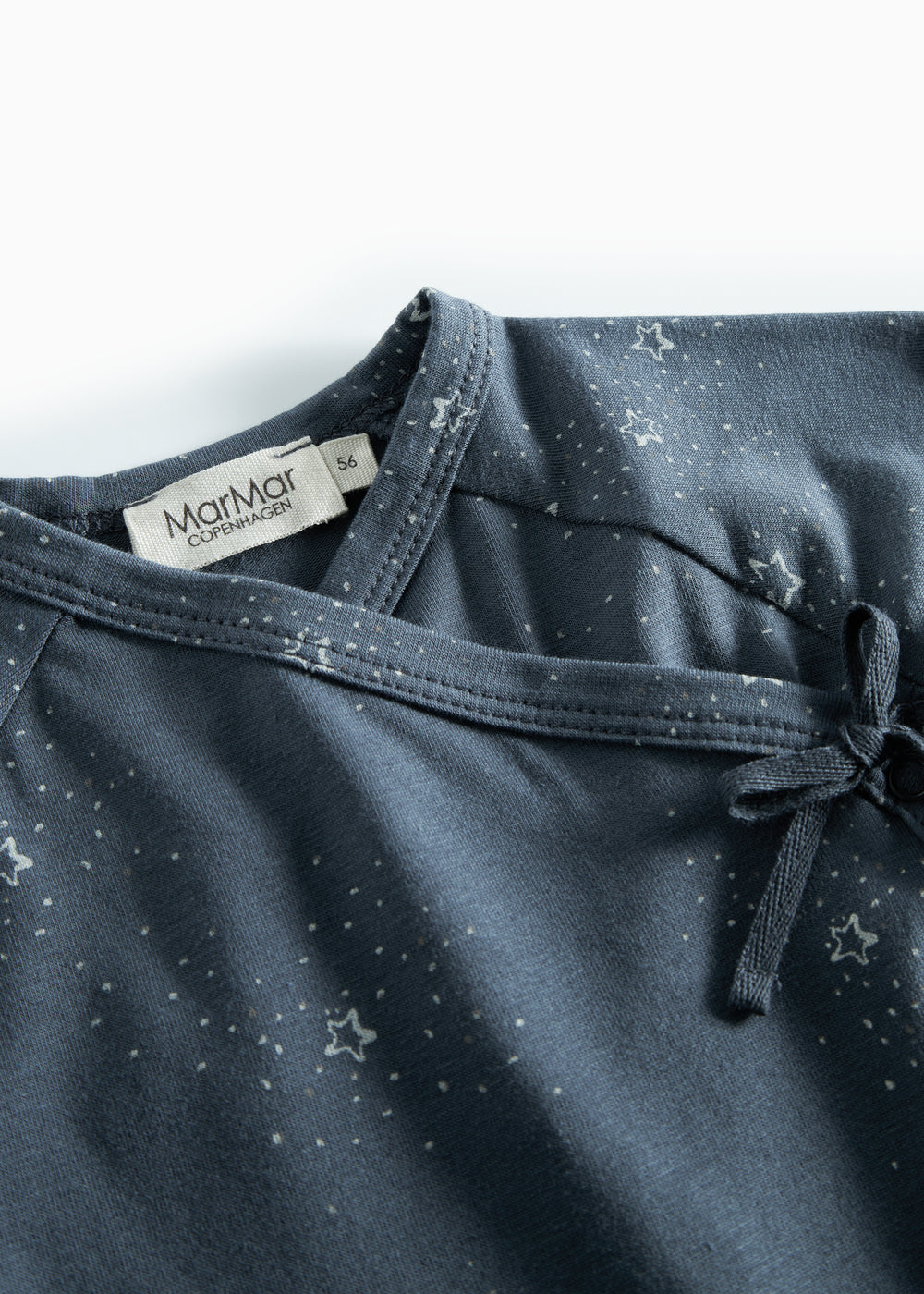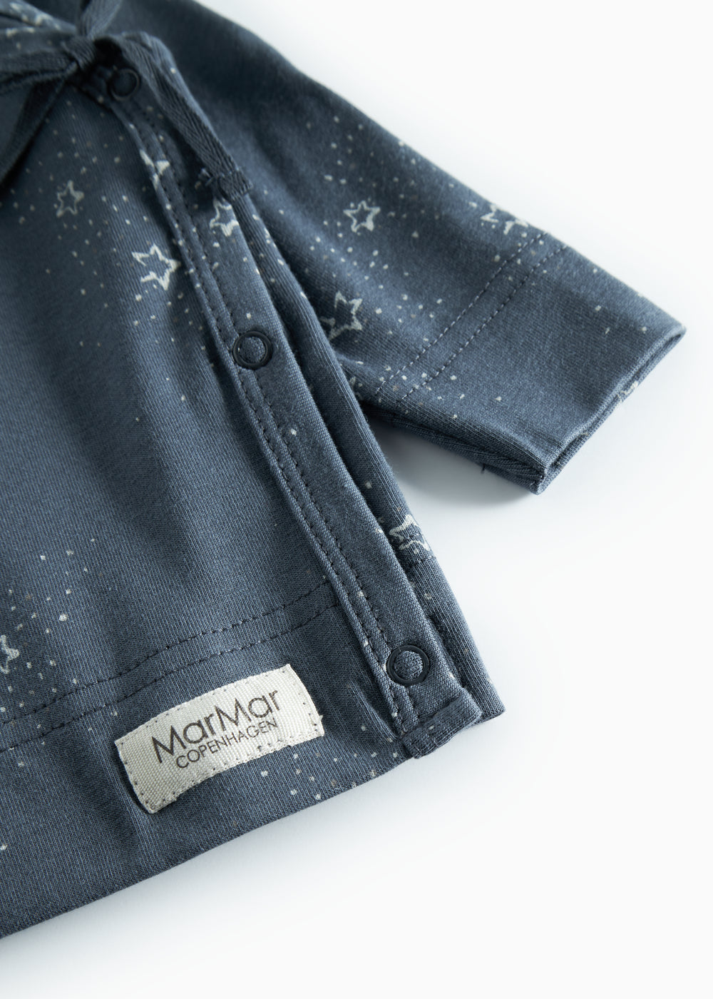 Long-sleeved blouse for newborns with wrap-around closure. The blouse closes with press studs, has a nice print and is both soft, stretchy and comfortable to wear.